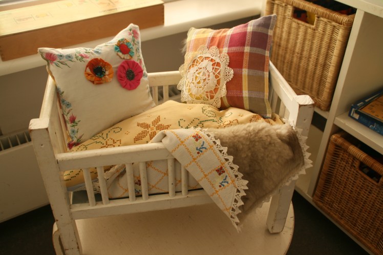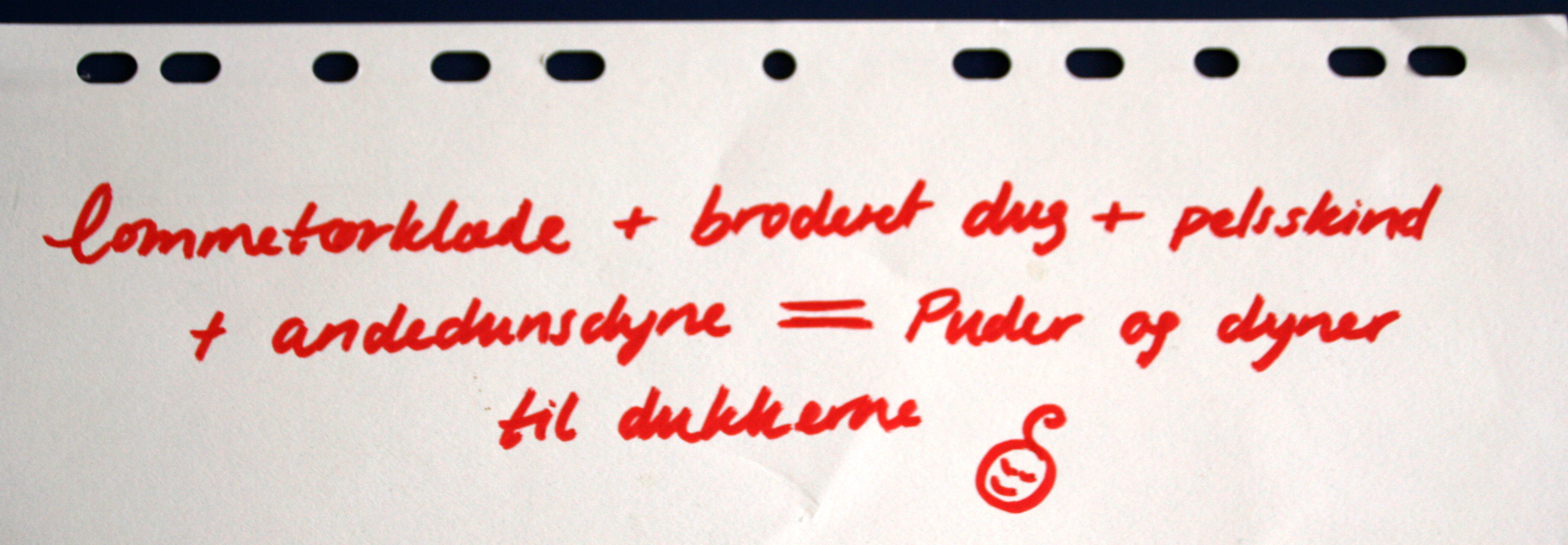 I min datters børnehave ønskede dukkerne sig nogle nye dyner og puder. Børnene tog selv nogle gamle stofrester med og jeg syede nogle puder, tæpper og dyner af disse. Børnene synes, at det var sjovt at se, hvordan en fjerdyne, deres fars plettede skjorte eller mormors gamle dug blev til puder og dyner til dukkerne. Pelsresterne havde børnehaven selv. De gav dukkeudstyret en sanselig dimention samt ekstra komfort til dukkerne.