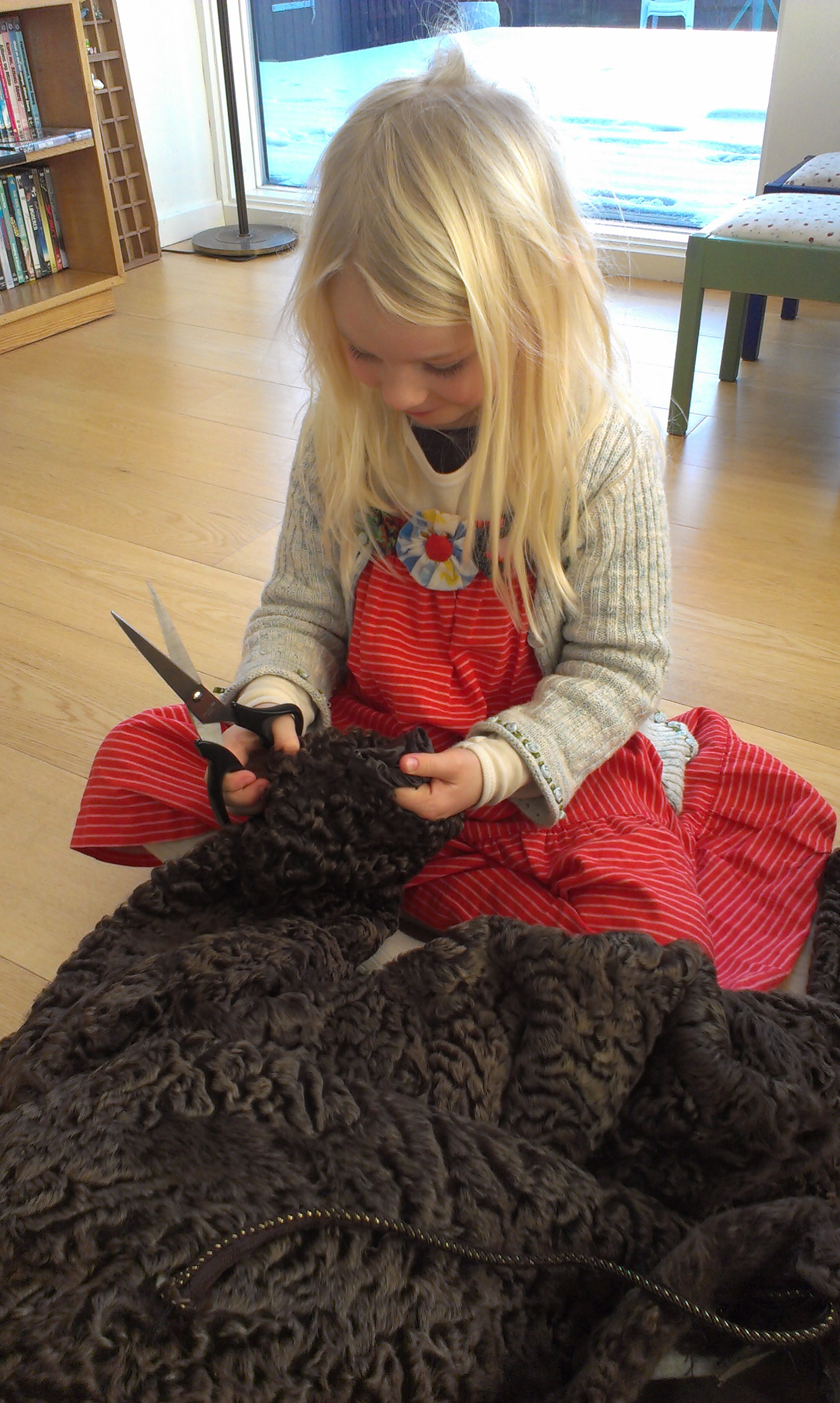 Børnehaven arbejder med æstetik og sanser, og ønsker sig derfor primært kostumer og remedier lavet af naturlige materialer, såsom bomuld, uld, silke, hør.. og pels. Derfor har jeg fundet en brugt lammepels, som var sat ned til 100 kr. i min lokale genbrugsbutik ‘Igen’ på Sorgenfri Torv.
