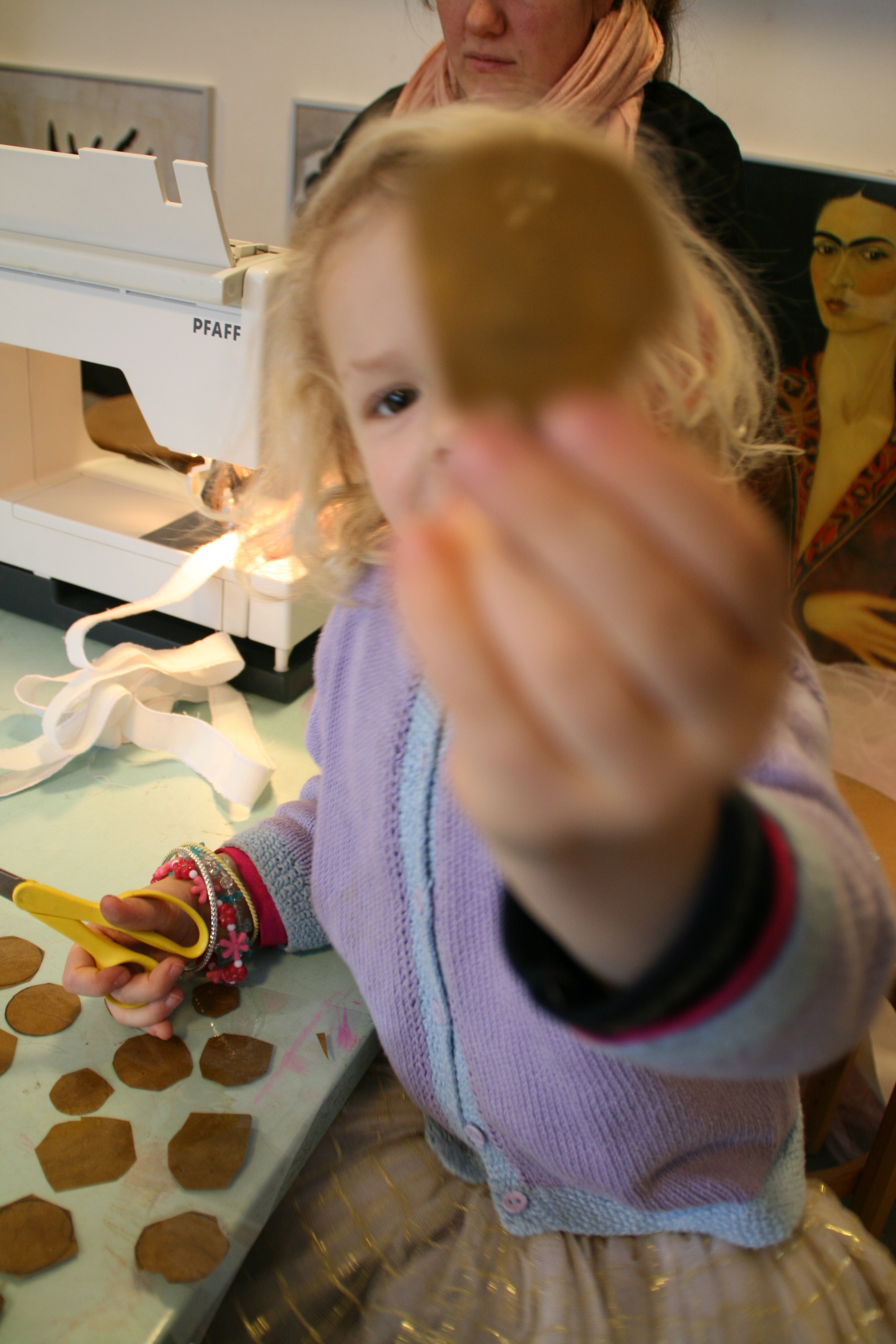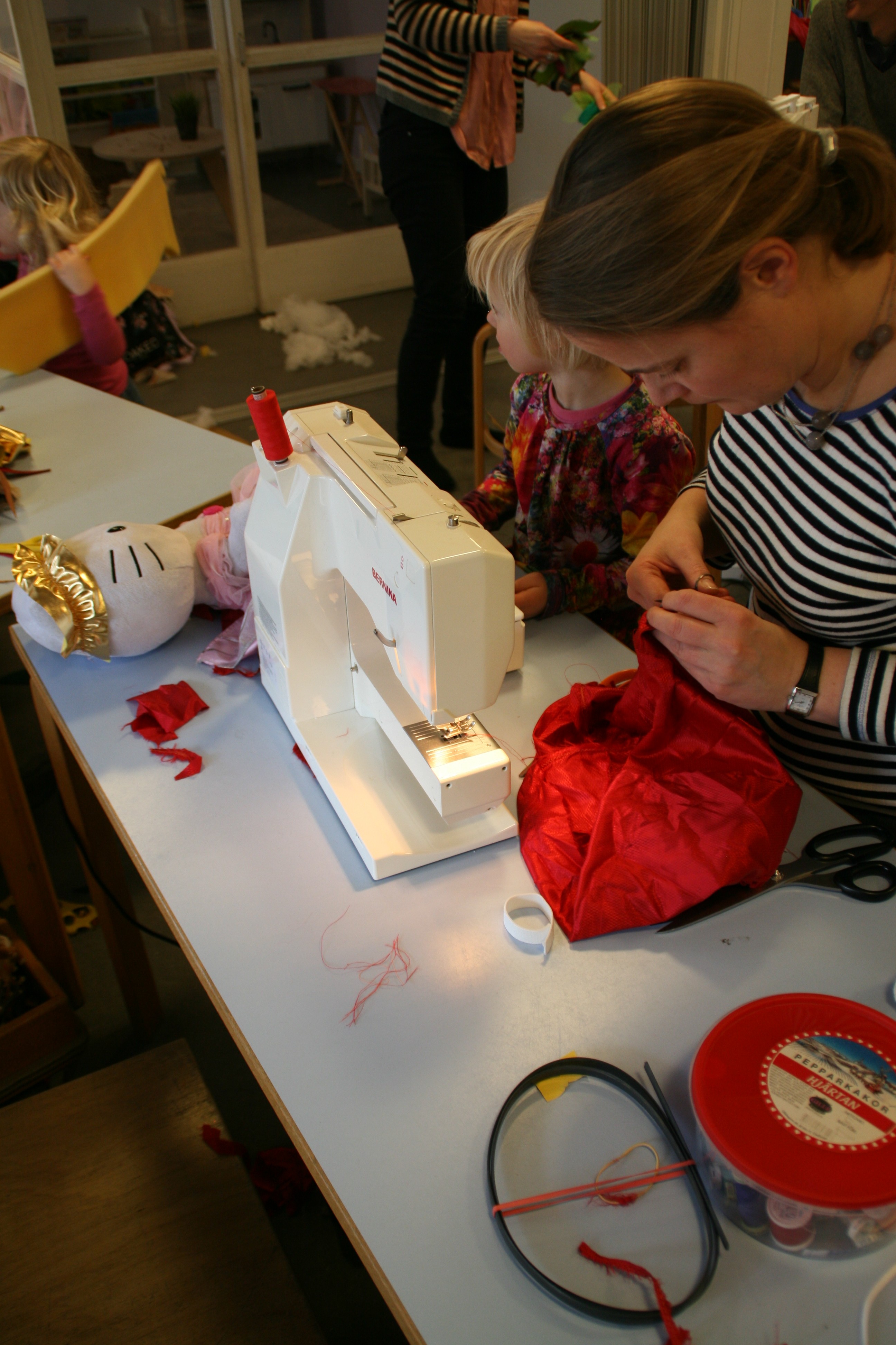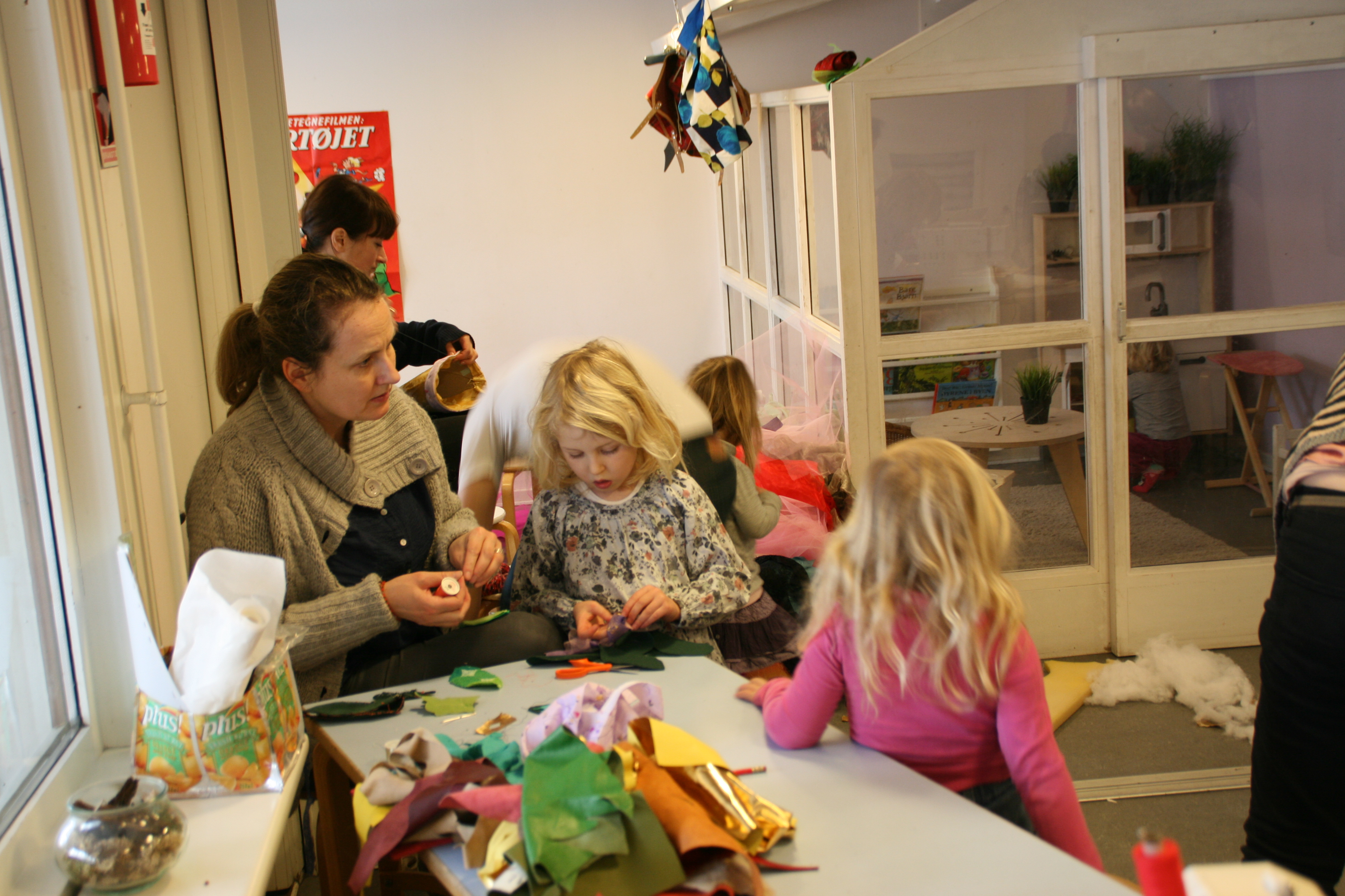 Her er (langt om længe) et par billeder fra den eventyrlige genbrugsworkshop i min datters børnehave, hvor både børn og deres forældre deltog i at lave kostumer og remedier til børnehavens tema om eventyret ‘Fyrtøjet’. Af materialer blev der brugt medbragte gardiner, tøj, lammepelse og stofrester og meget meget andet.