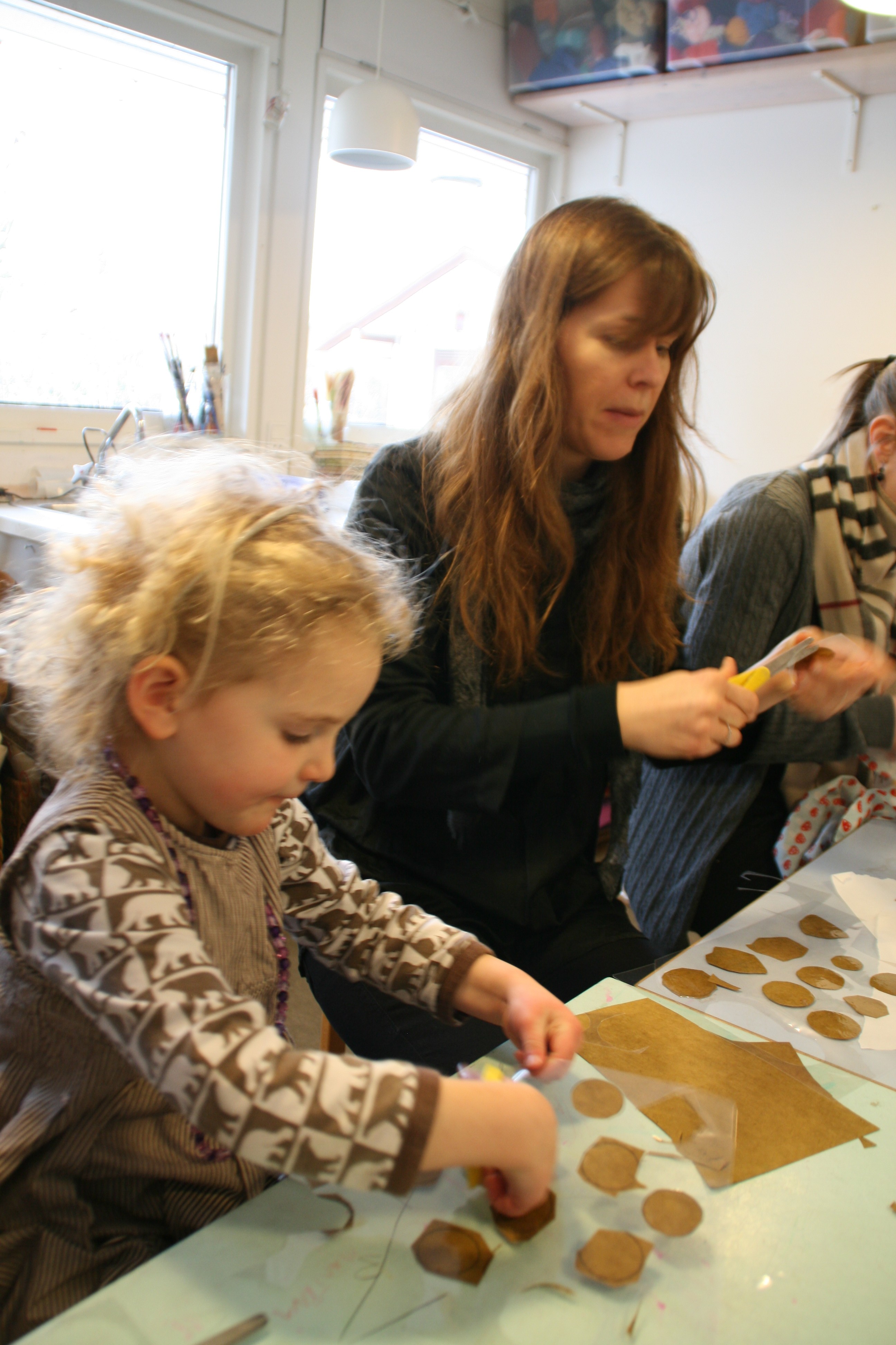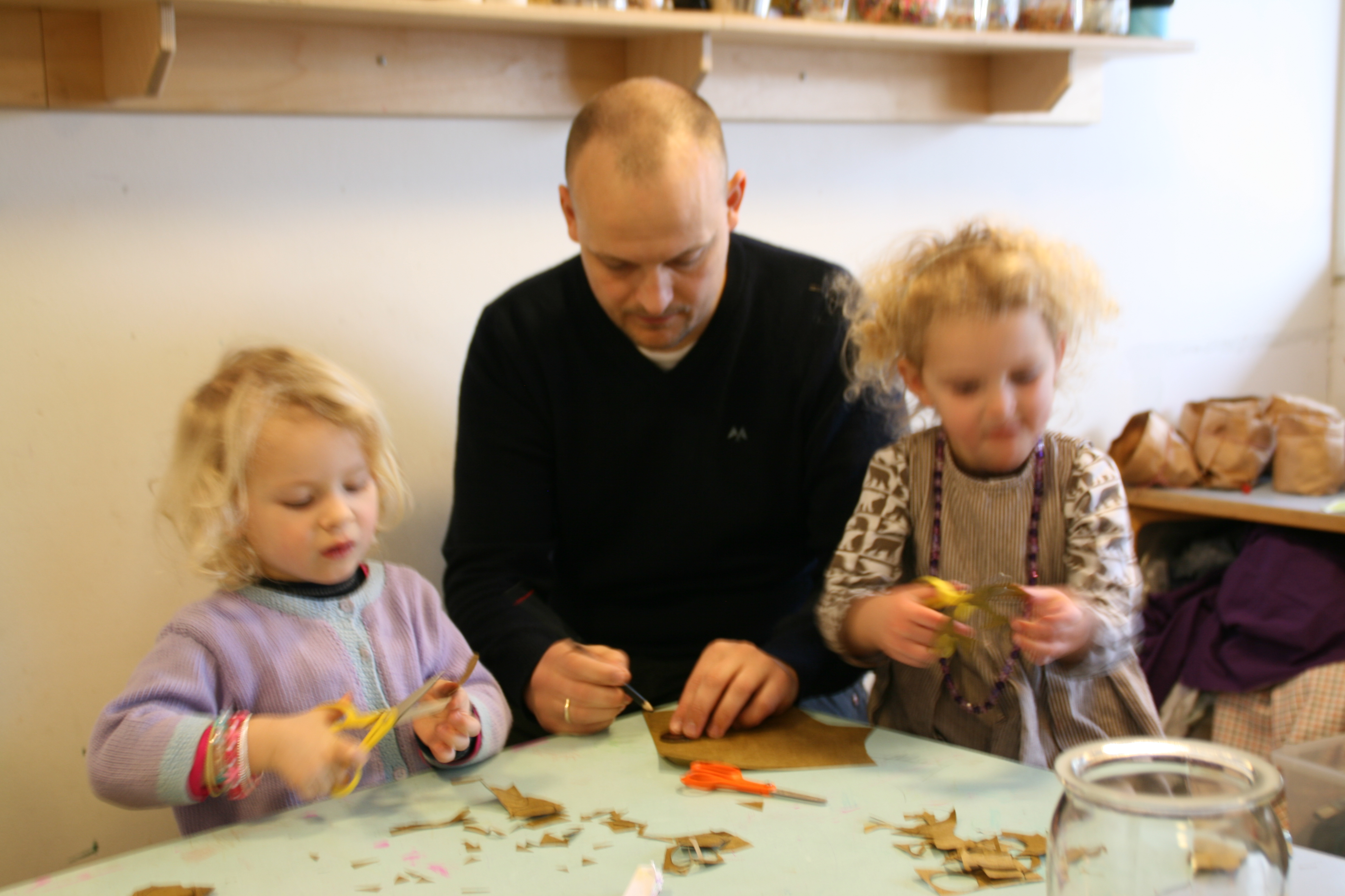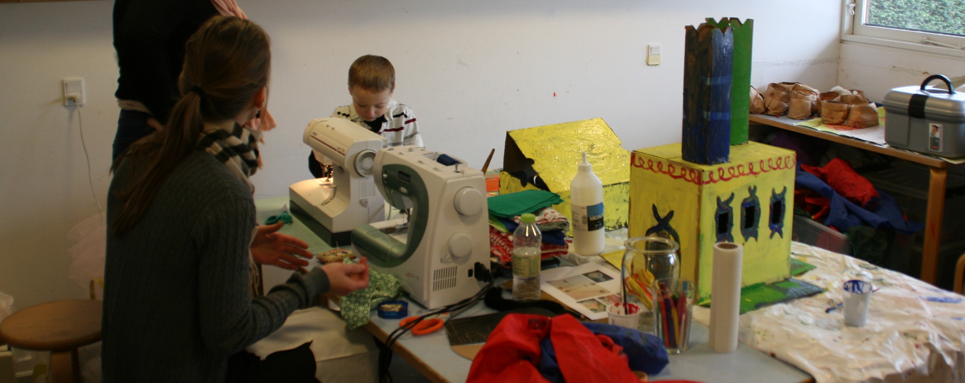 Her er (langt om længe) et par billeder fra den eventyrlige genbrugsworkshop i min datters børnehave, hvor både børn og deres forældre deltog i at lave kostumer og remedier til børnehavens tema om eventyret ‘Fyrtøjet’. Af materialer blev der brugt medbragte gardiner, tøj, lammepelse og stofrester og meget meget andet.