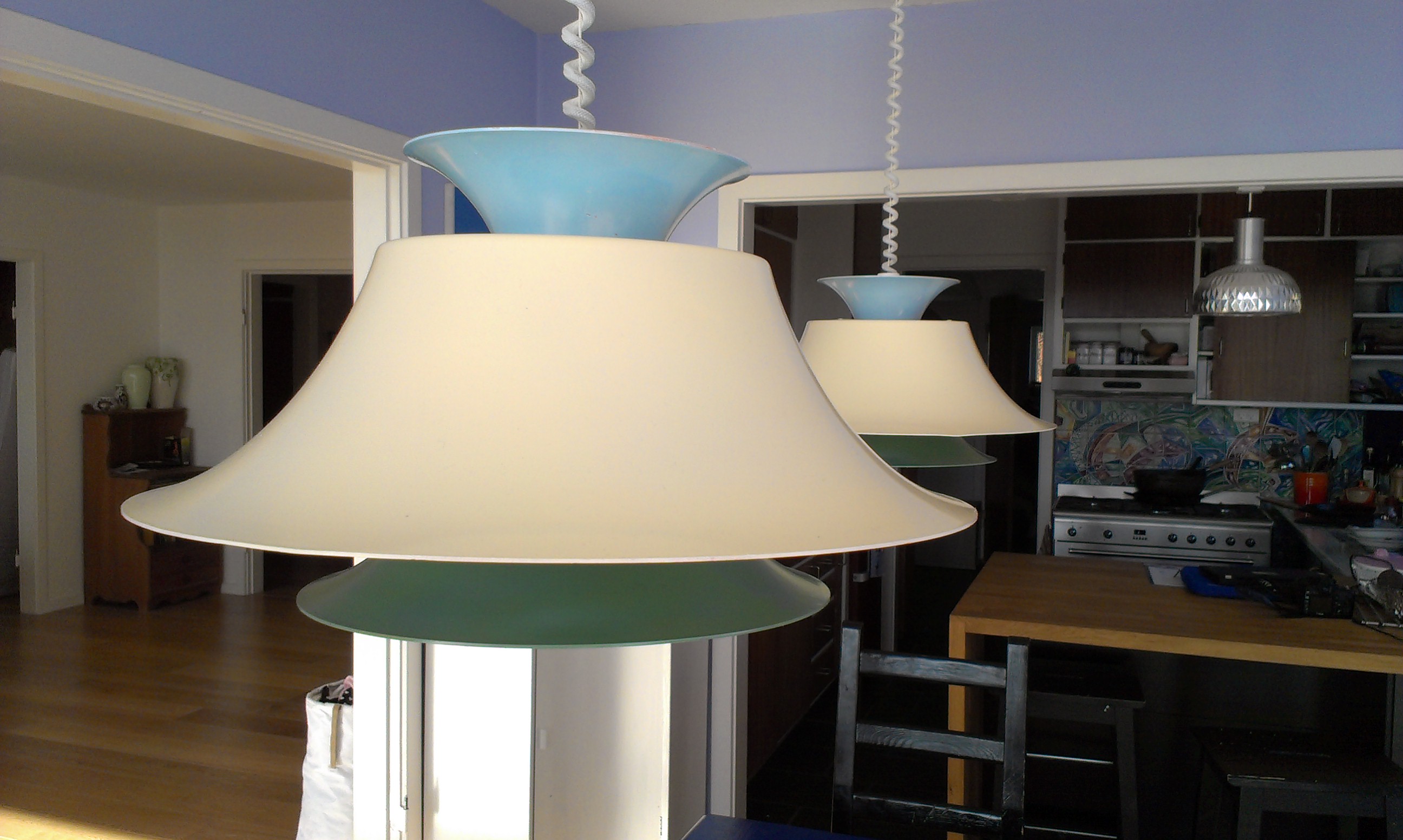 Lamperne, som tidligere var orange, har jeg haft i mange år. Jeg har altid været vild med deres form, men farven passede ikke godt i stuen, som er blå. Jeg fandt derfor spraymalingen frem, for at give dem et nyt look…