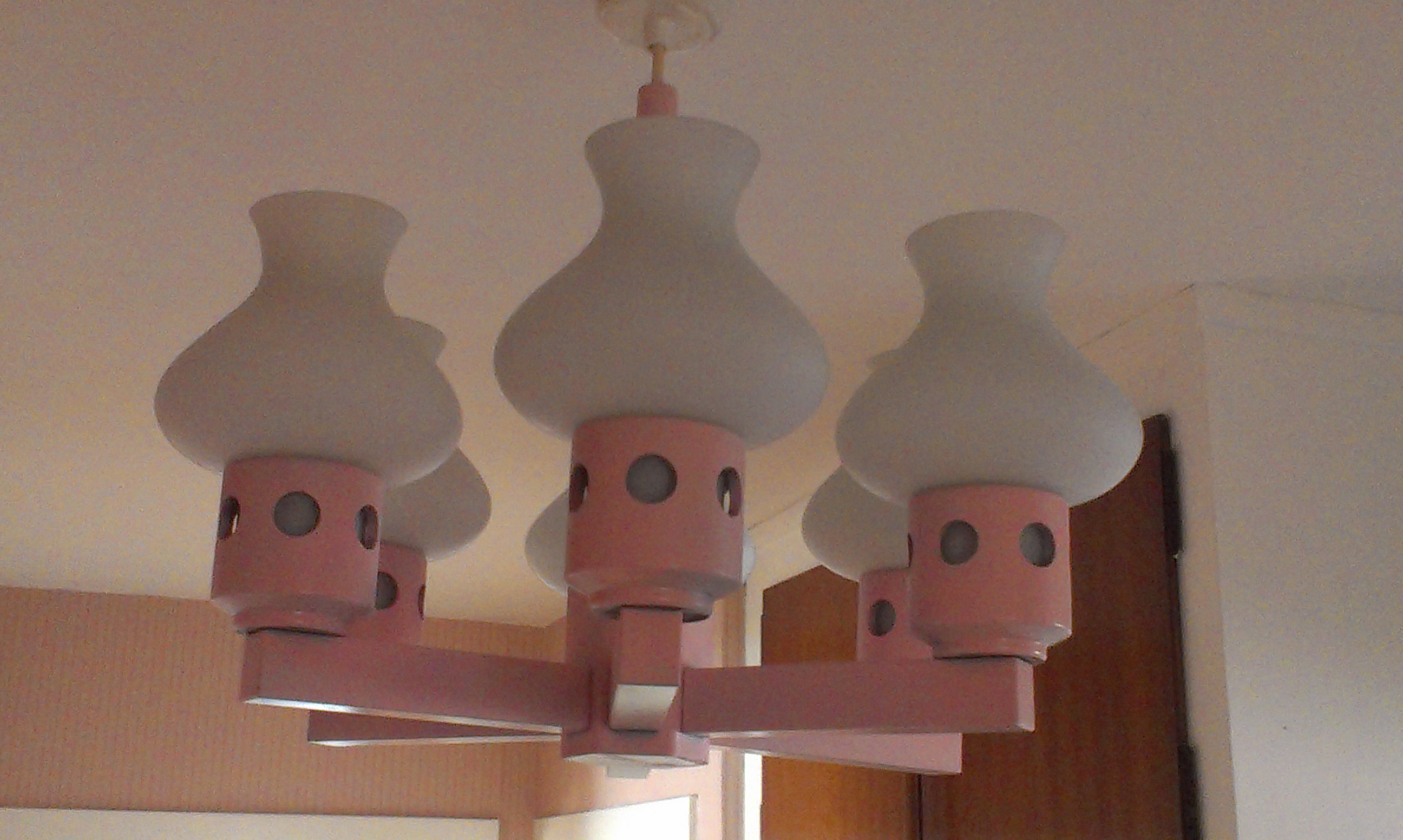 Se denne lampe med glasskærme, som tidliger var i larkeret træ.