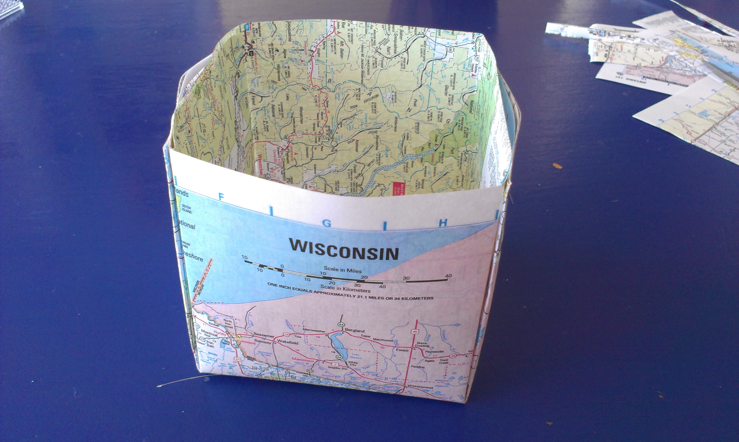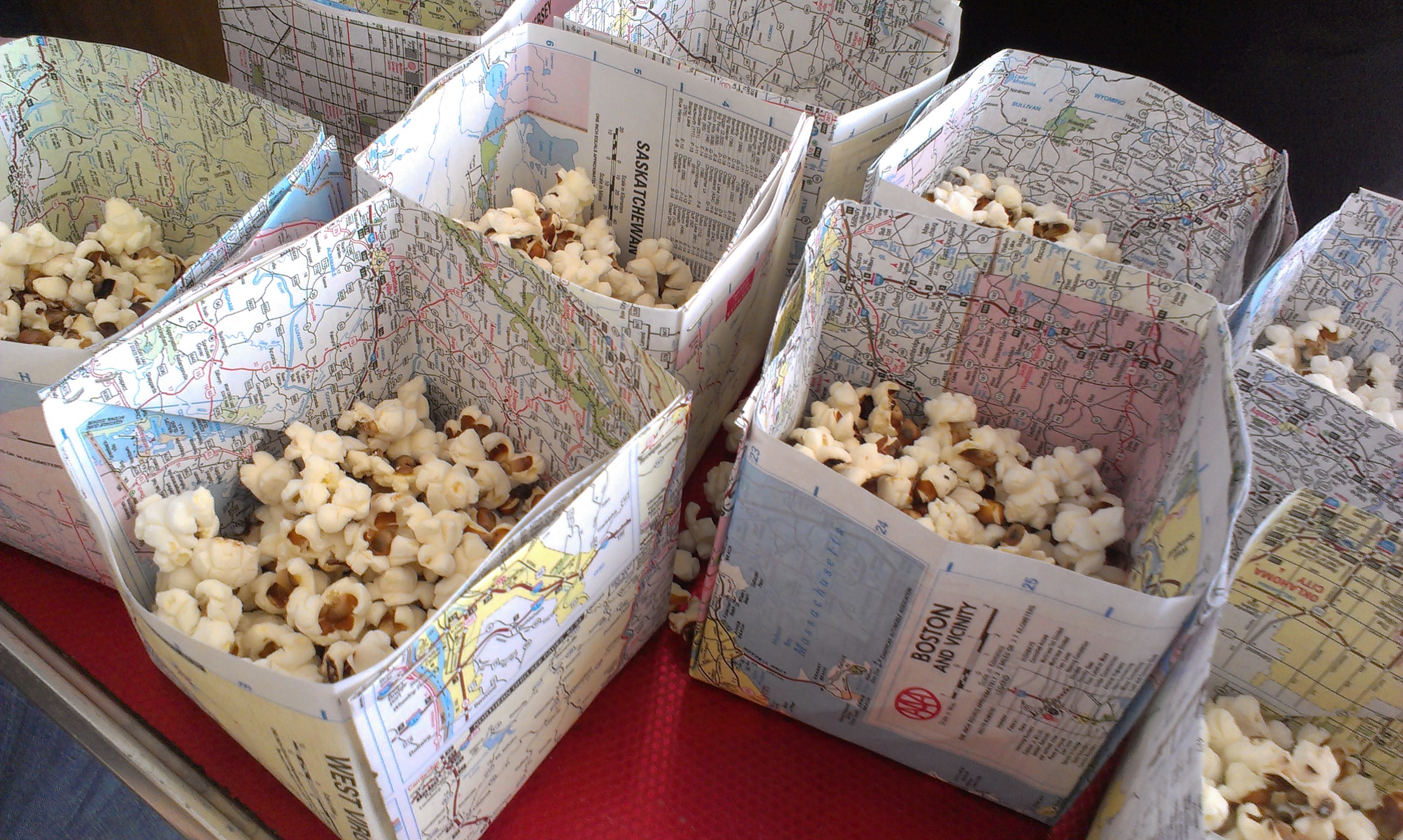 Til popcornene havde jeg lavet nogle rigtig fede bæger (hvis jeg selv skal sige det) ud af et atlas over USA, som min mand ville smide ud, men som jeg alligevel har gemt.