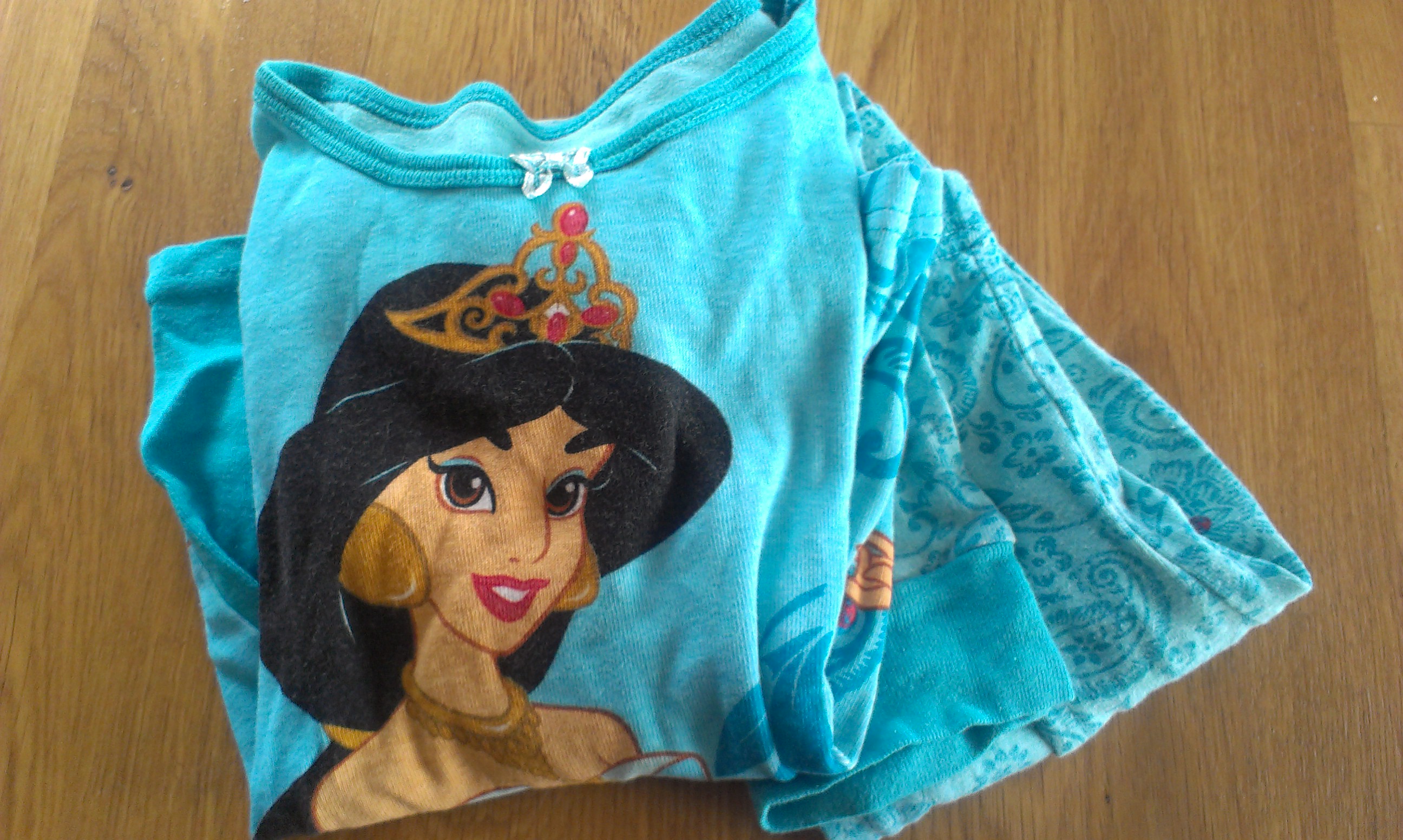 Af sin søster fik hun dette sæt nattøj, som storesøster selv er vokset ud af.