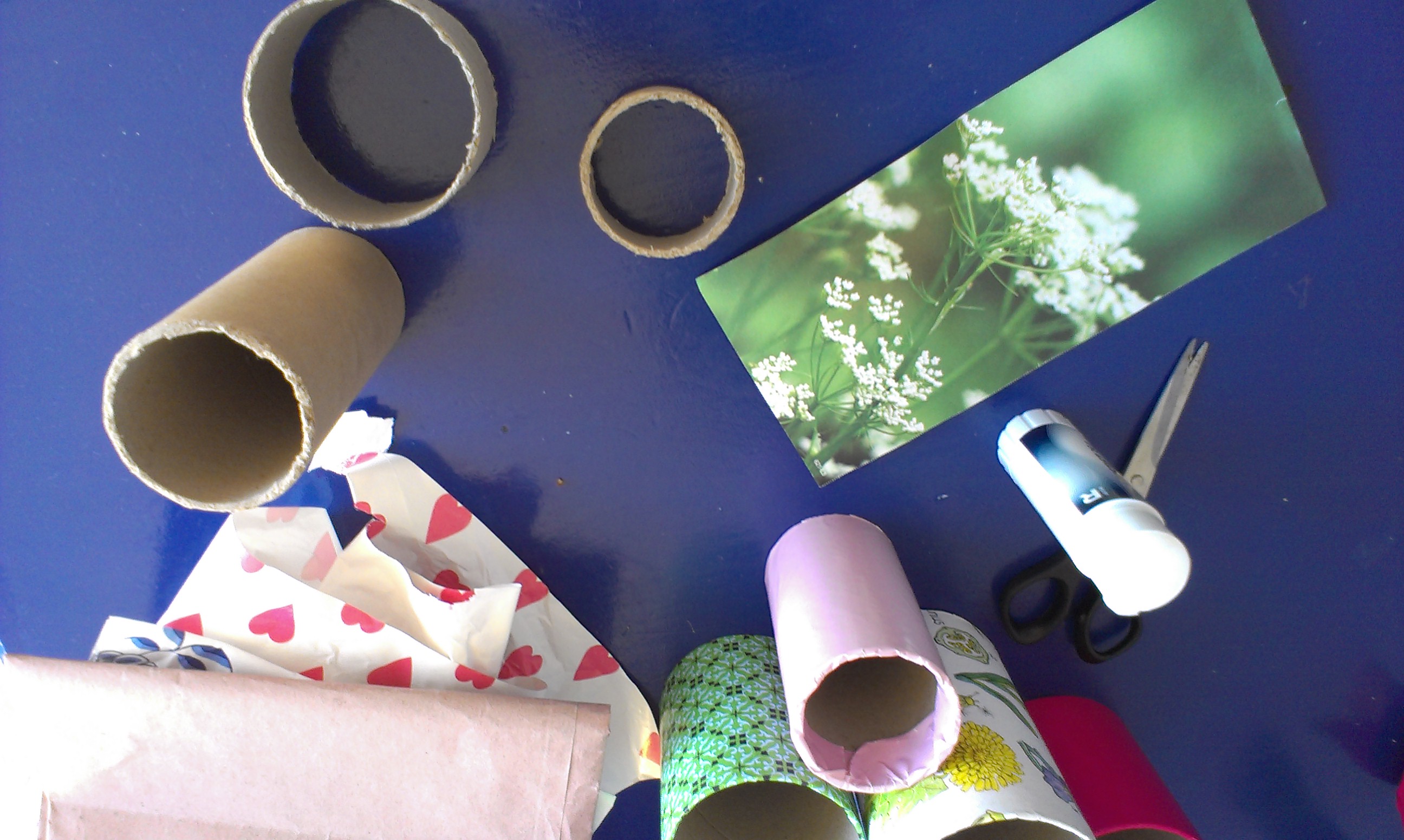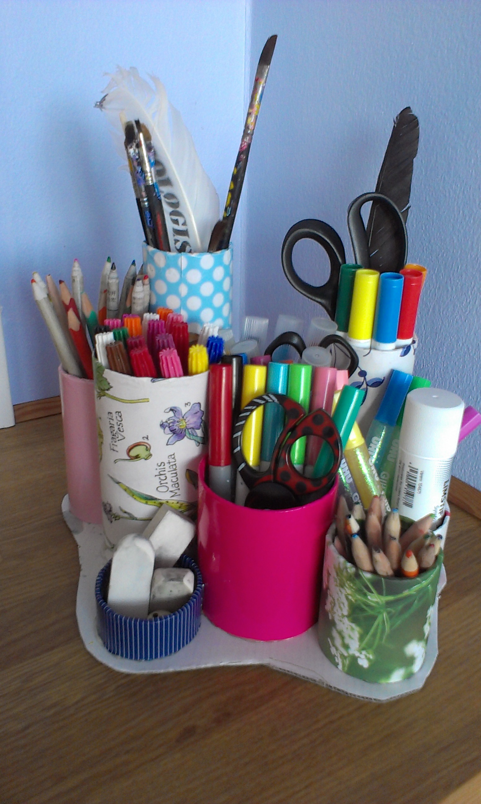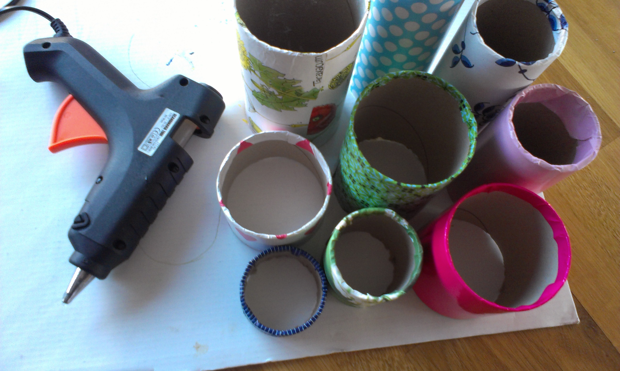 Hvis du for eksempel ligger inde med nogle paprør i forskellige størrelser, kan du bygge en ‘Krea-station’ til tusser, farveblyanter, sakse m.m. og dekorere paprørene med rester af gavepapir.