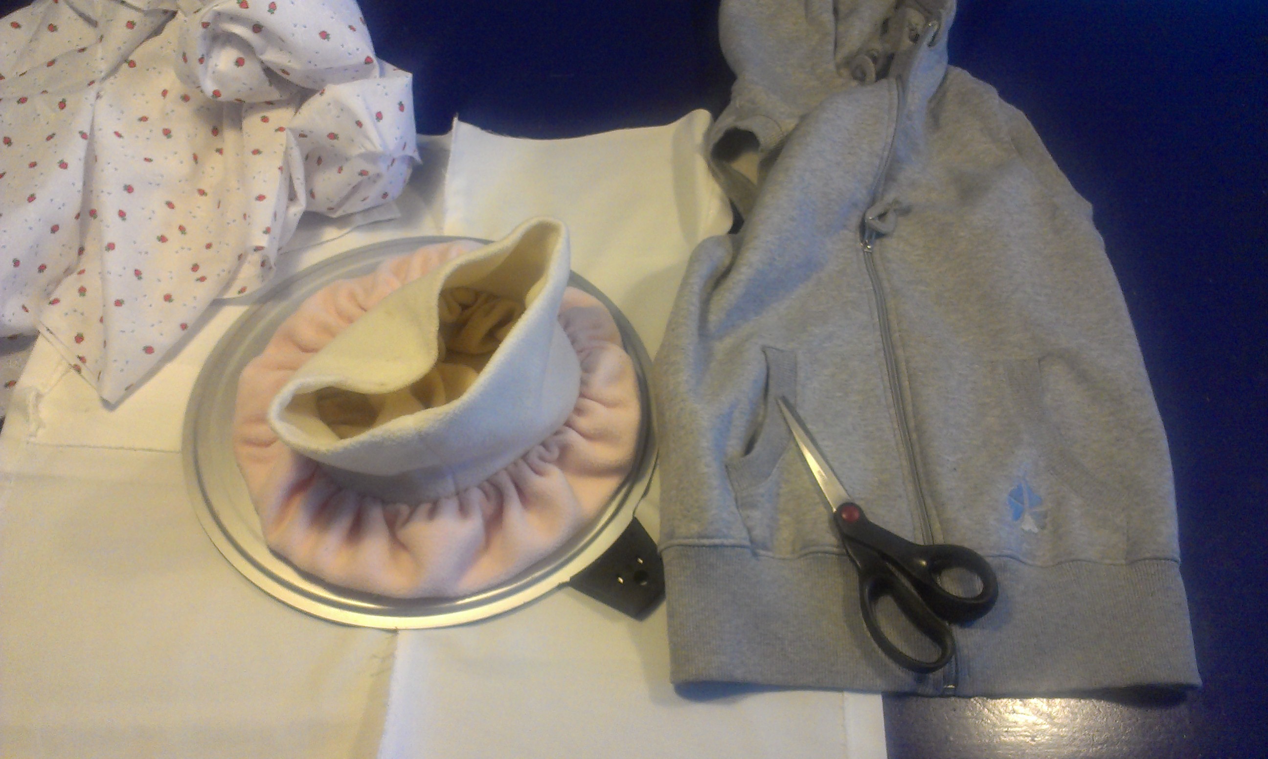 Foruden genbrugsfundene lavede jeg en kokkehue af en aflagt hættetrøje, en halv nederdel og noget stof med jordbærprint. Så nu er pigernes veninde klar til at være med i køkkenet.