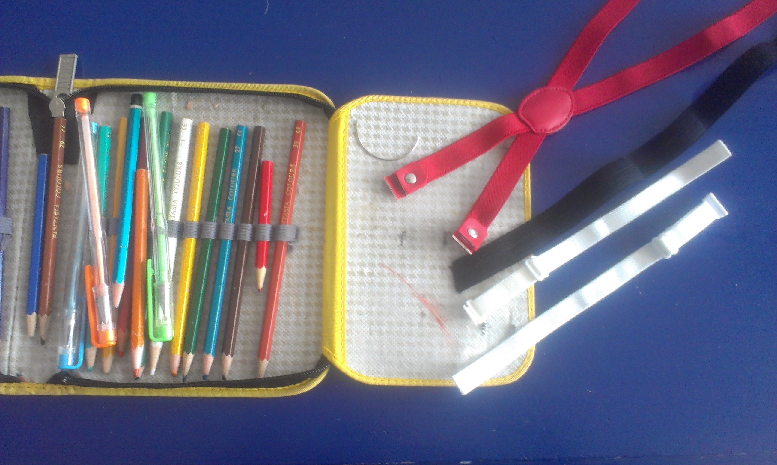 Vi fandt forskellige elastikbånd frem og valgte at reparere pennalhuset med elastikken fra et par gamle seler.