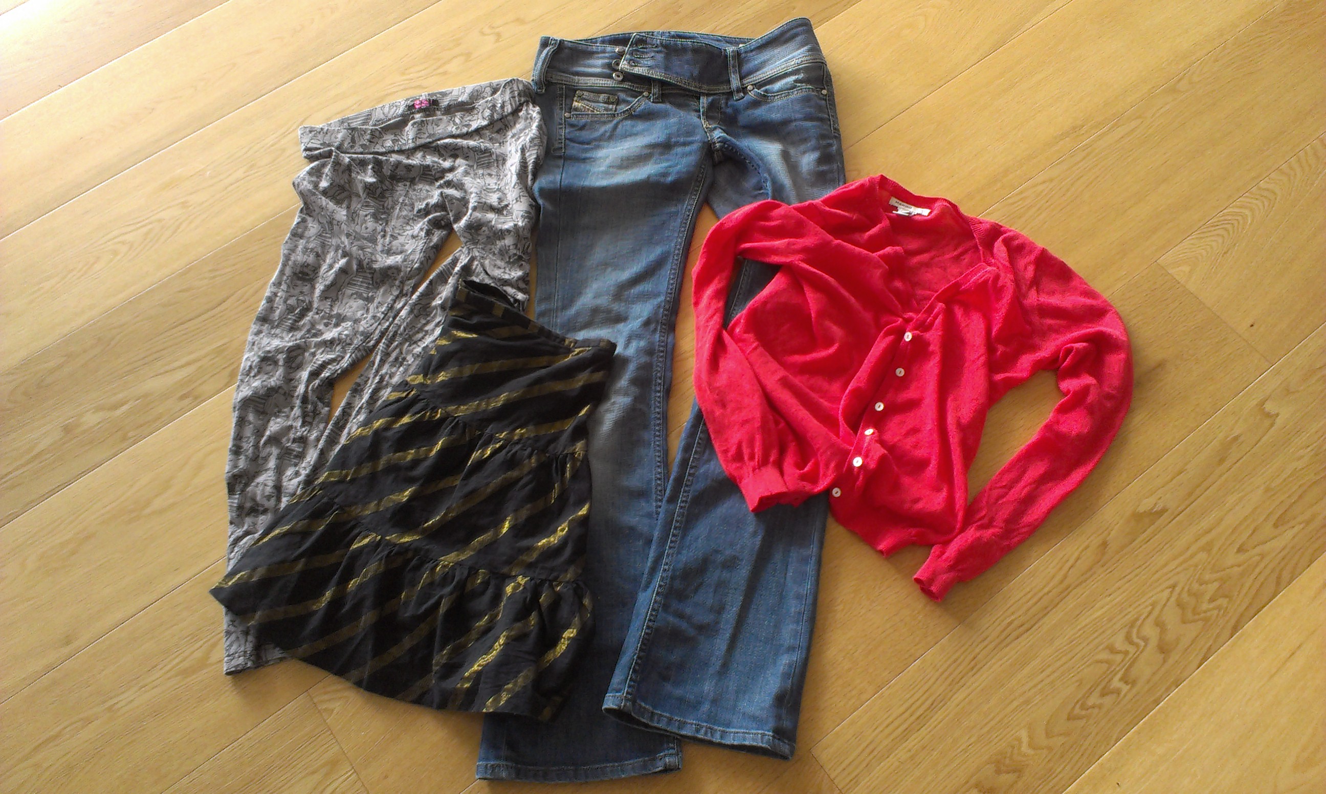 Selv fik jeg et par cowboybukser, en cardigan, en nederdel (som viste sig at være lidt lille, men som kan blive til en sød vinterkjole til min yngste), en kjole og et par leggins.