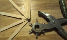 Først gøres ispindene våde, så træet ikke knækker og der laves et hul i den ene ende af hver ispind med en bæltehuller (brug det mindste hul).