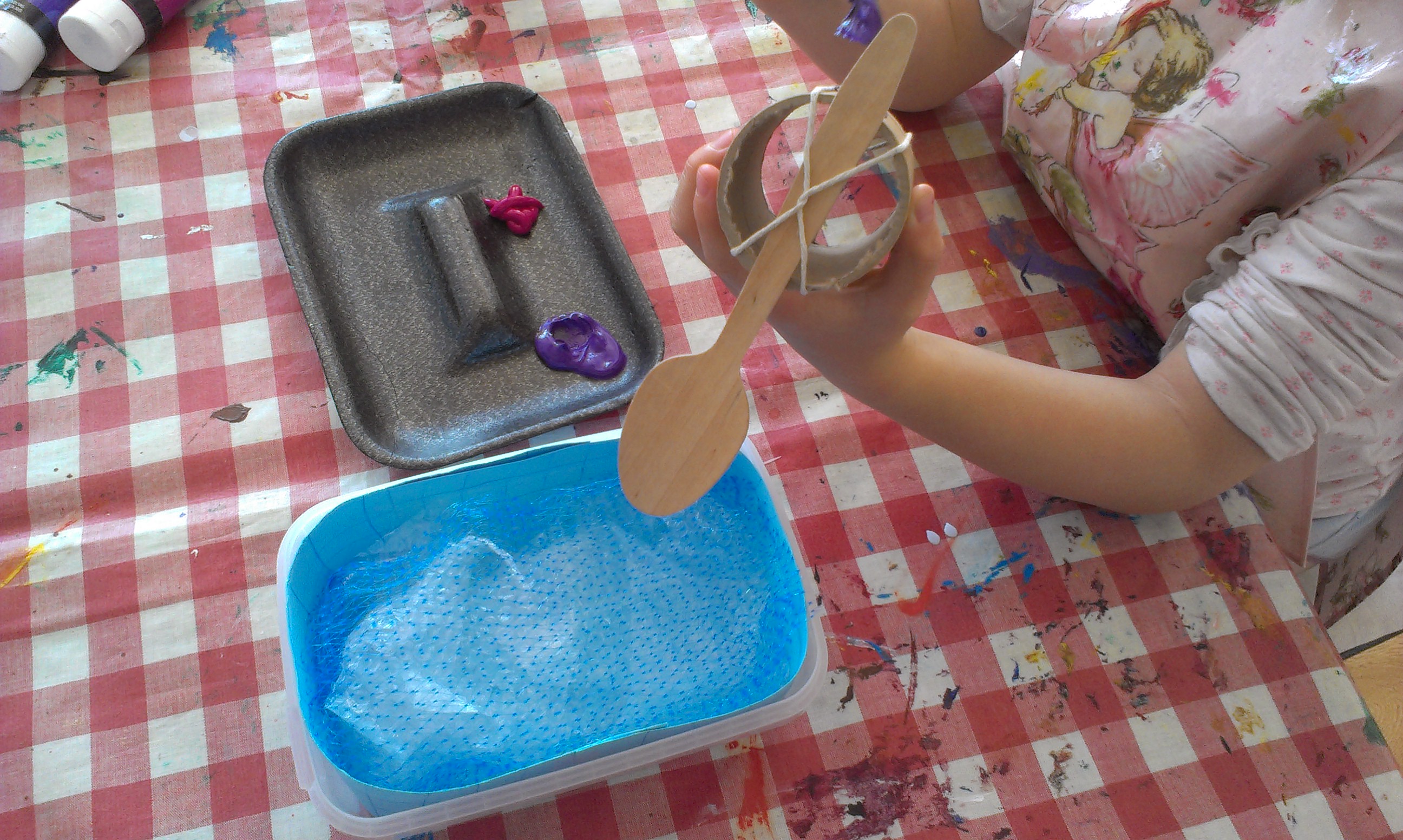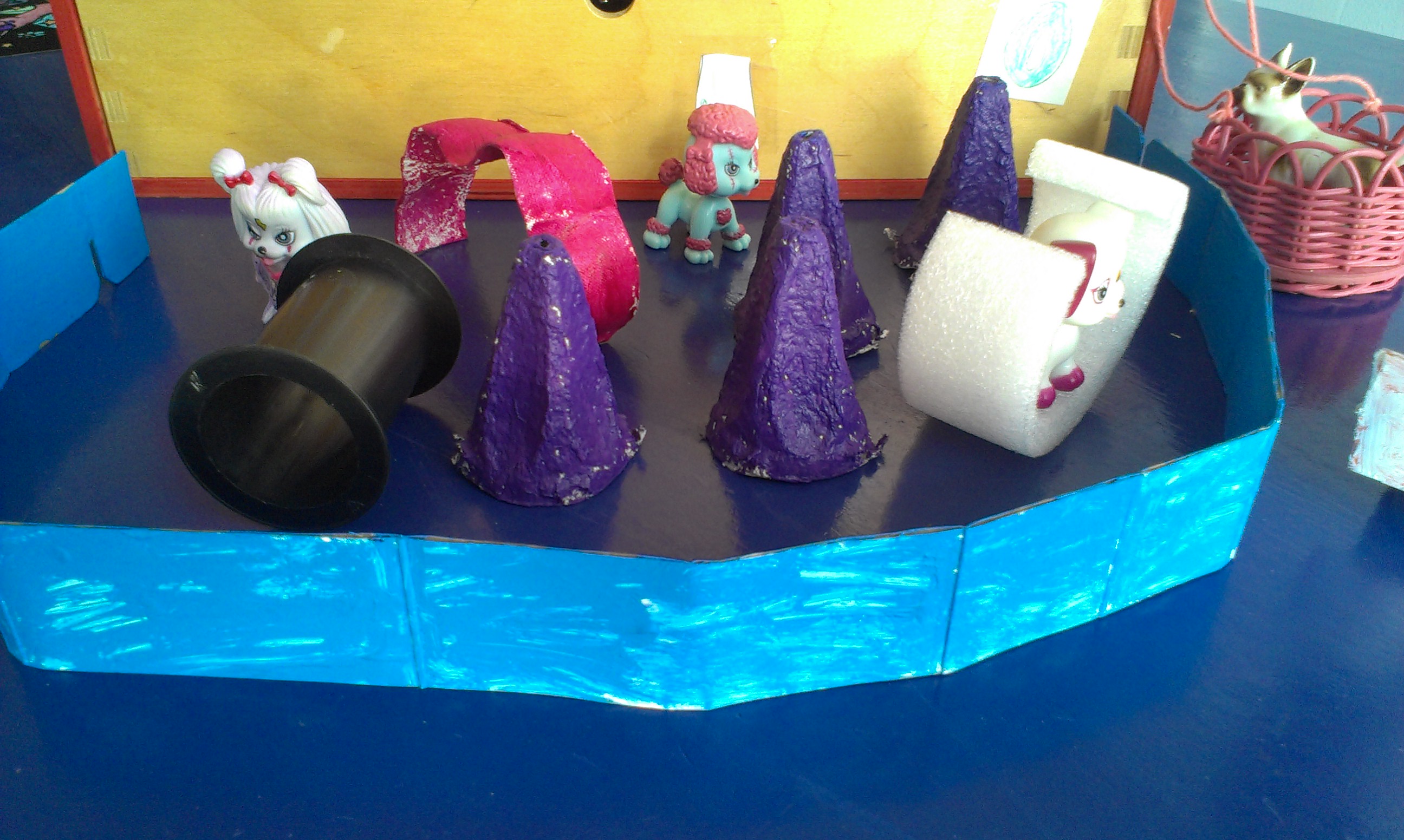Poolen er lavet af en brugt beholder til is, blåt papir med fliser tegnet på og bobbelplast, der gør det ud for bølger. Vippen er lavet af en brugt træske og et stykke plakatrør.