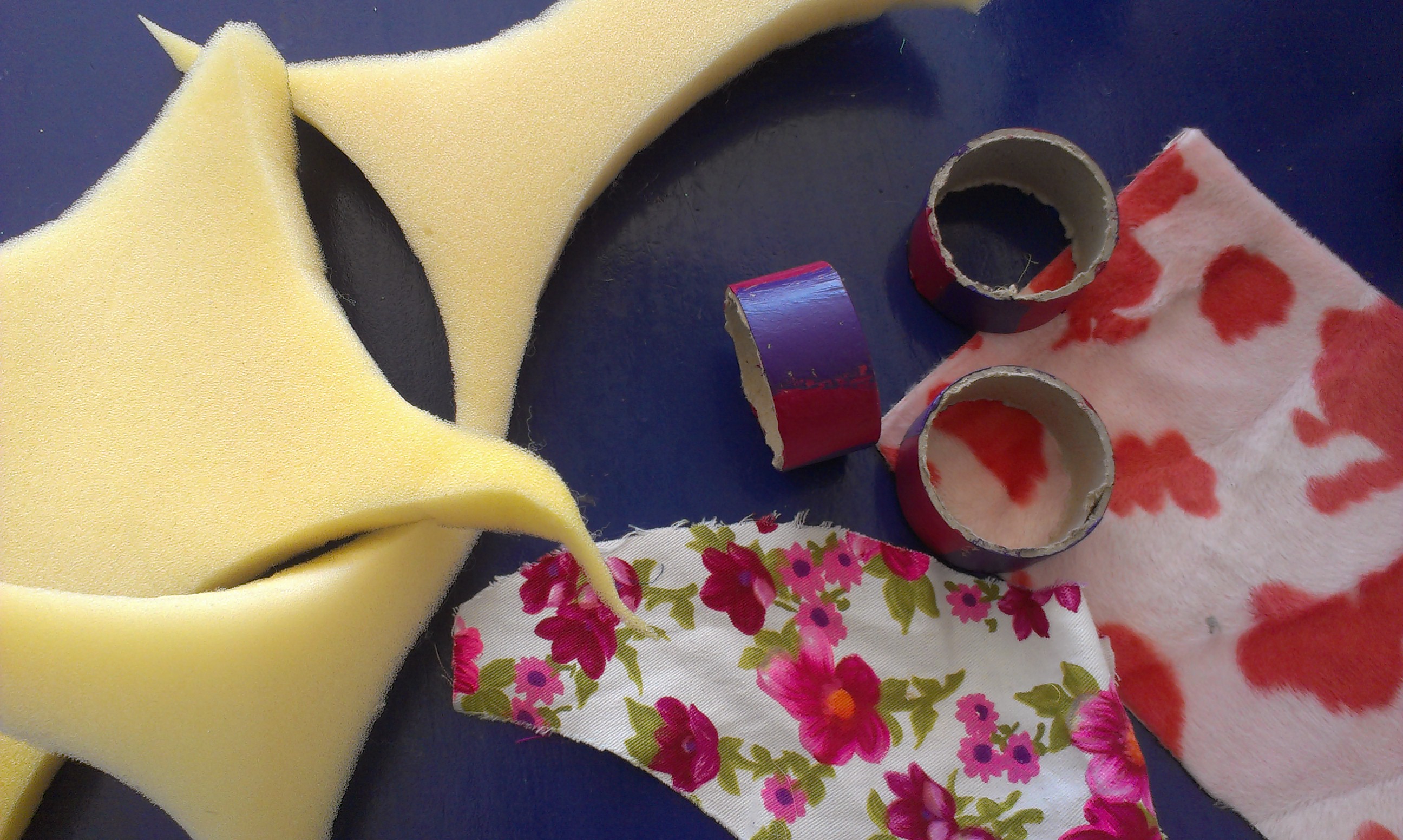 Liggestolene er lavet af stykker af plakatrør, som er malet, skumgummirester og stofrester.
