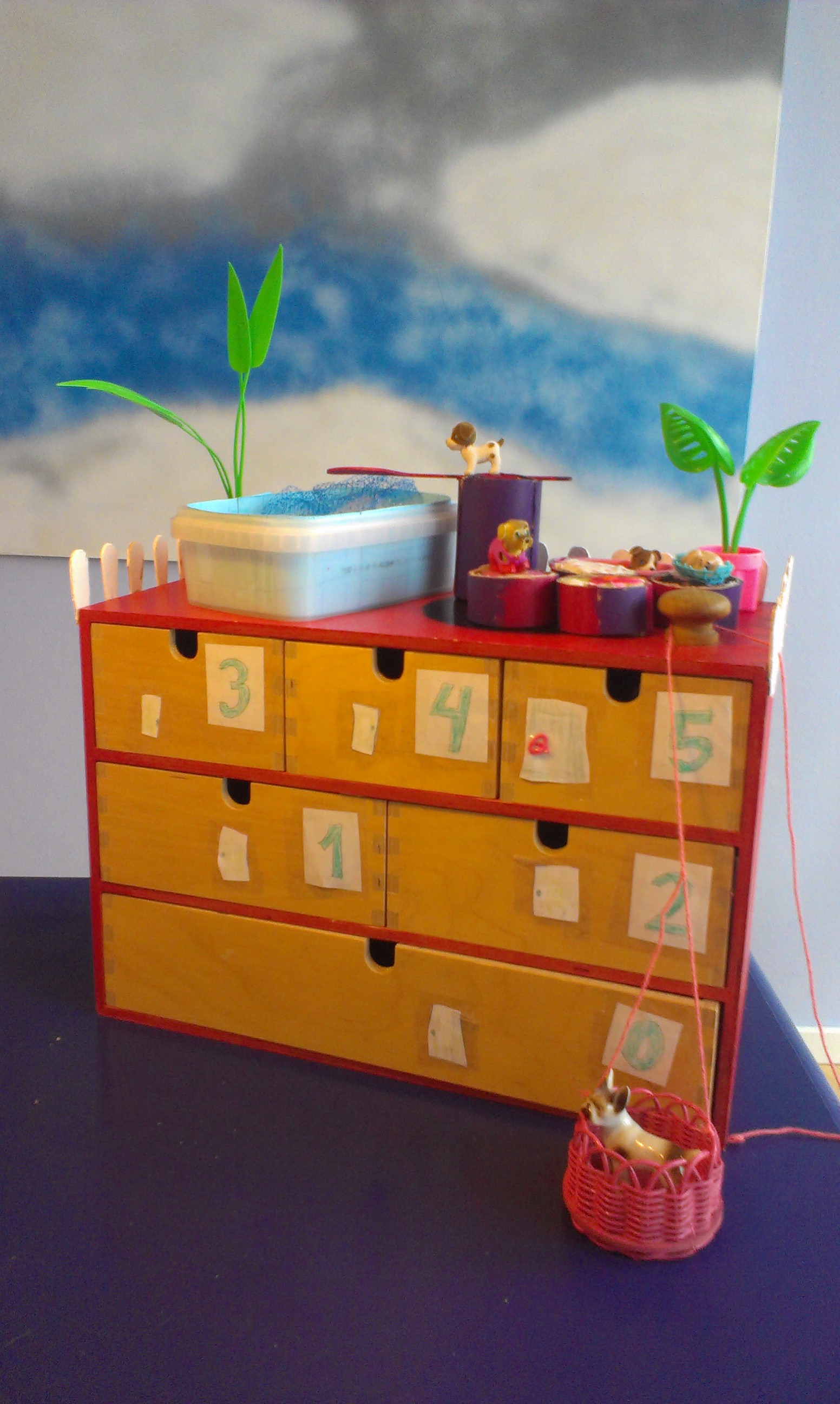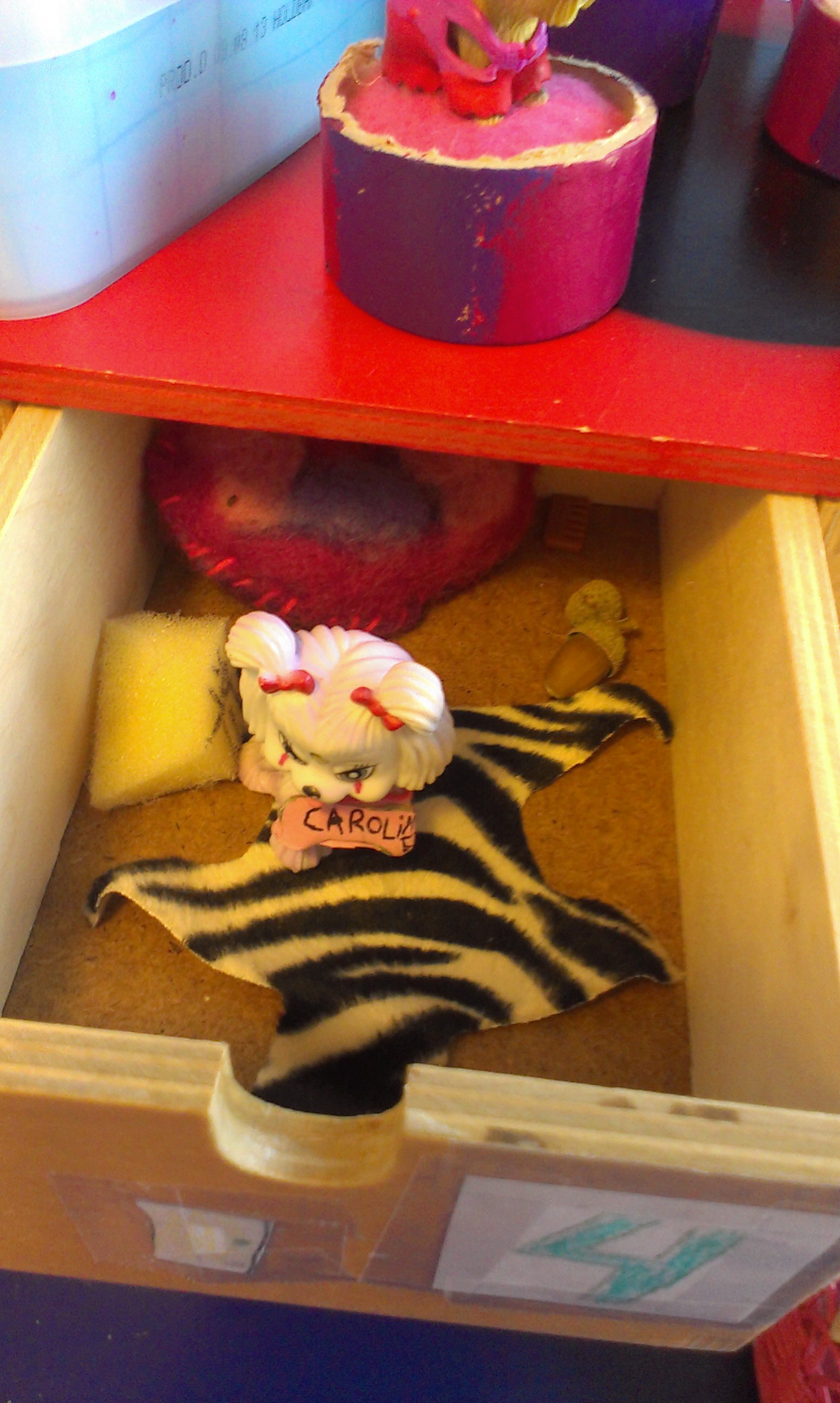 Jeg måtte krybe til korset og bekende, at ja, jeg havde afleveret huset i den lokale genbrugsbutik og nu var det nok solgt til nogle andre børn… Heldigvis fik jeg øje på noget andet på børneværelset, der sjældent bliver brugt, nemlig et lille skuffedarie med skuffer i forskellige størrelser – helt perfekt som hotel til hundene!