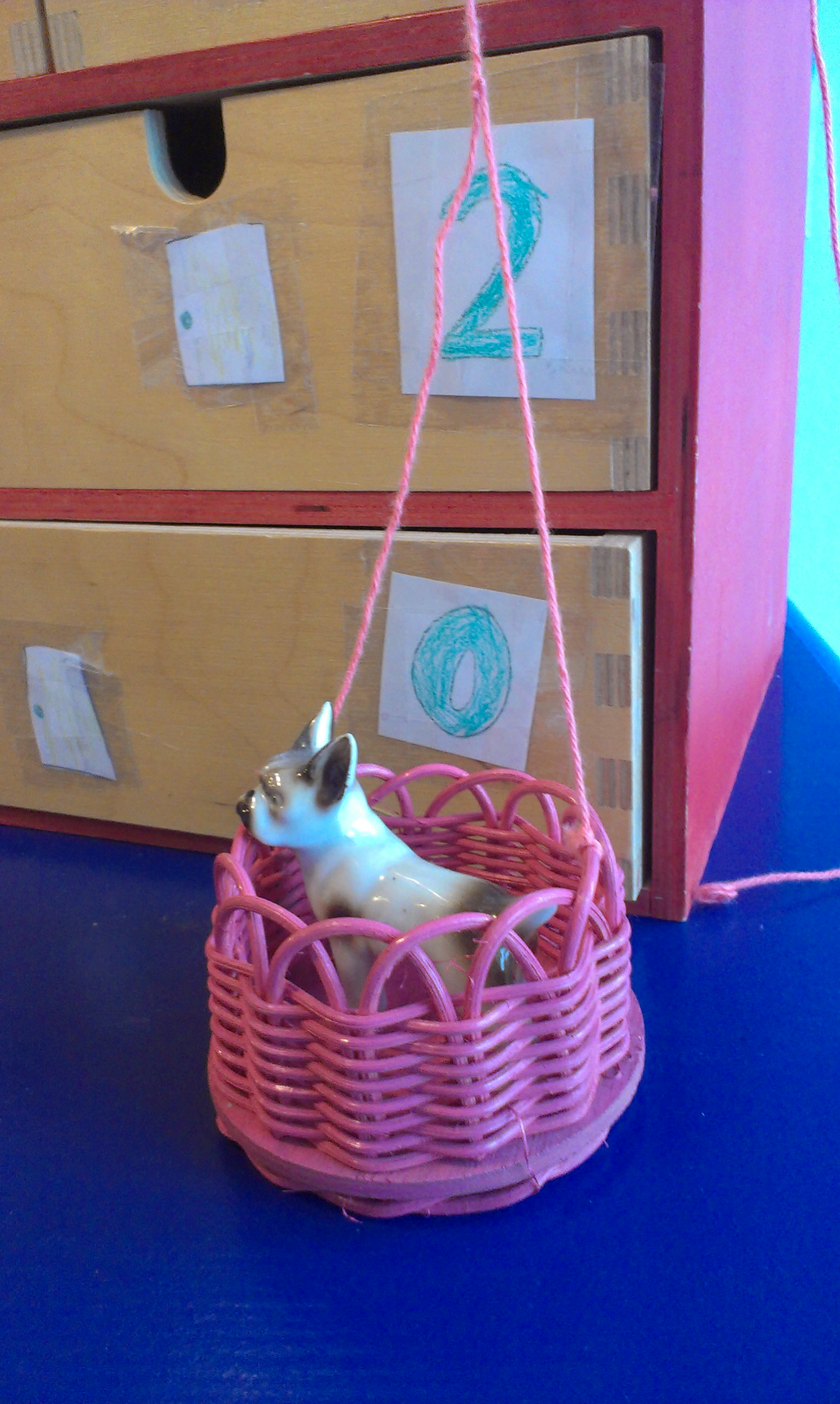 Desuden er der bundet en elevator, i form af en lille fletkurv, fast til taget, så hundene kan hejses på de forskellige etager.