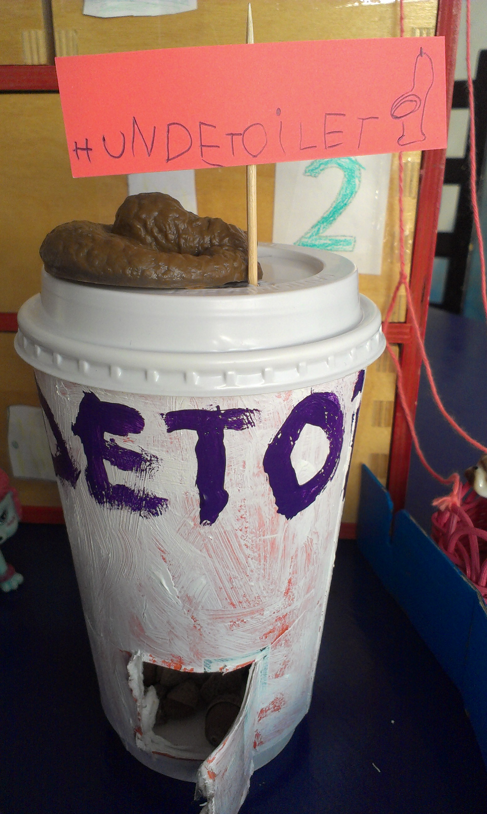 Der blev også lavet et hundetoilet af et engangskaffekrus, med to indgange og hundehømhøm på toppen.