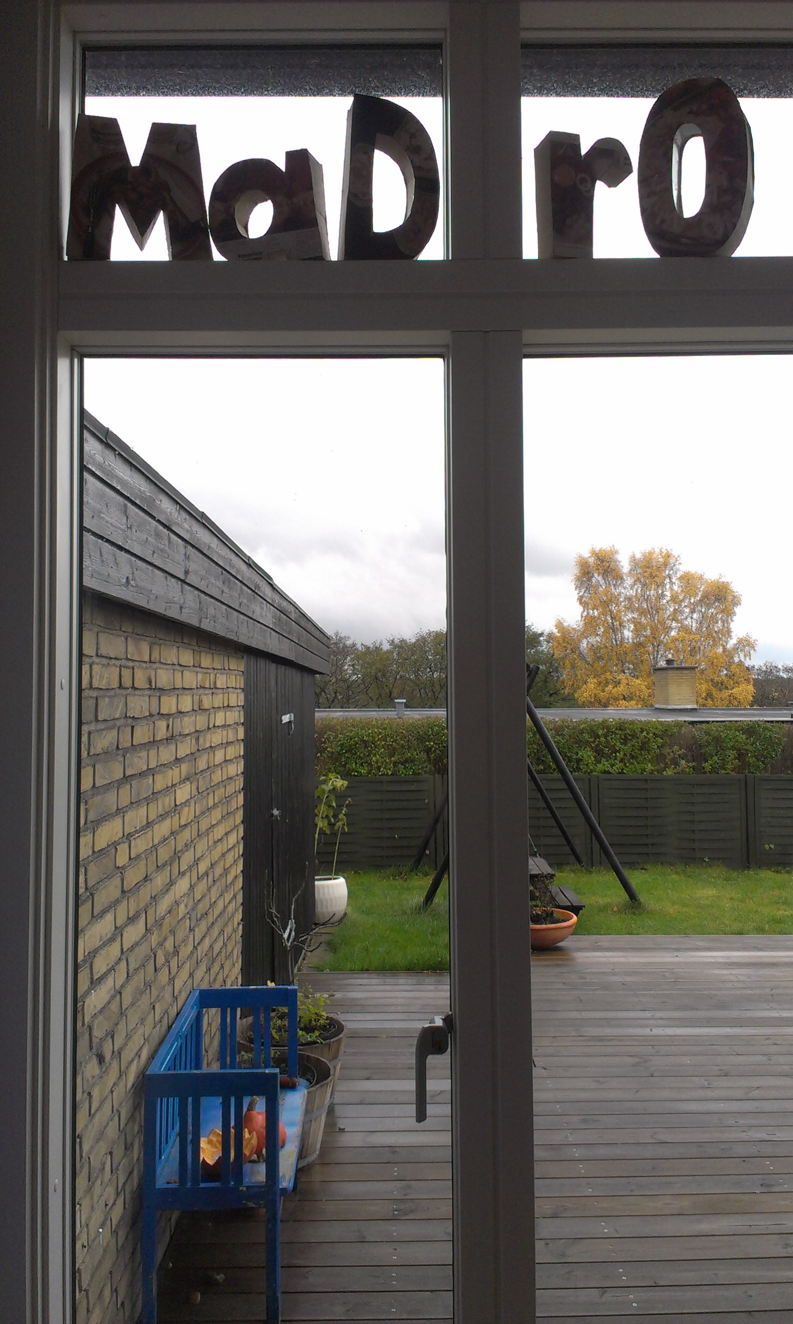 Bogstaverne skal stå i vinduet i vores spisestue og danner ordet MaDrO! – en fin hentydning til ungerne, der er begyndt at stave… Men man kan også stave til andre ord, f.eks. MOr, DaM, rOM.