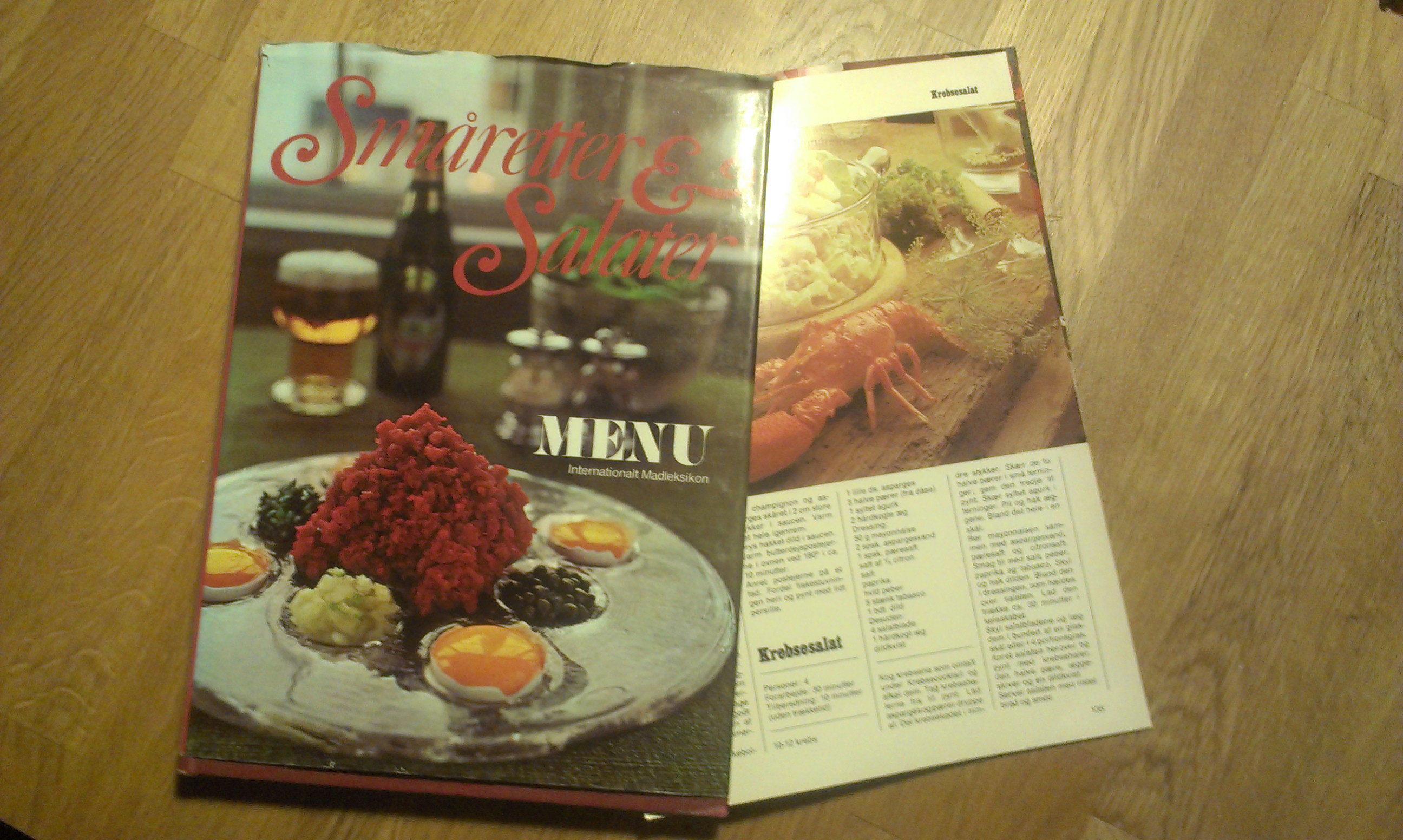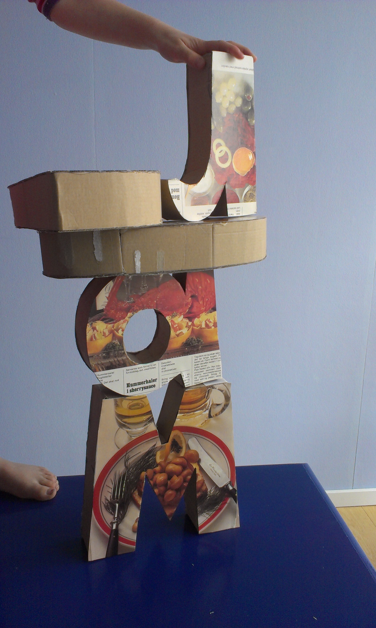 Når nu det handler om mad, har jeg fundet en 70’er kogebog (et arvestykke, som jeg aldrig har åbnet) og har brugt de kulørte sider som dekoration på bogstaverne. Er i tvivl, om jeg kan holde de typiske dunkle 70’er farver ud i længden, så jeg overvejer at udskifte kogebogssiderne med noget tapetagtigt gavepapir.
