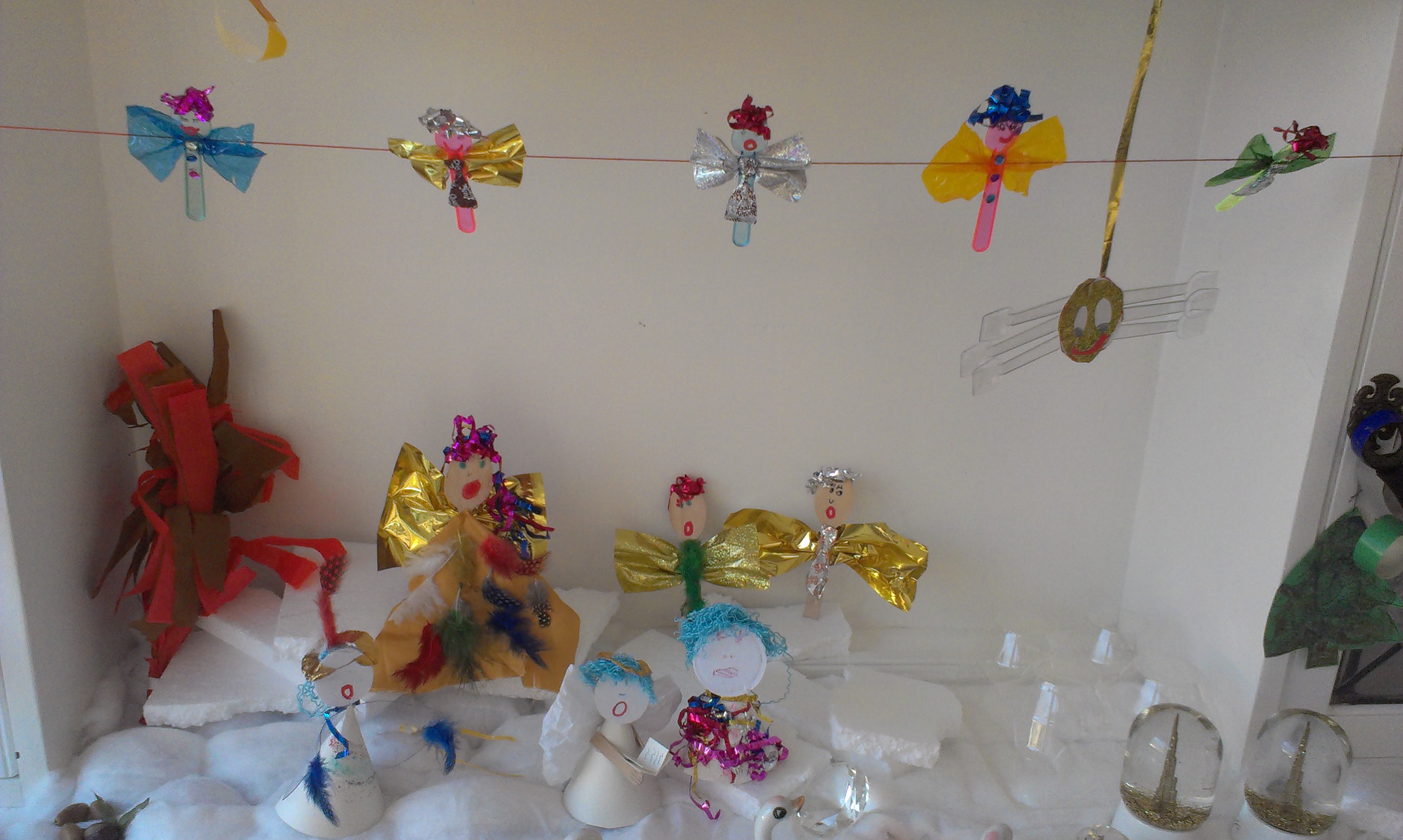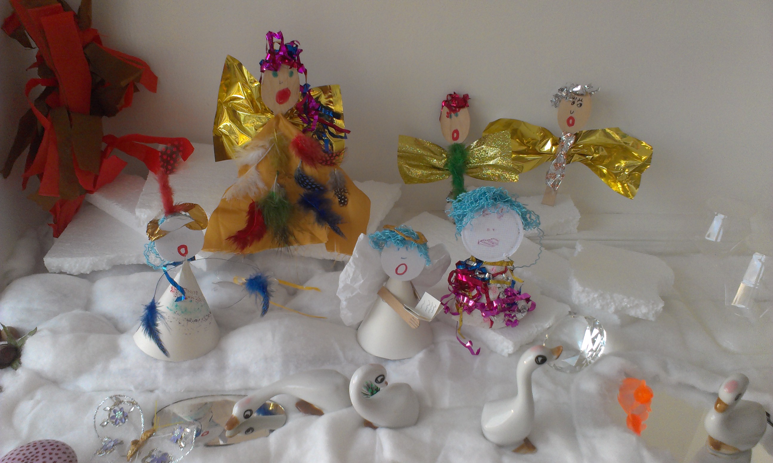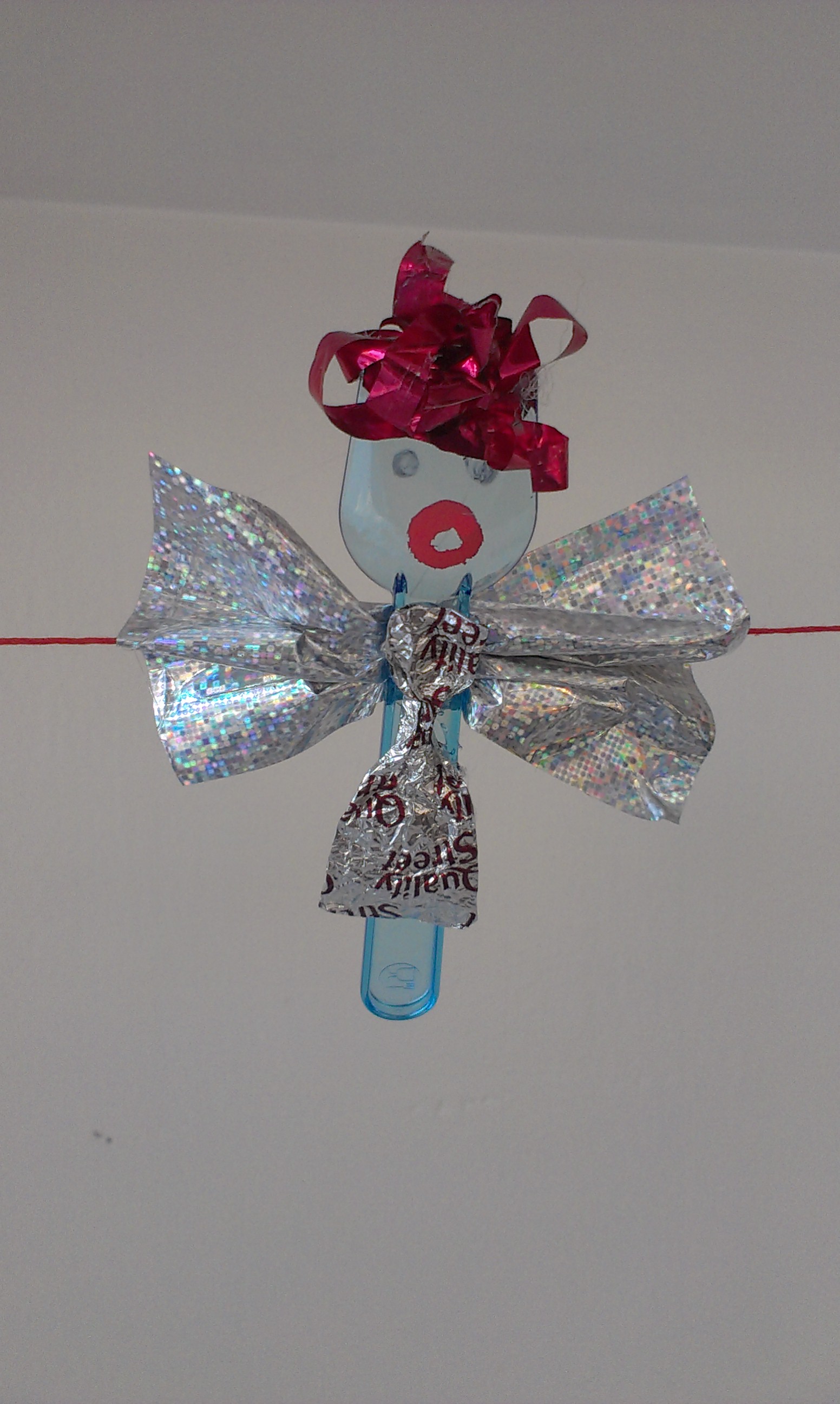 Englene er lavet af de gennemsigtige mangefarvede skeer fra Paradis Is, har vinger af Quality Street slikpapir og hår fra sidste års nytårsknallerter.