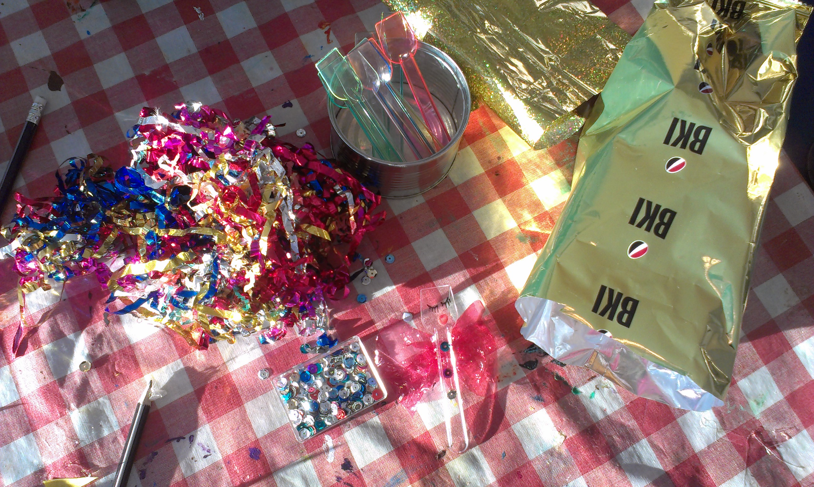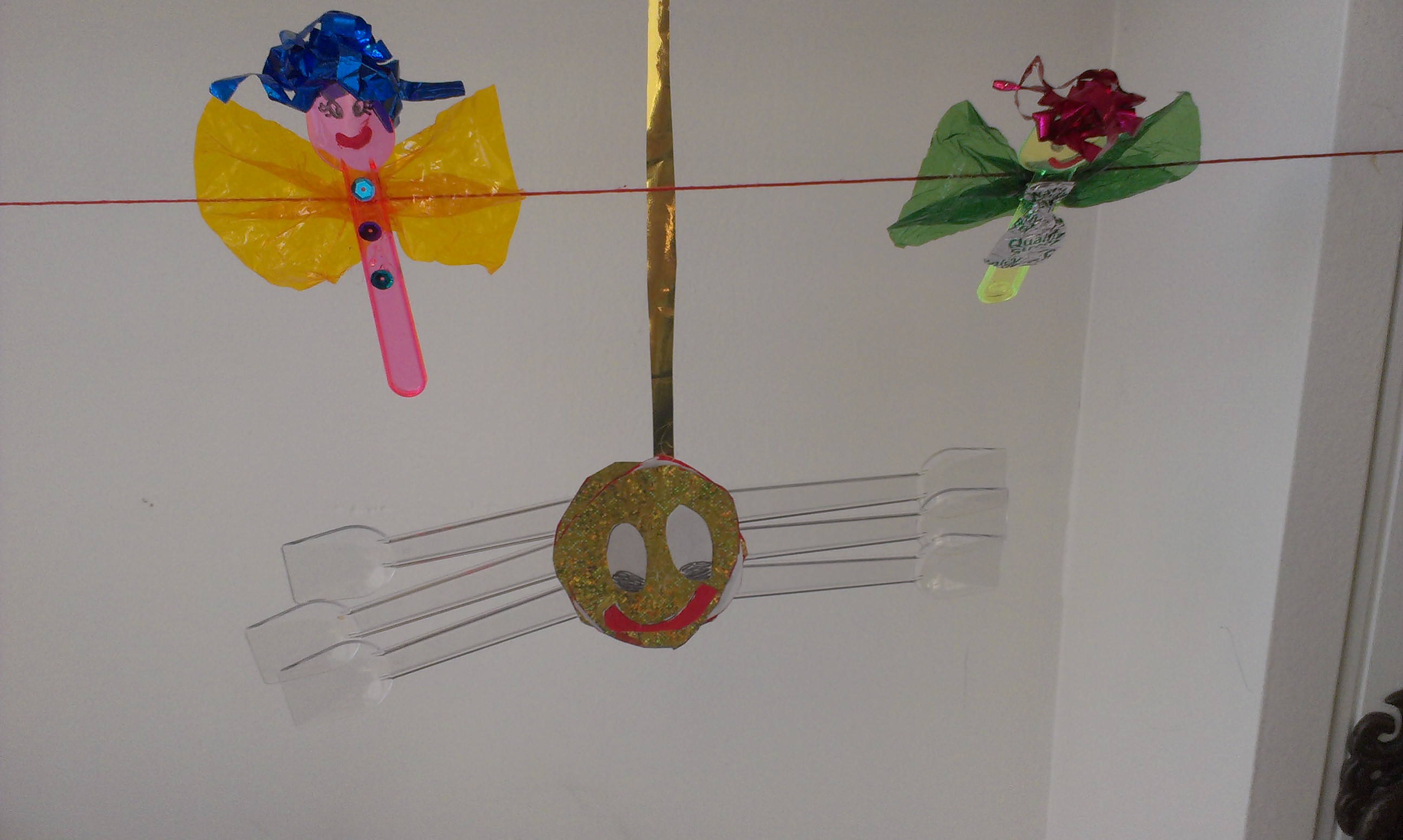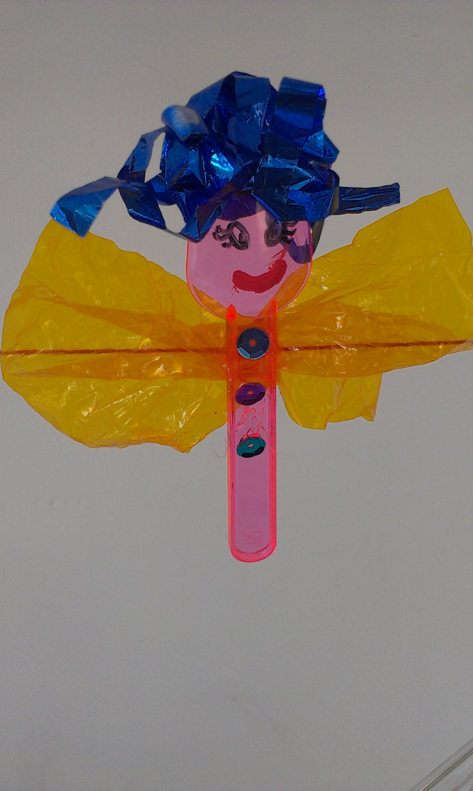 Englene er lavet af de gennemsigtige mangefarvede skeer fra Paradis Is, har vinger af Quality Street slikpapir og hår fra sidste års nytårsknallerter.