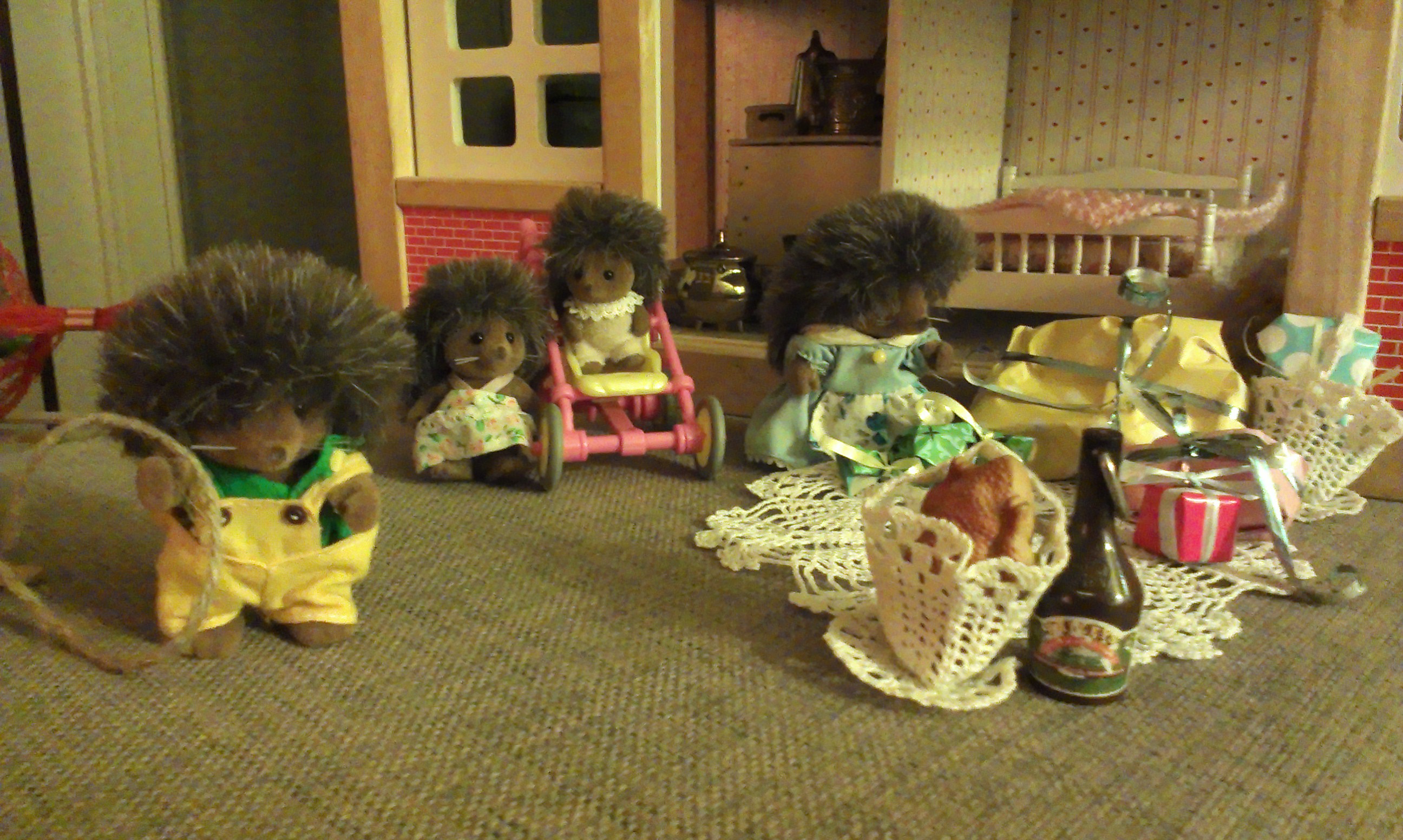Pindsvinefar og ungerne har årets juletræ med hjem på kælken, og der er blevet handlet ind til julefest, med steg og gaver.