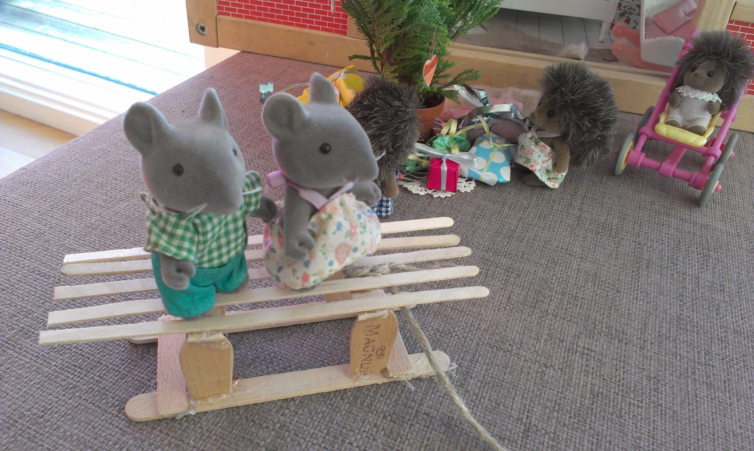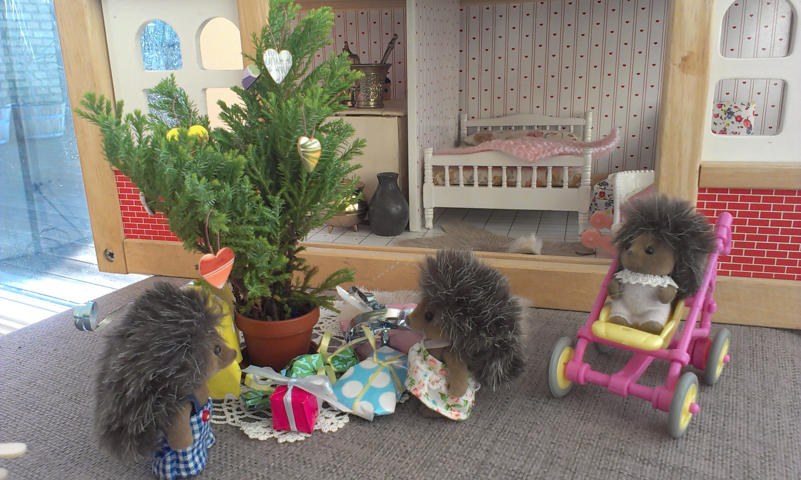 Pigerne har taget træet ud af nettet, har pyntet det og lagt gaverne under. Og pindsvineungerne glæder sig til i morgen, hvor gaverne skal pakkes op, mens musene tager en kælketur….
