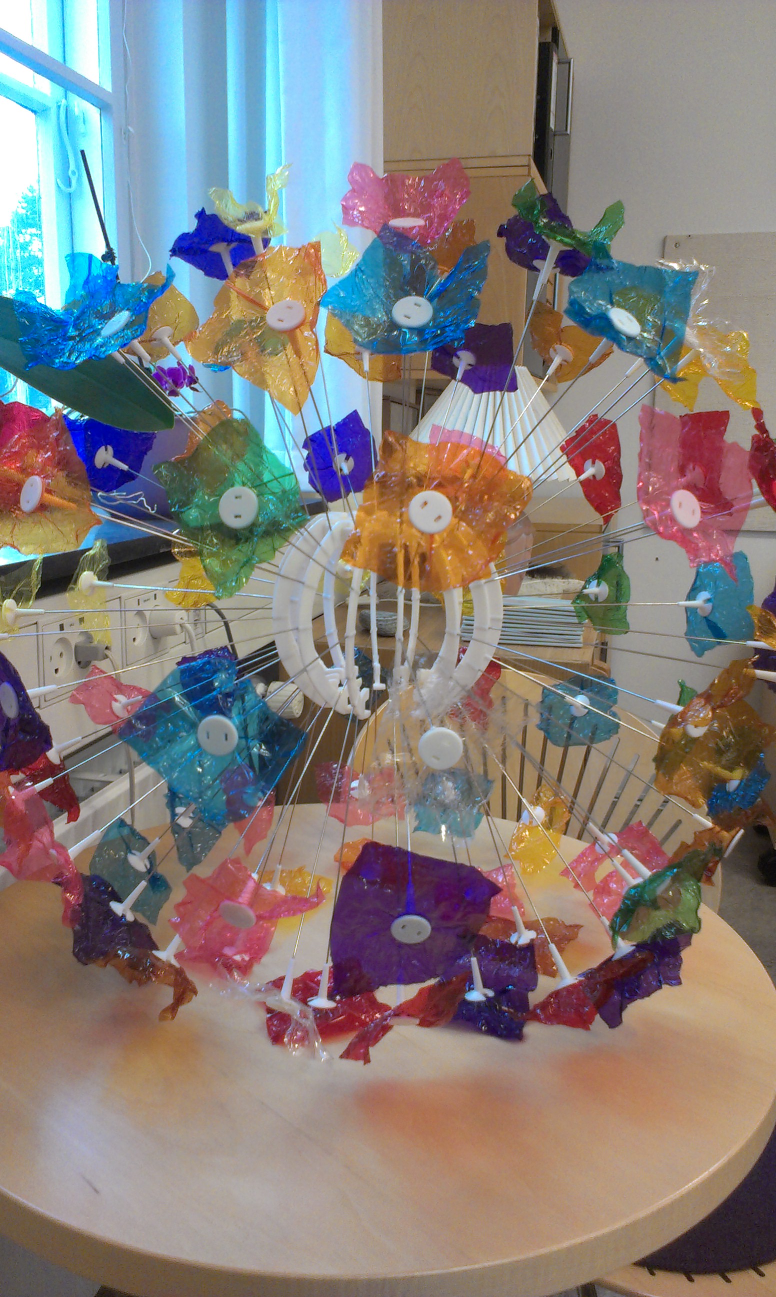 Sådan ser den oprindelige lampe ud. I stedet for de hvide blomster er der sat gennemsigtigt slikpapir fast på lampen.