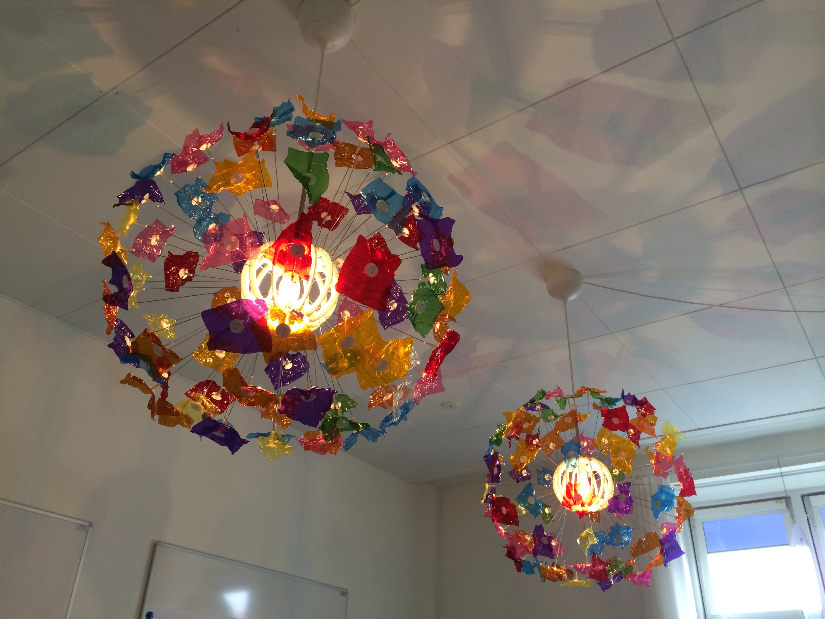 Lamperne er købt nye, men ideen er god, hvis du har lampen, men er blevet træt af blomsterne. Eksempelvis kan lampen gøre lykke på børneværelset i den farverige udgave.