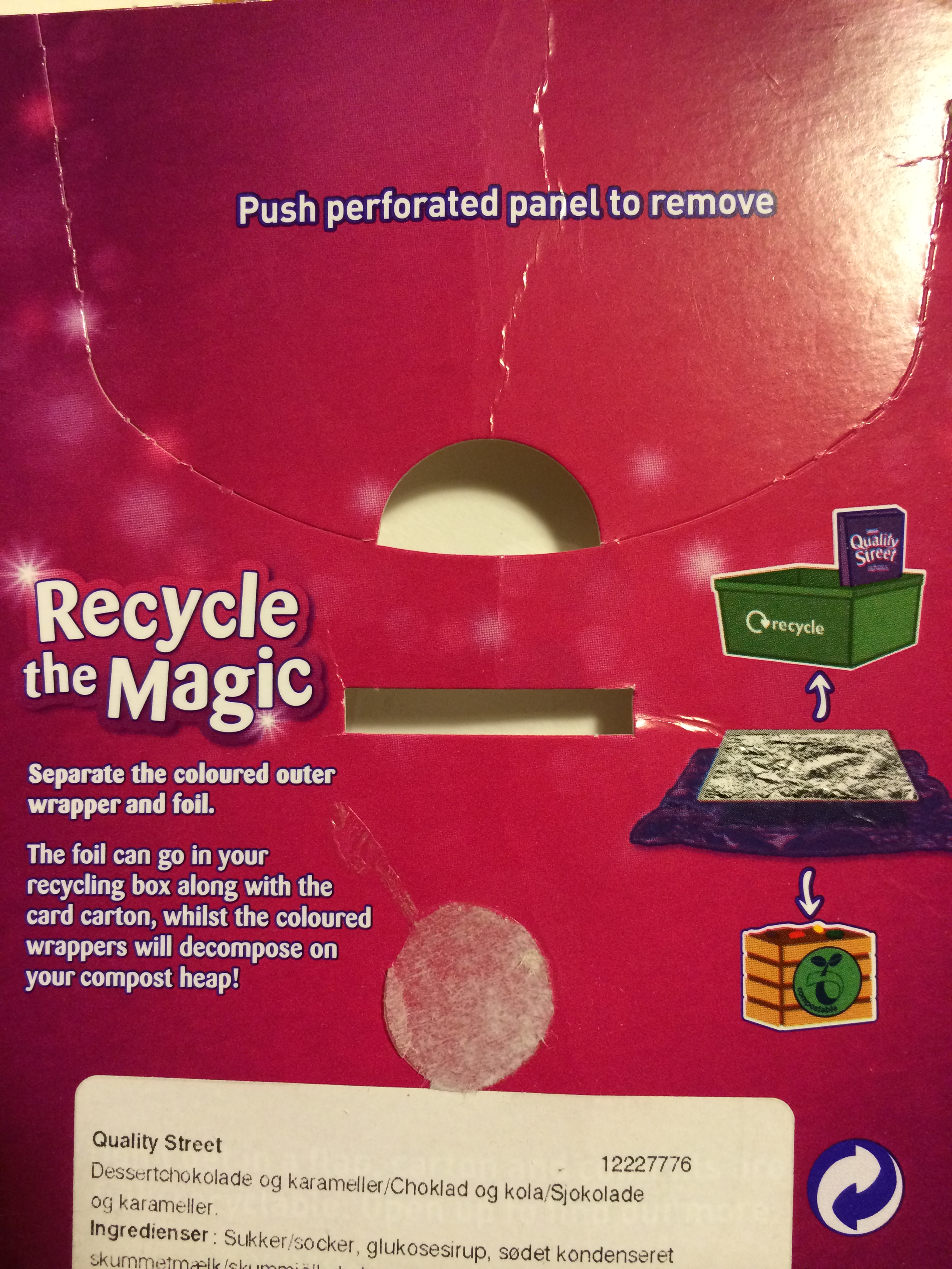 Forresten gjorde en kollega mig opmærksom på at slikpapiret, i følge Quality Street, kan komposteres (altså ikke metalpapiret). Se her illustrationen på pakken.