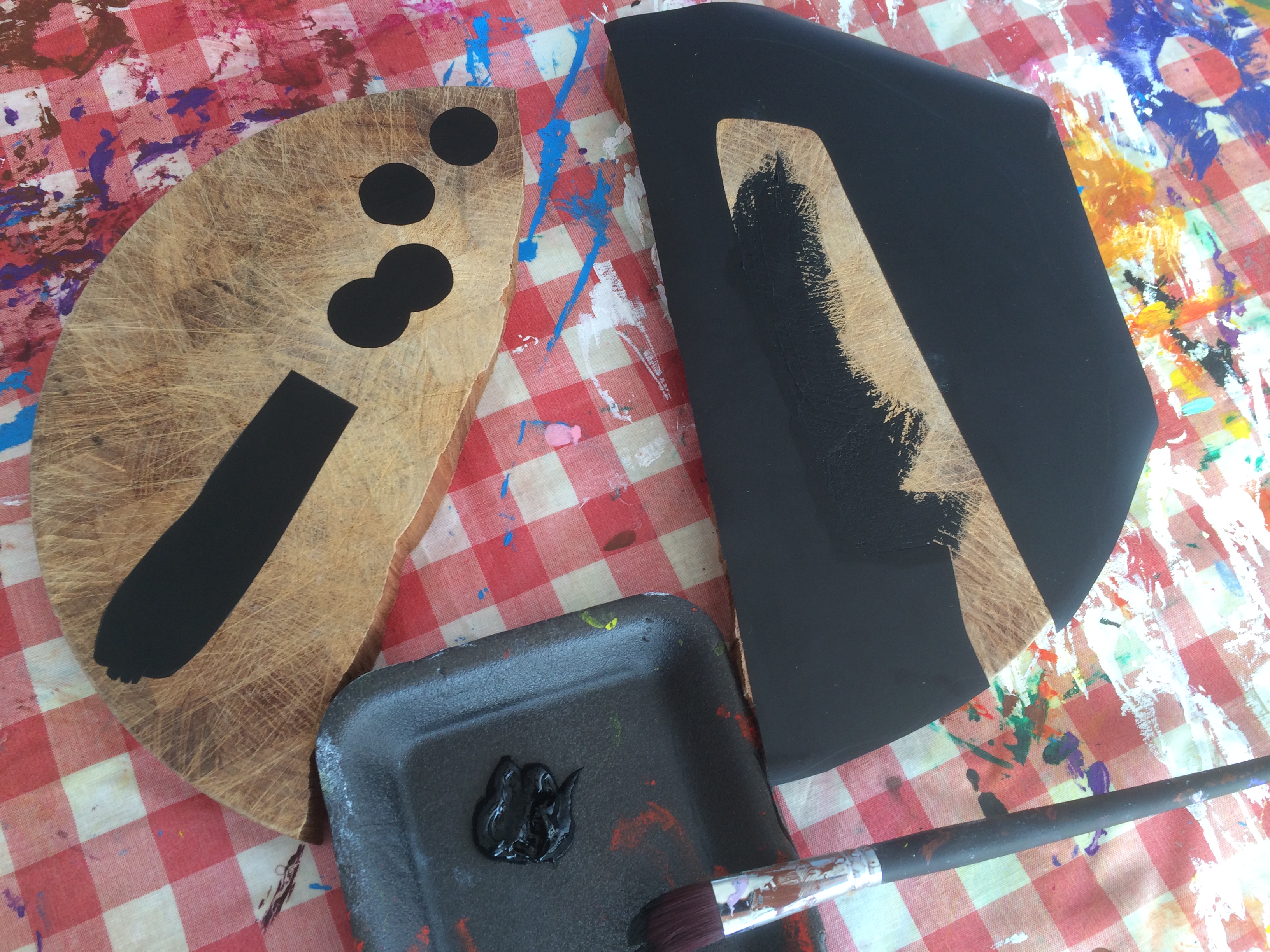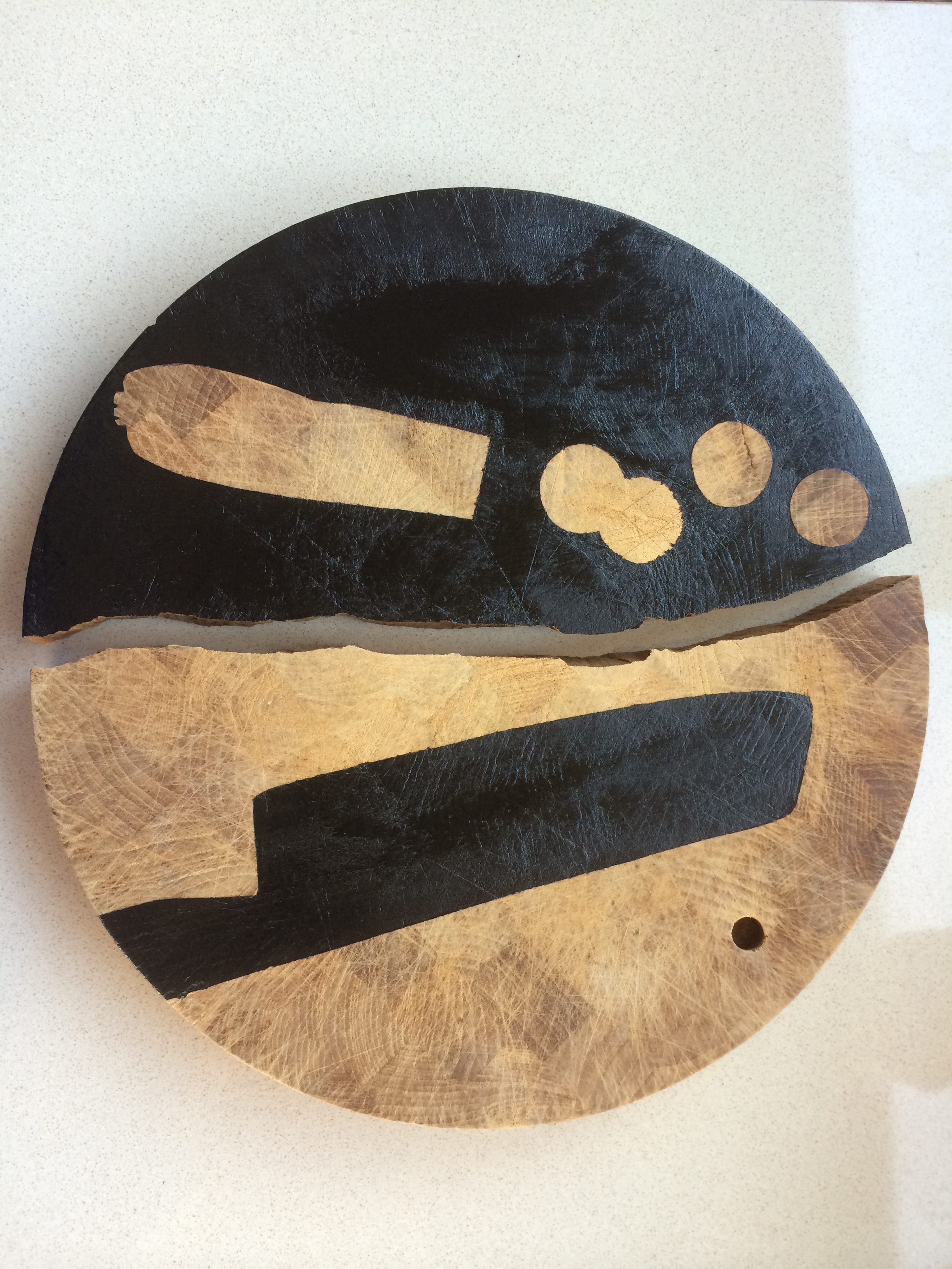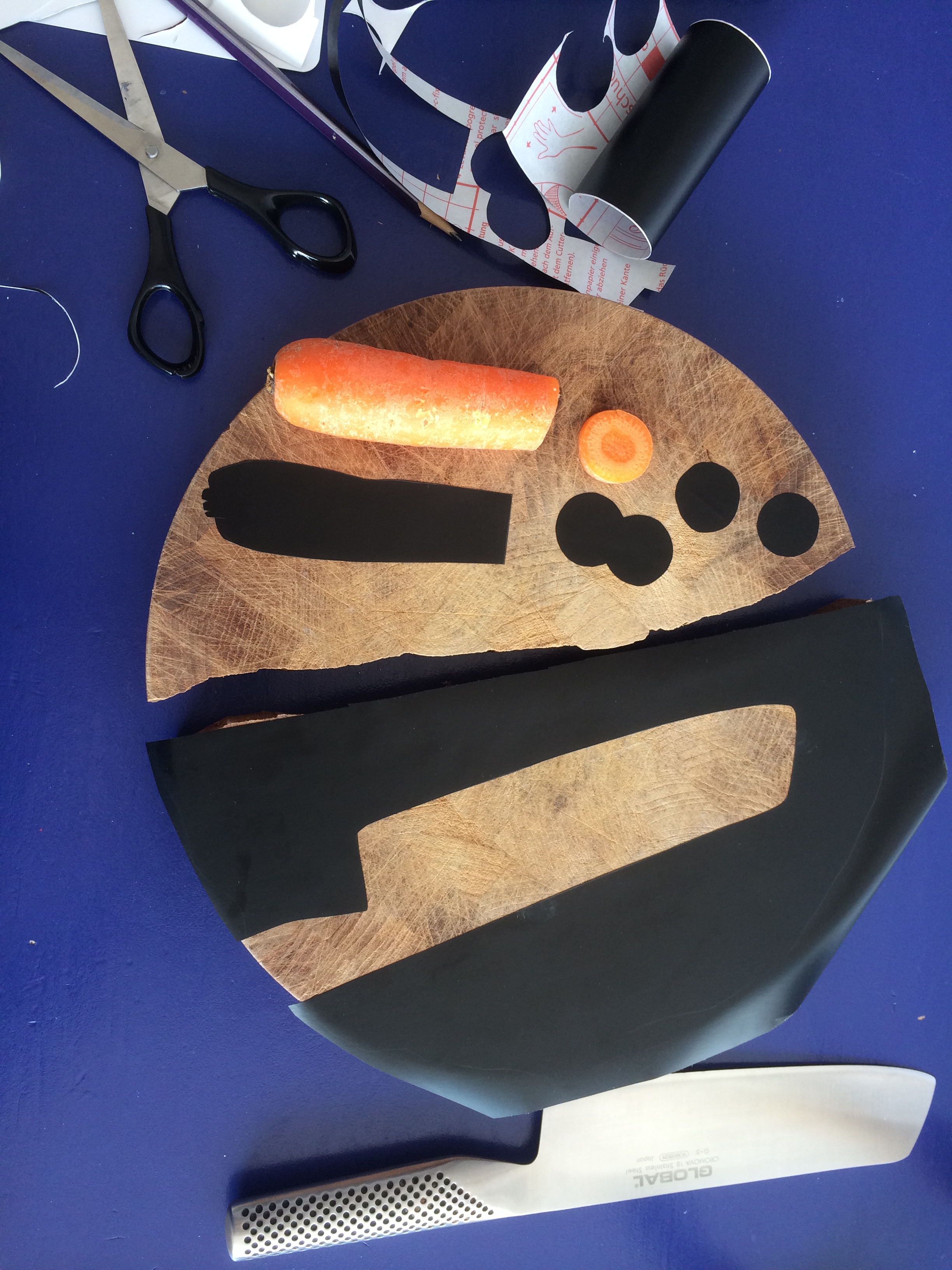 Silhuetterne af køkkenkniv og gulerod i skiver er lavet ved hjælp af en rest af selvklæbende hyldepapir og sort akrylmaling. Motivet er på den ene halvdel af spækbrættet farvelagt og på den anden halvdel er det baggrunden, der er farvet, hvilket giver en god yin yang effekt.