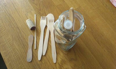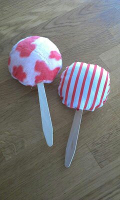Slikkepindens stofpuden er sat på en rengjort ispind. Ispinde kan fint klare en tur i opvaskemaskinen, og vi har efterhånden en hel samling af træemballage, bestik med mere til vores kreaprojekter.
