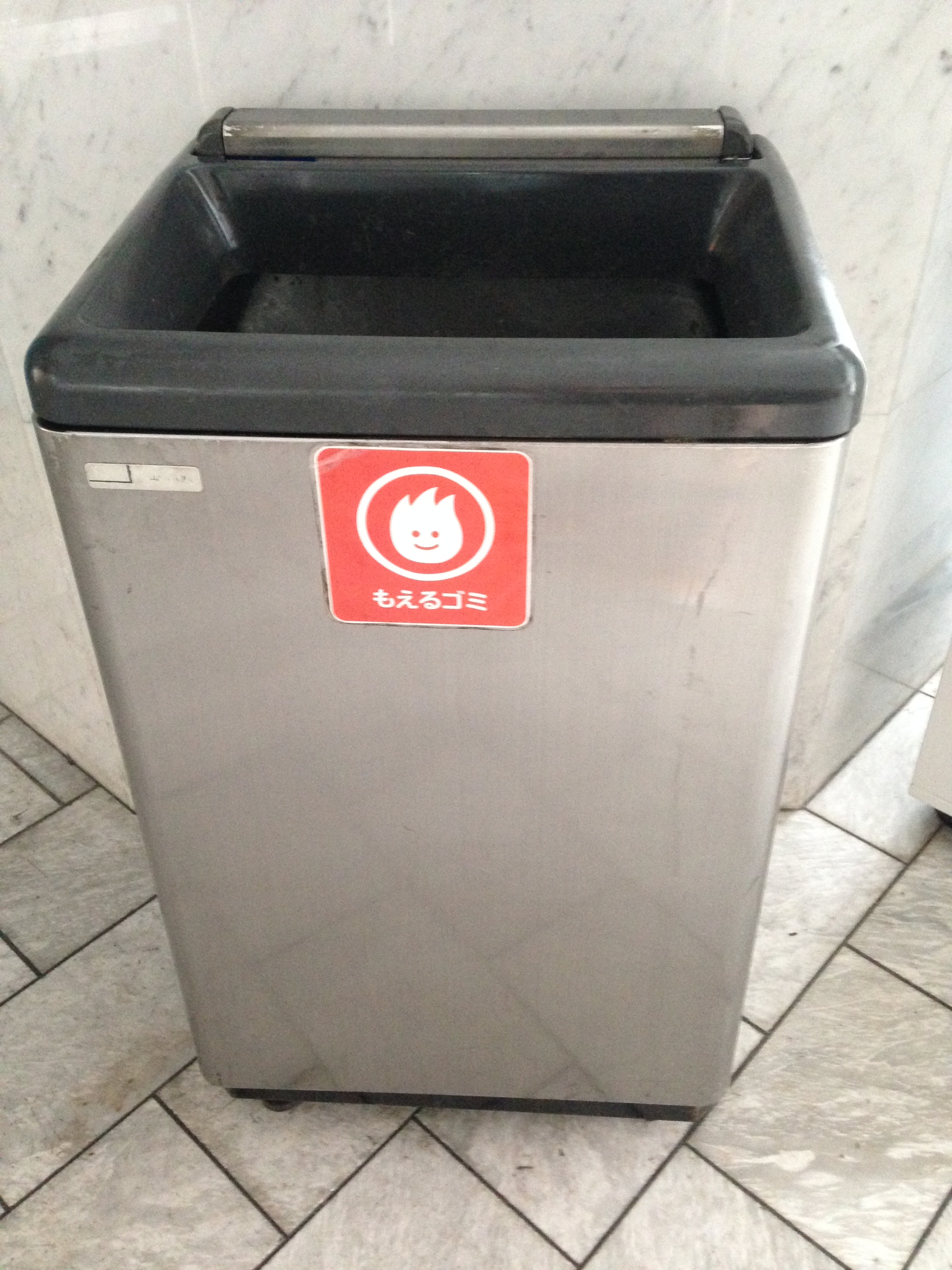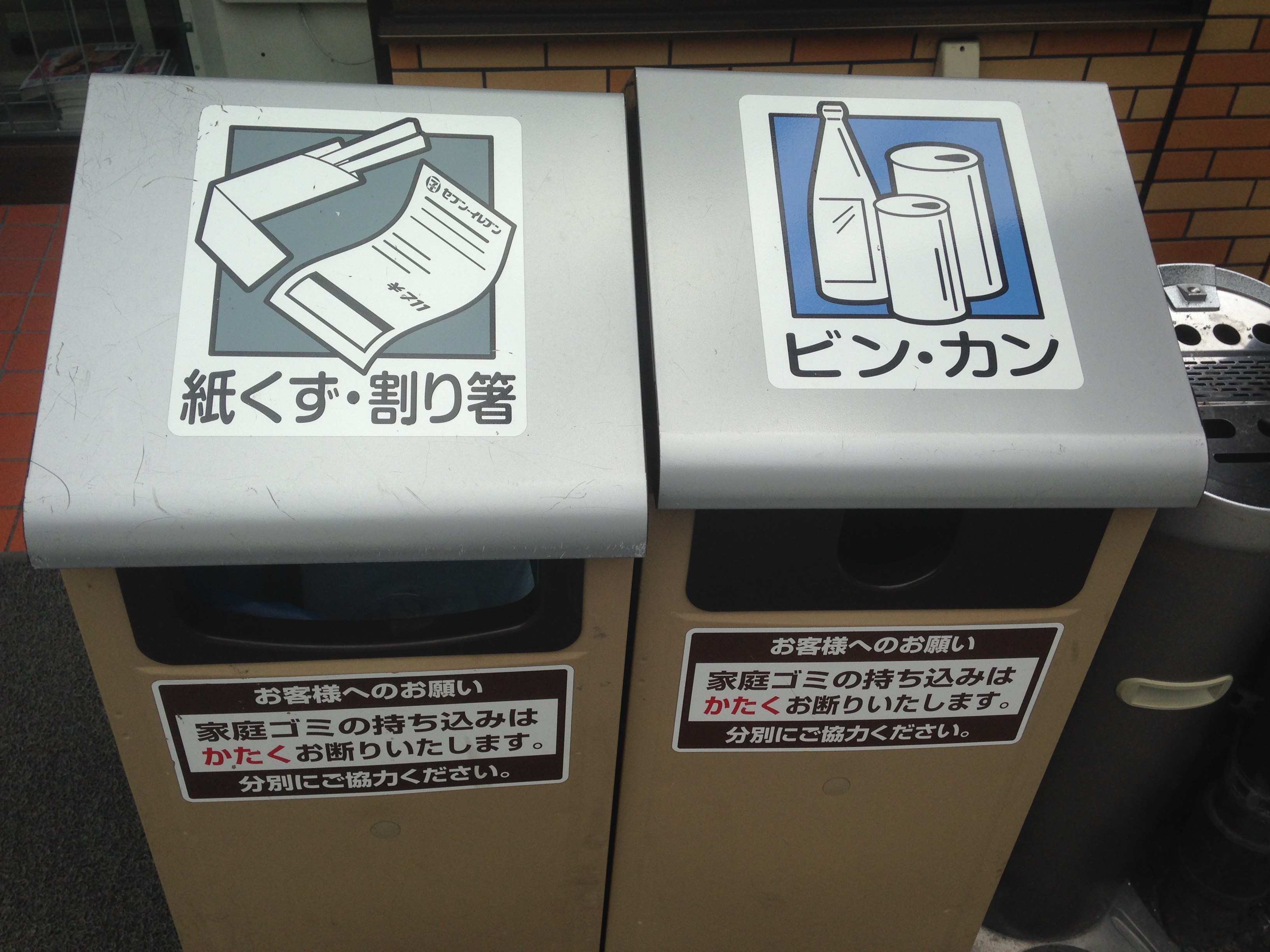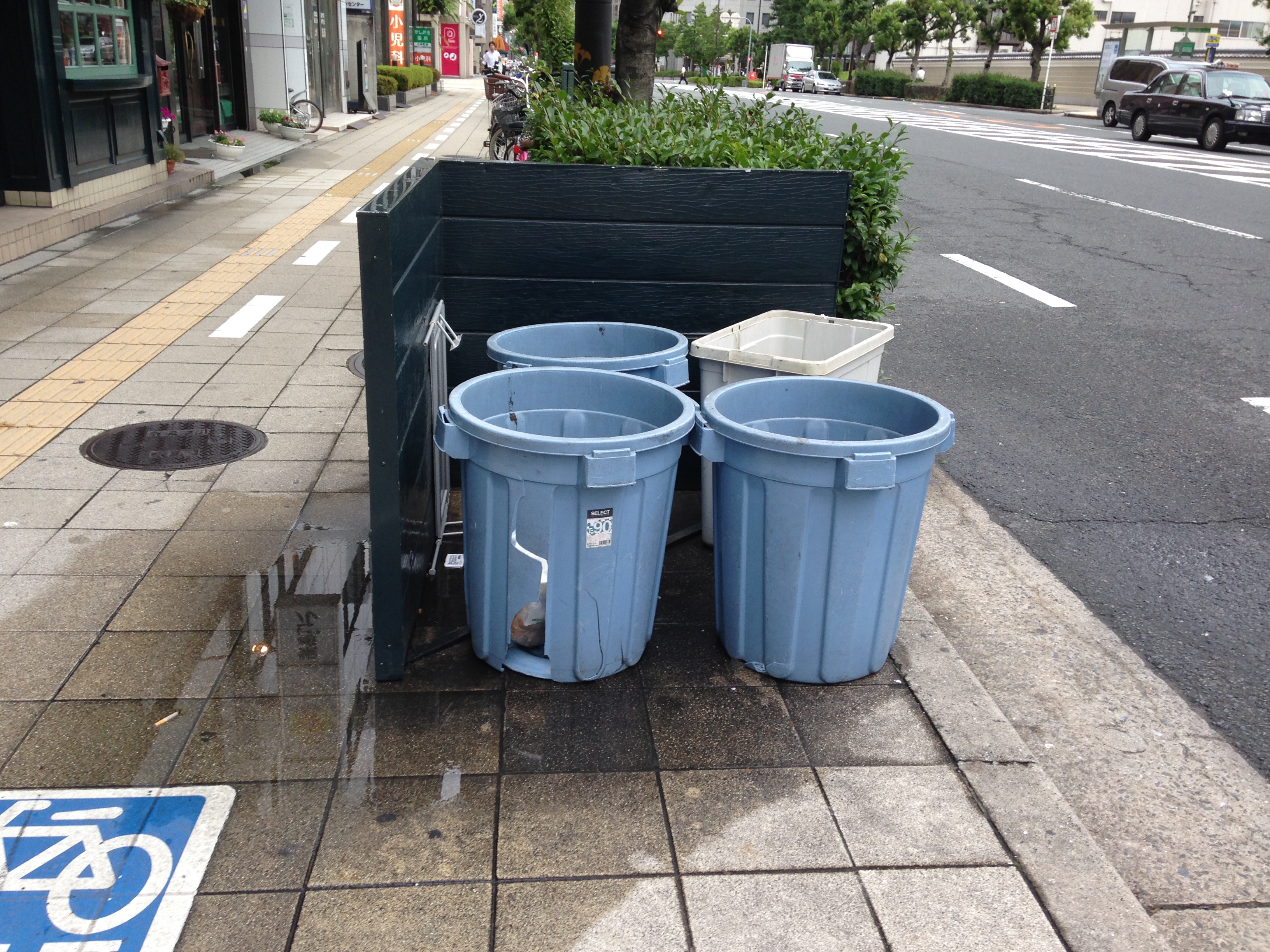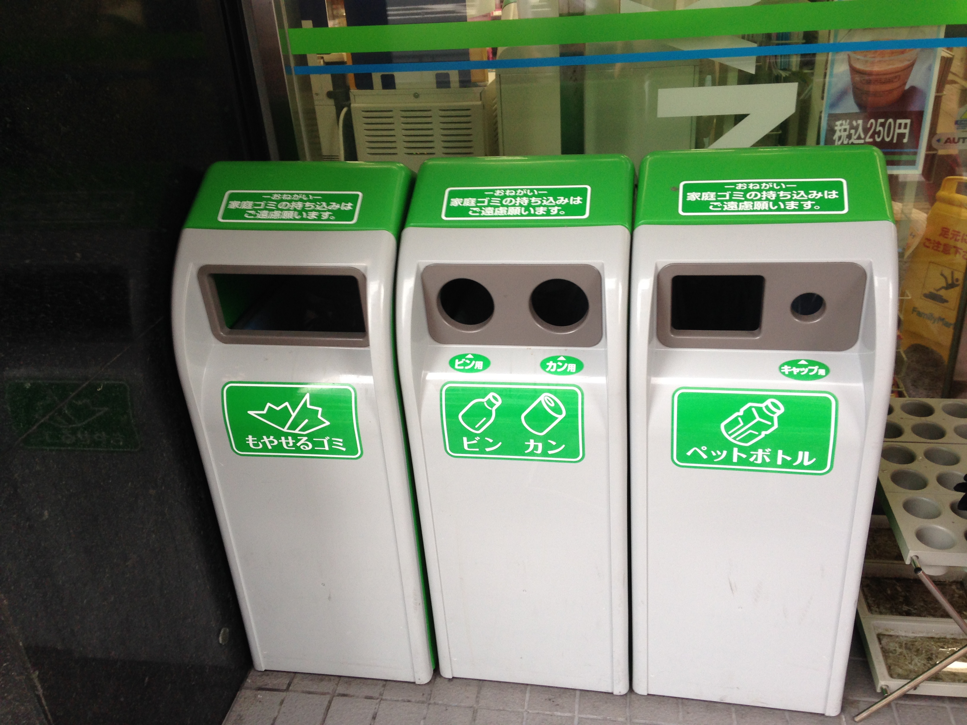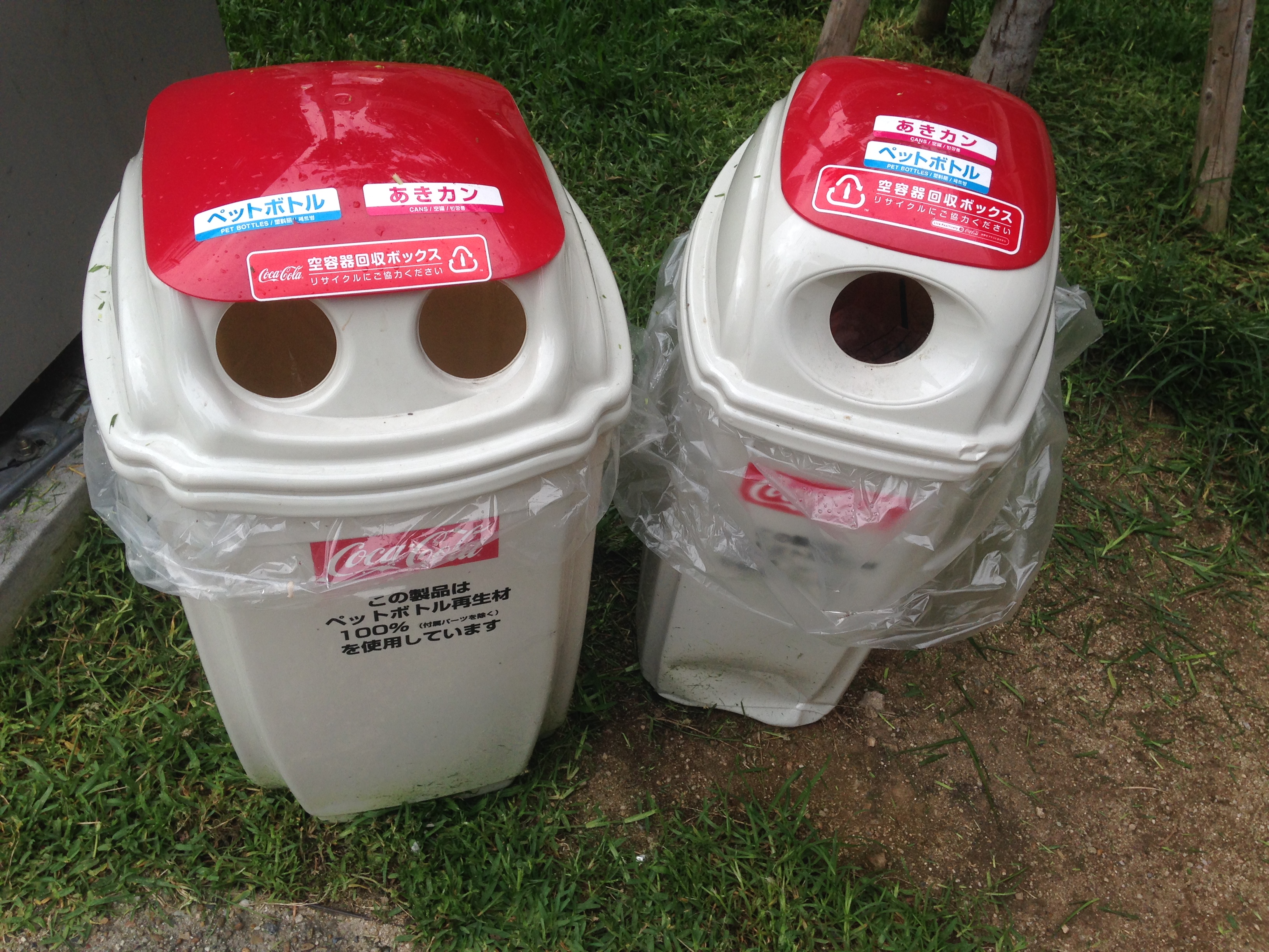 Hvad angår affald, indsamles der i Japan forskellige typer af genanvendeligt emballage, herunder PET-flasker og metal dåser i separate affaldsspande, der står opstillet på gaderne. Der kan dog være langt mellem skraldespandende, der oftest står udenfor butikker, der sælger fødevarer. Dette hænger sandsynligvis sammen med, at det er de forretninger, der sælger madvarer, der har ansvaret for at bortskaffe emballageaffald. Typisk er der to til tre spande, én til ikke genanvendeligt/brændbart affald og én eller to til genanvendeligt affald.