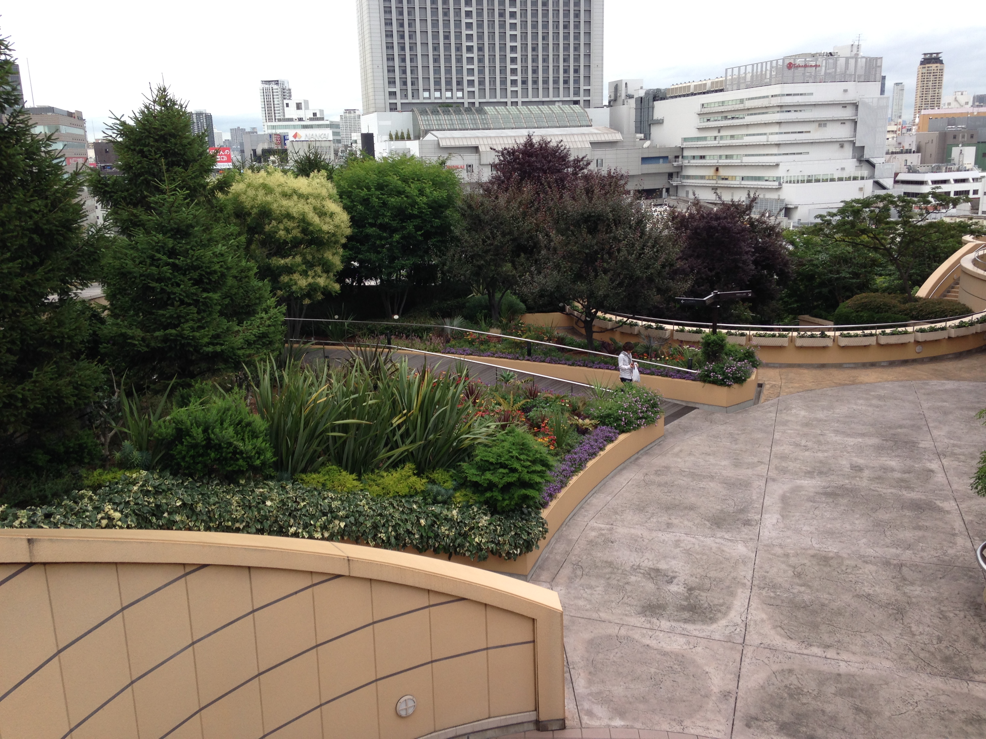I byen Osaka stødte vi også på forskellige initiativer til at bringe træer og planter ind i byen. Flere steder dyrkede de grøntsager i potter på gaden og vi besøgte en meget flot taghave. Taghaven er placeret på toppen af et storcenter, hvilket måske nok slår skår i bæredygtigheden 😉 Her et par fotos fra haven.