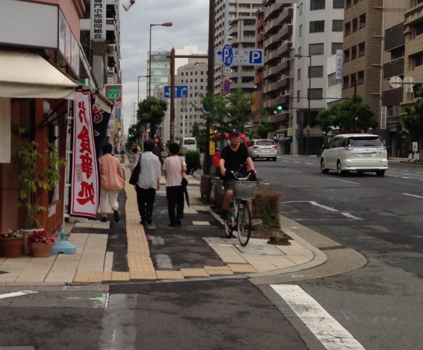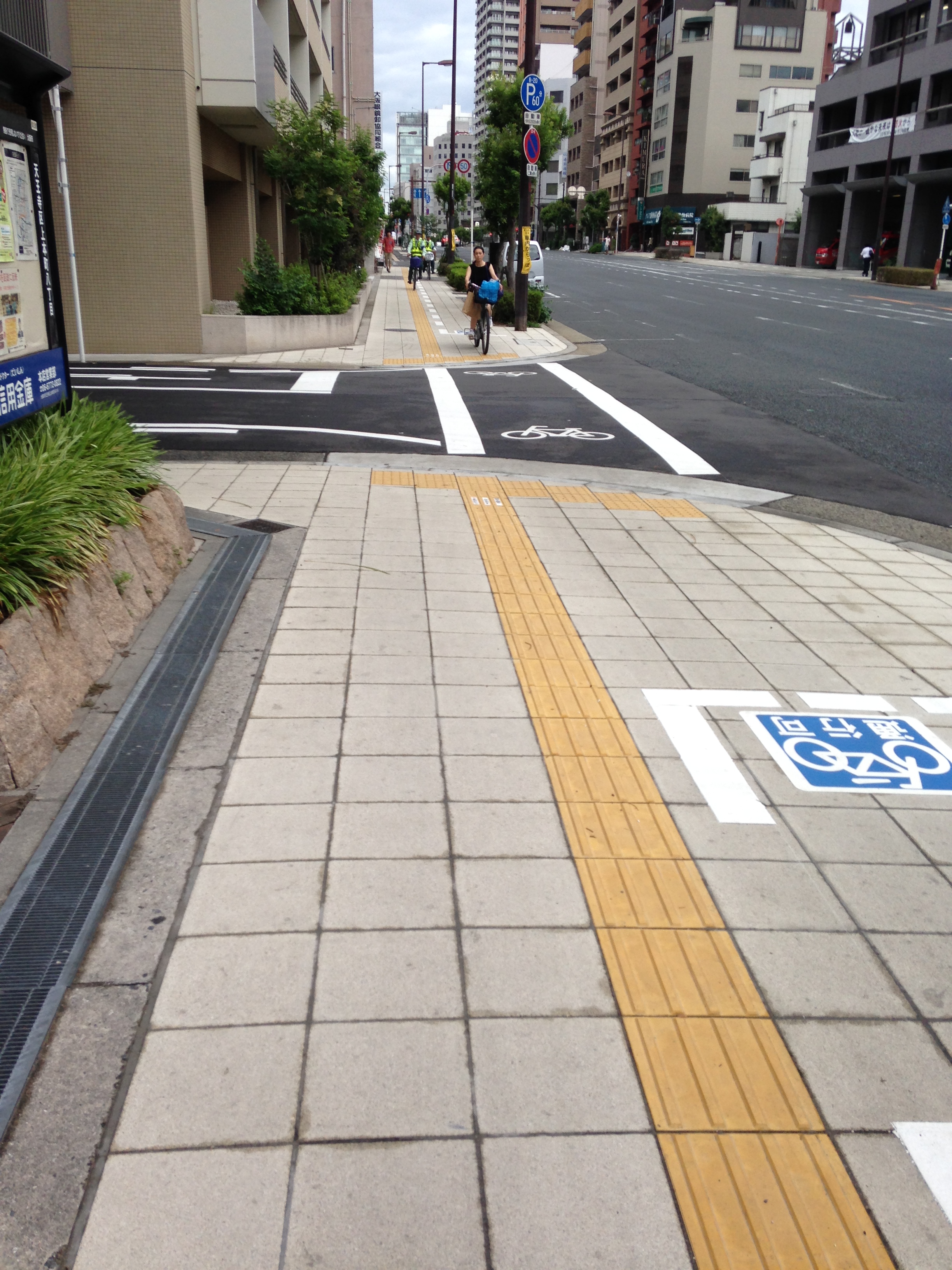 På alle gader i byerne er der en opdelingen af fortovet i fortorv og cykelsti. Desværre fungerer cykelstierne ikke helt så godt som i Danmark, eftersom skillelinjen ikke bliver respekteret, og cyklisterne må sno sig ud og ind mellem de gående. Kantstenen, der skiller fortorv fra cykelsti i Danmark, kan jeg nu konkludere er en smart installation, hvis man som cyklist skal kunne cykle uforstyrret. Omvendt er cyklisterne i Japan tvunget til at køre ordentligt, da de hele tiden skal sænke farten, fordi fodgængerne konstant er i vejen.