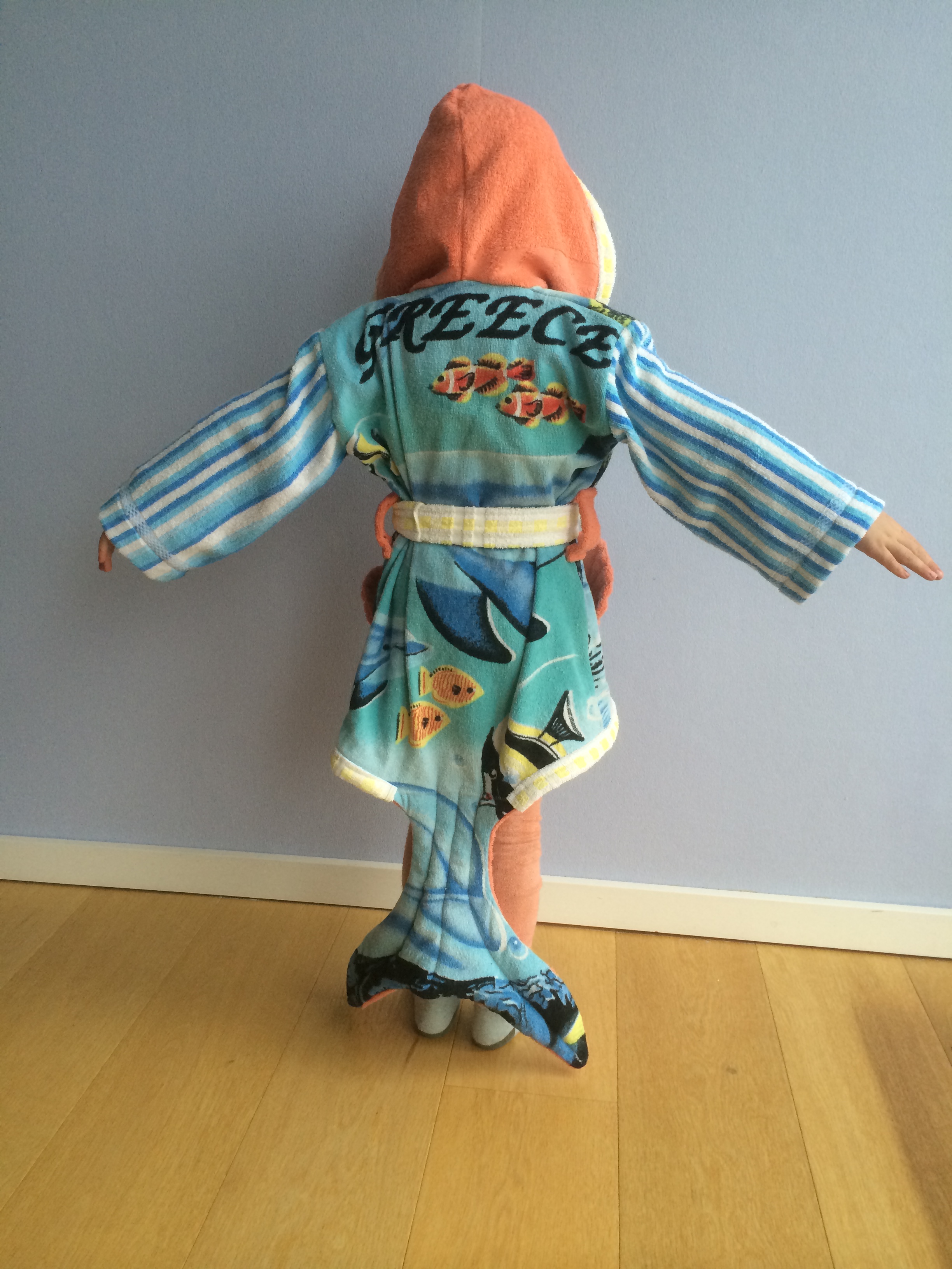Og her er resultatet syet af brugte håndklæder og badeforhæng og to stropper fra en papirsbærepose.