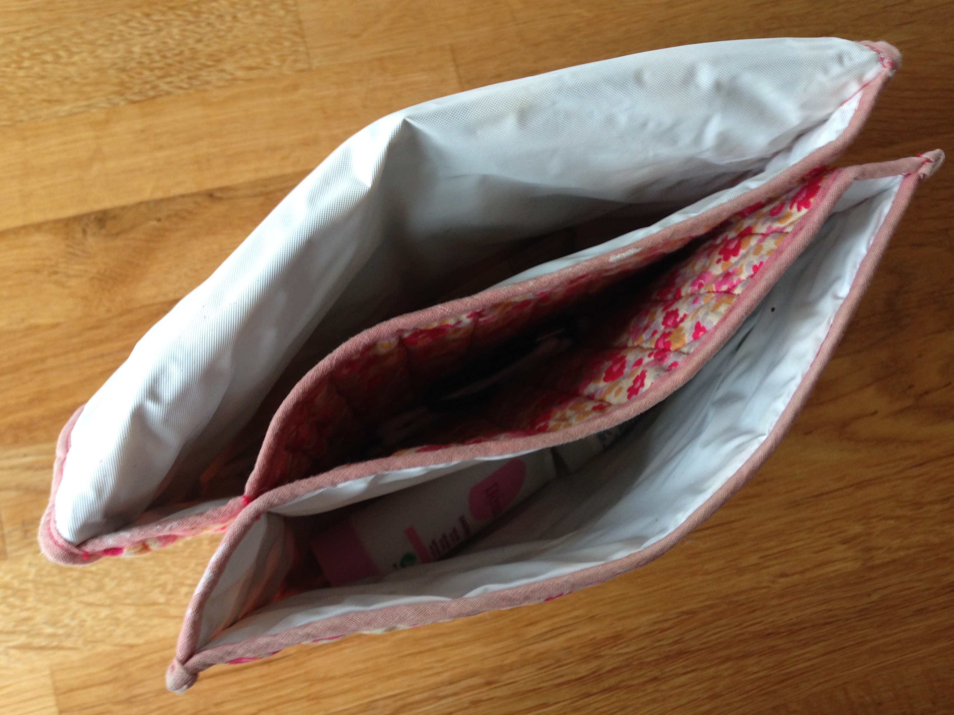 Tasken er opbygget som en harmonika, hvor to separate rum er syet sammen og tilsammen danner endnu et rum. På indersiden er den foret med plastik, så den kan tørres af, og så den ikke lækker med shampoo og lignende.