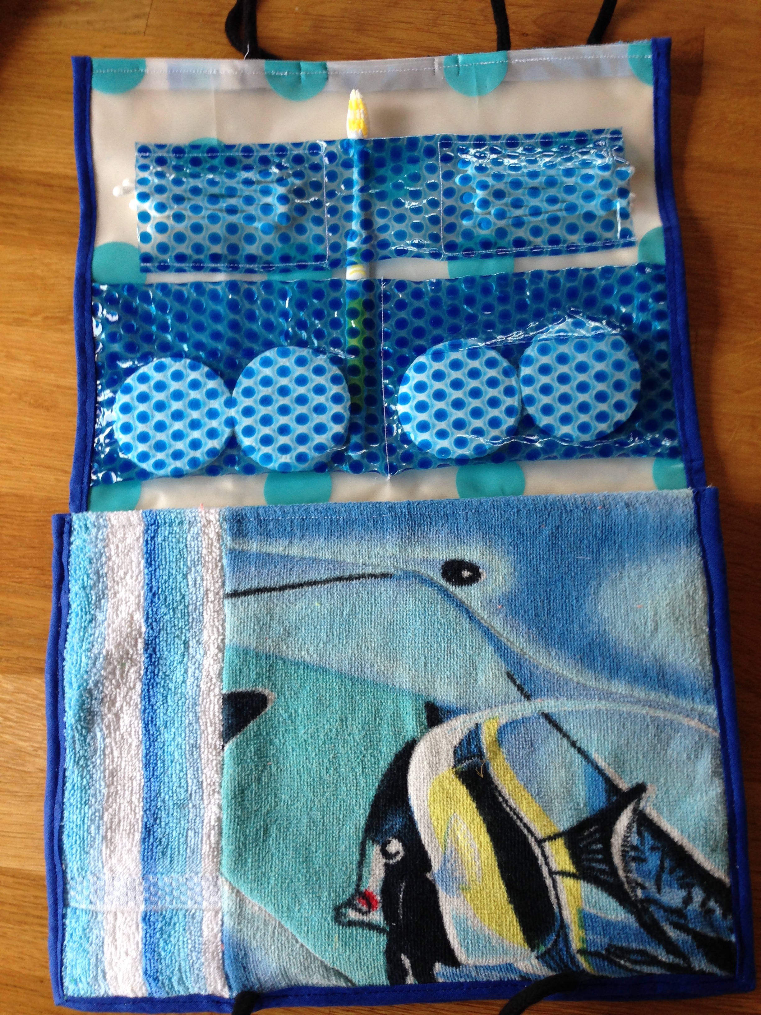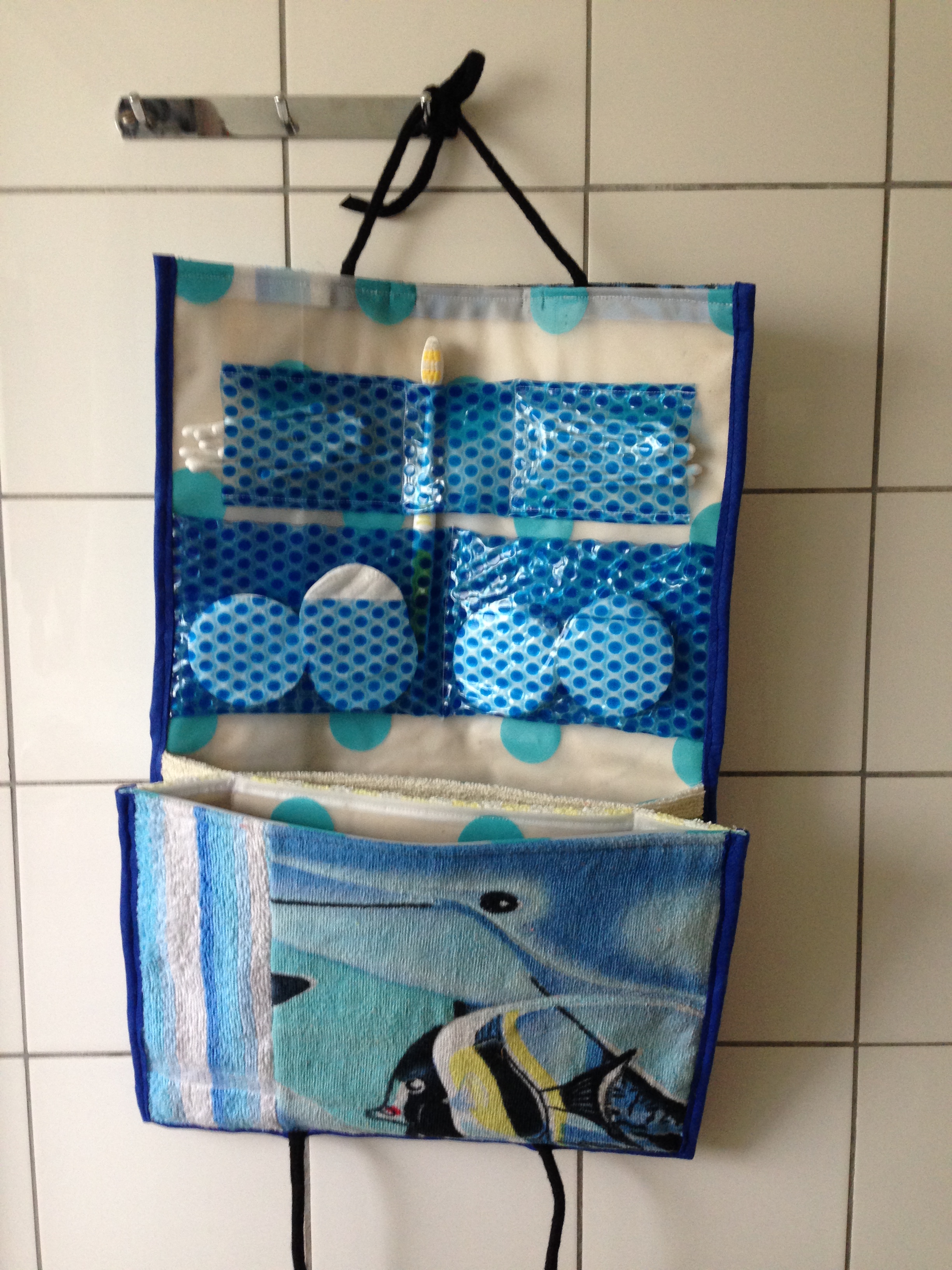 Toilettasken var meget svær at gå af med 😉 men min veninde blev helt vild glad for den! Og når nu jeg ikke selv skal beholde den, må glæden ved at give “værdiløse” materialer – håndklæder og badeforhæng nyt liv, bære lønnen i sig selv 🙂