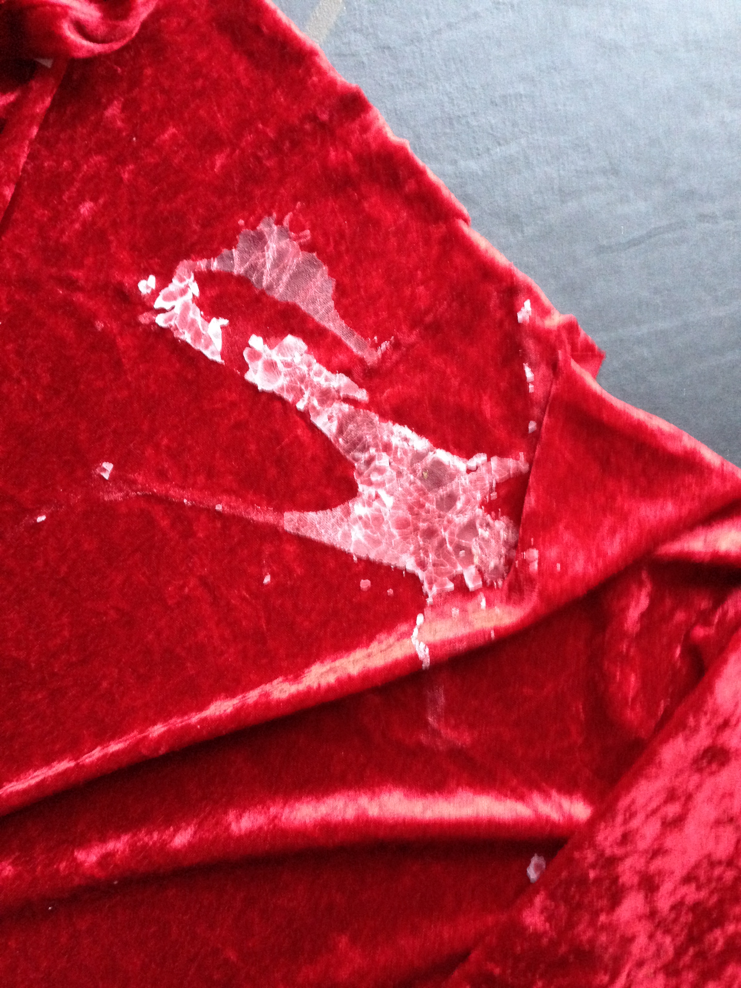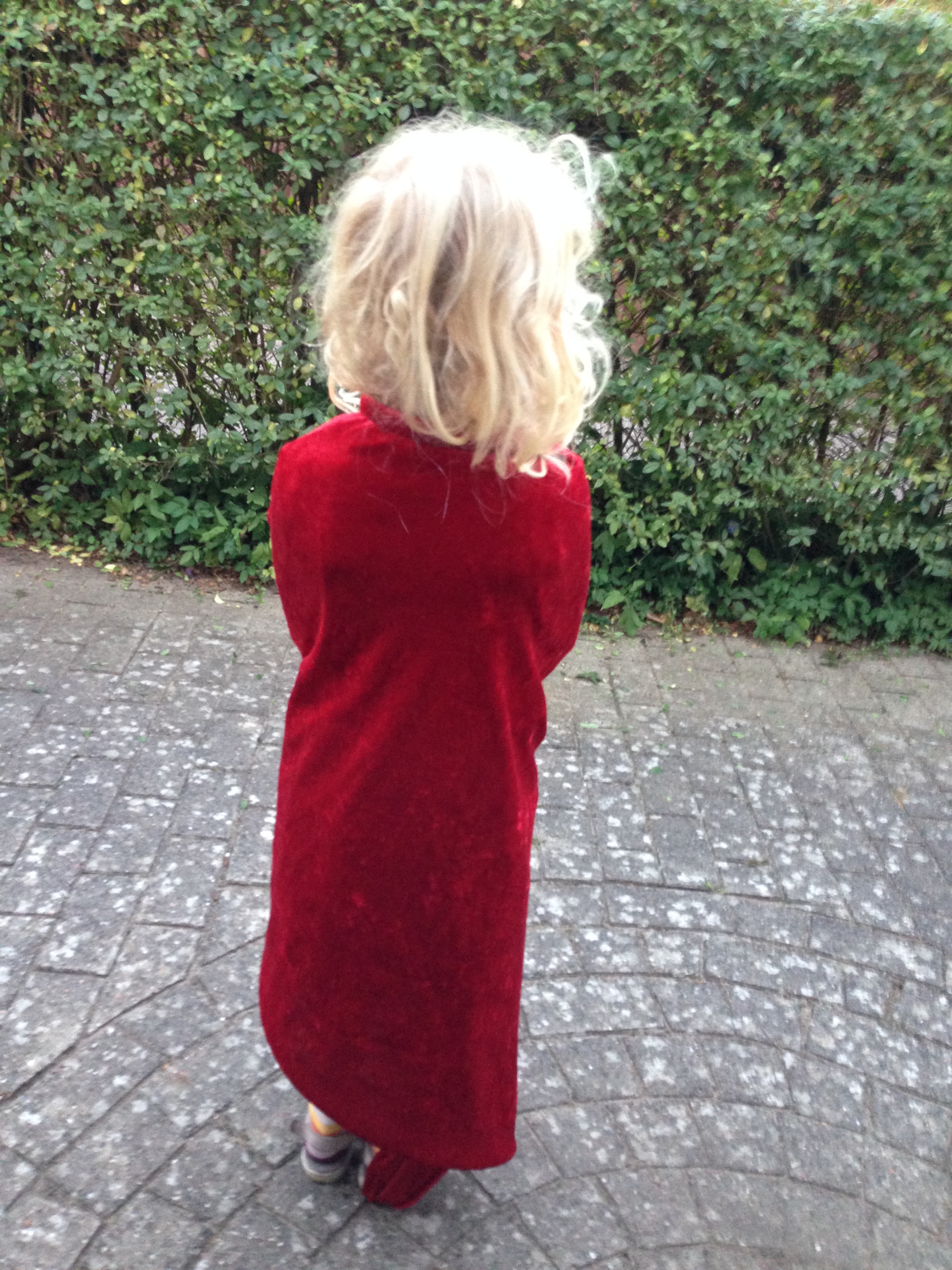 Den røde kappe her er lavet af farfars juledug, der blev kasseret på grund af en stearinplet. Pletten var placeret midt på dugen og der var derfor masser af stof uden pletter i hver ende af dugen til labre kapper.