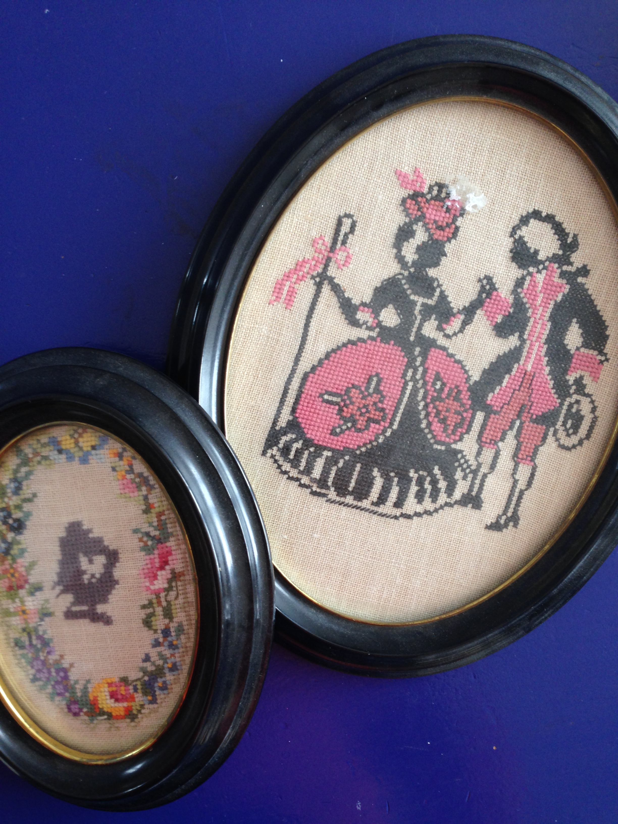 Det broderede stof med hofdamemotiv er fra en oval billedramme.