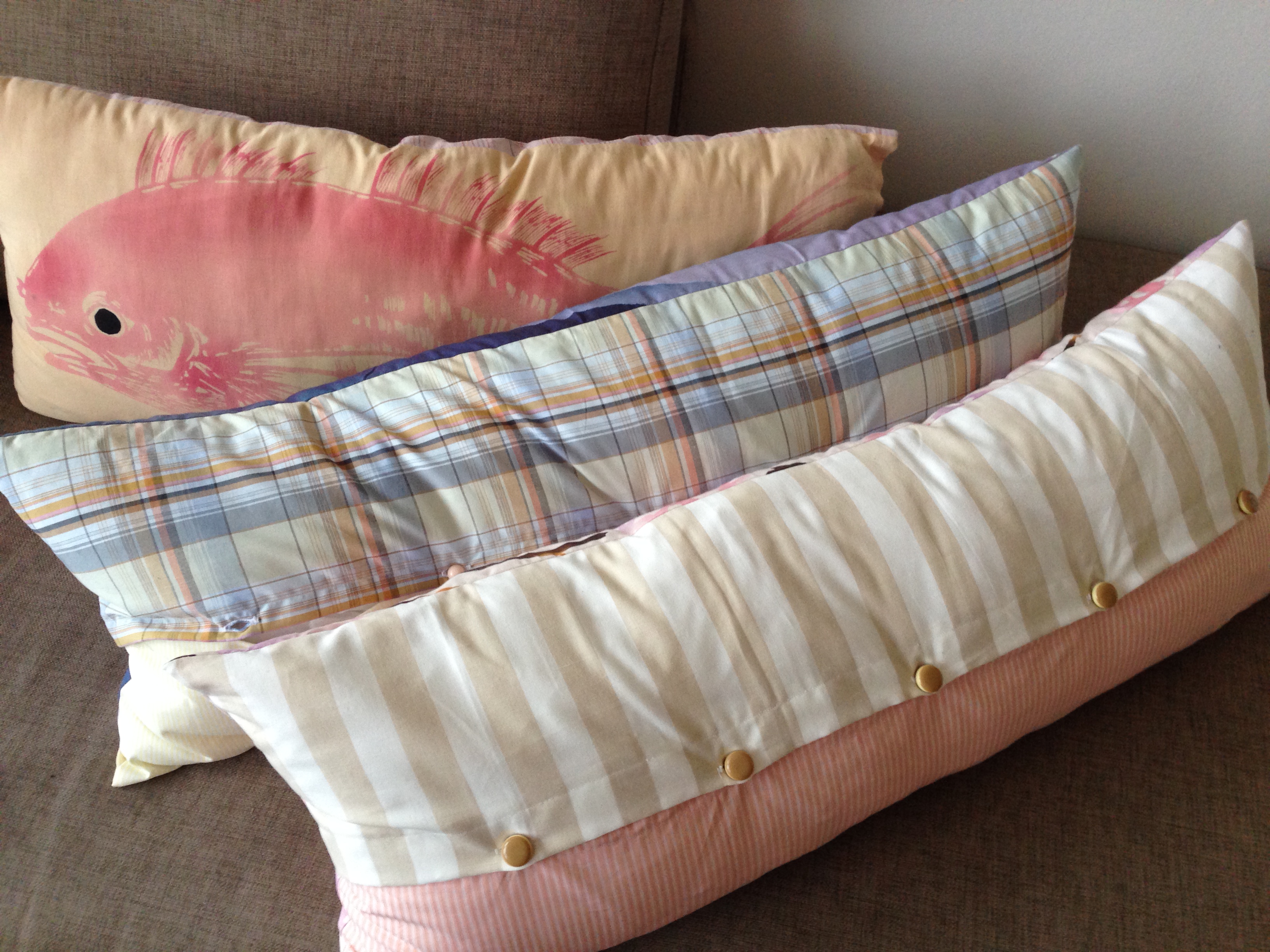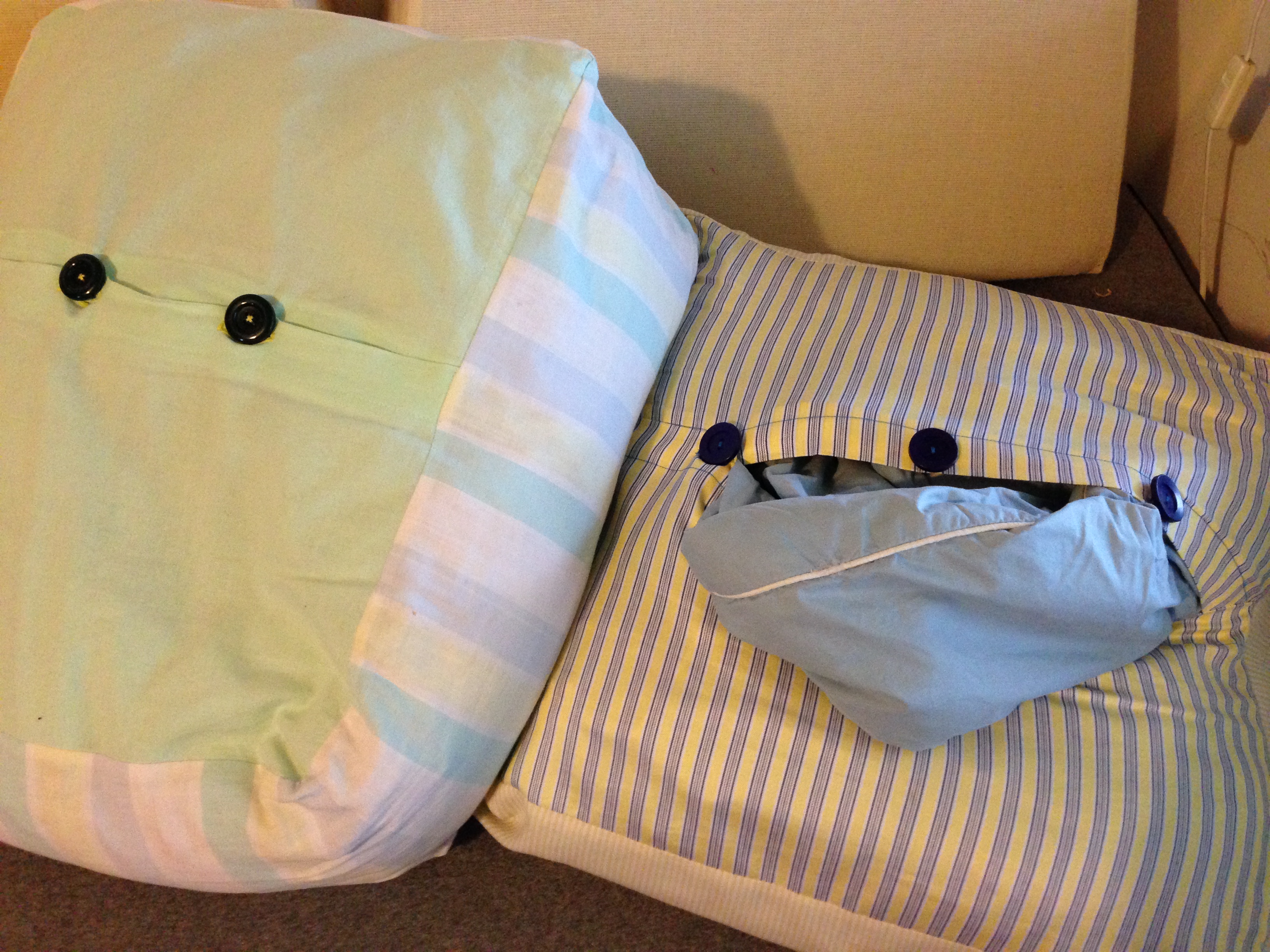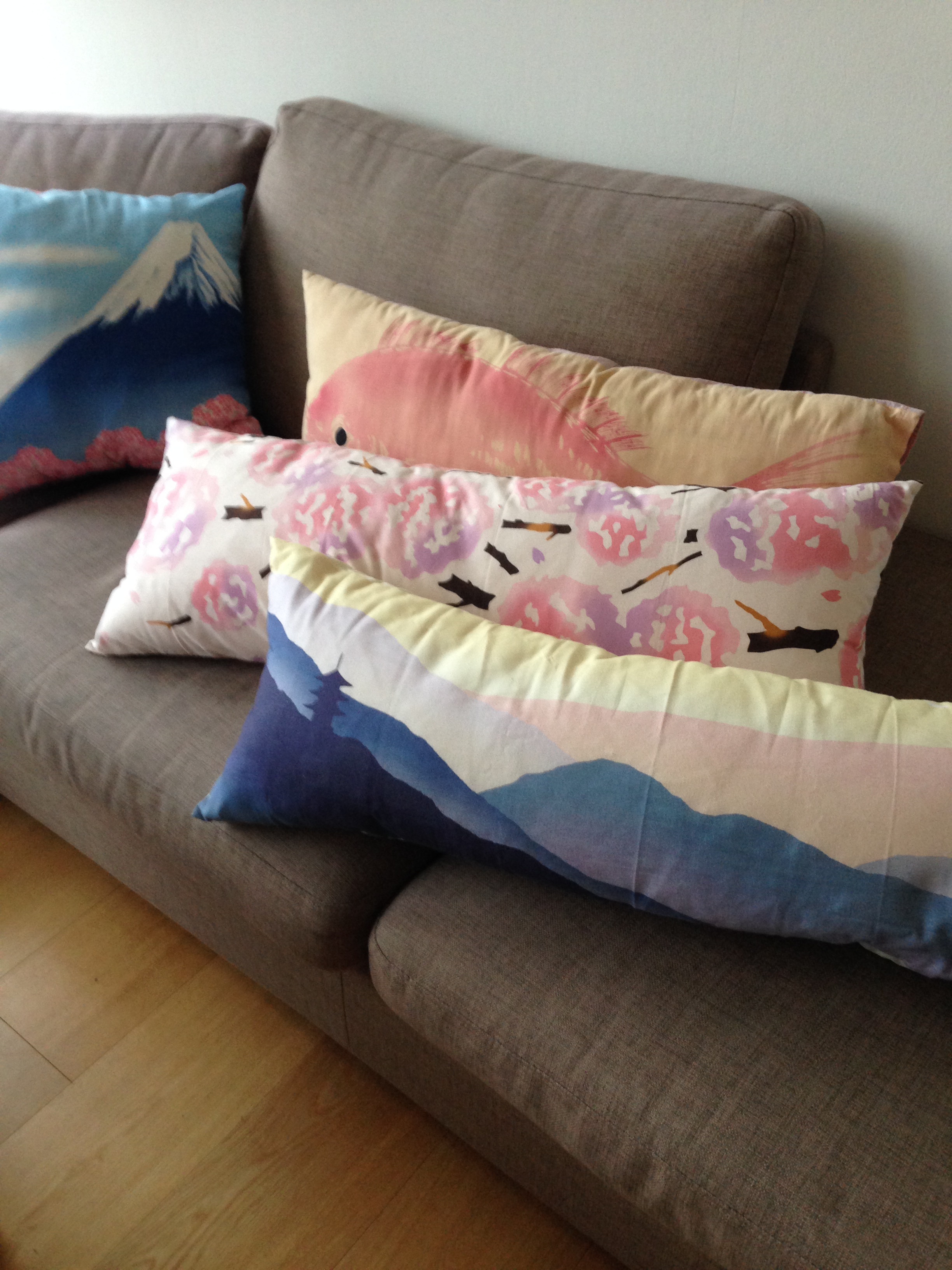 Puderne her er syet af stof, som jeg har taget med hjem fra Japan med forskellige tekstiltryk. Inden i er vores sommerdyner og en gammel hovedpude.