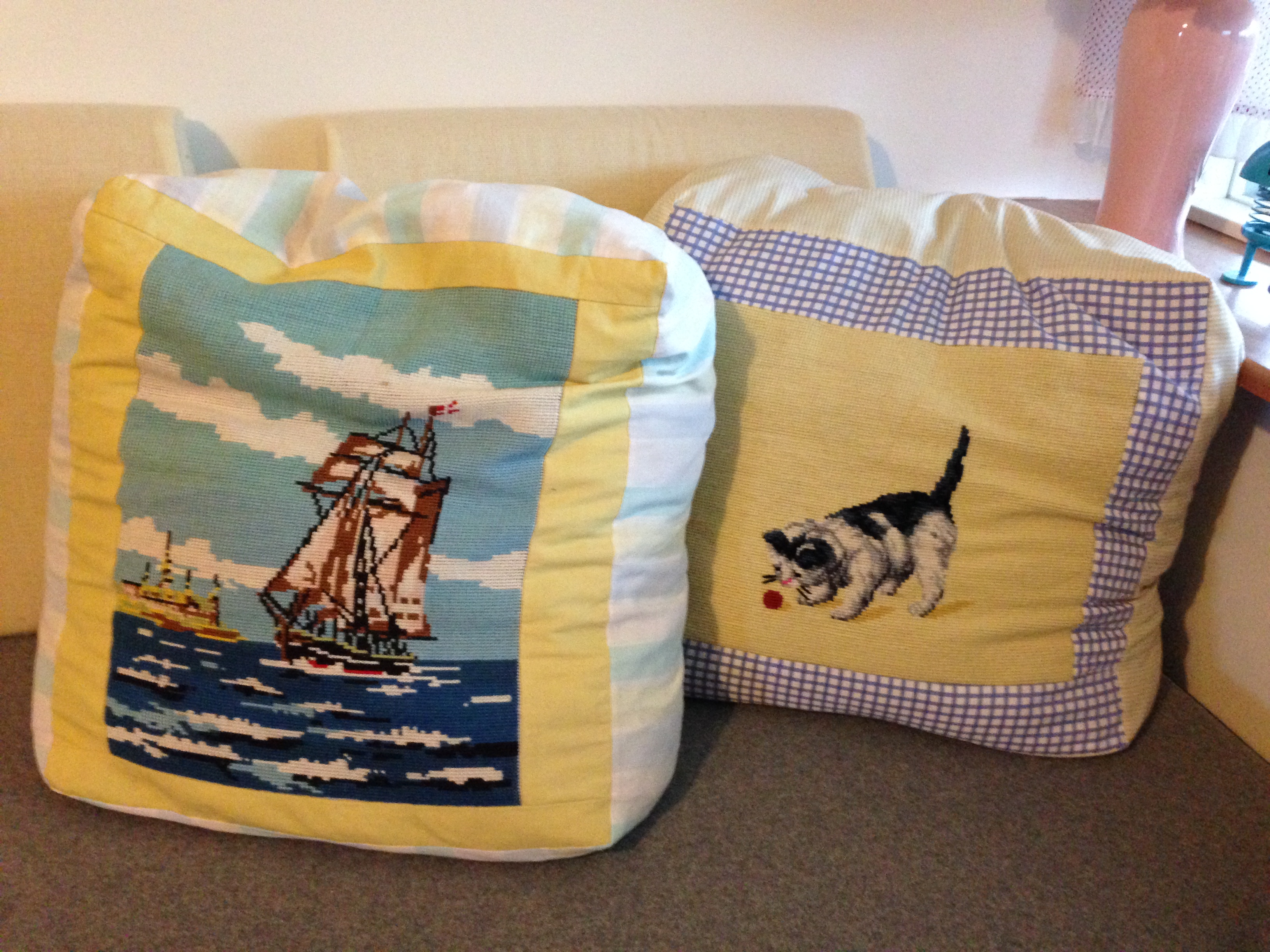 Her er puder fra børnenes værelse, også med dynefyld, og med genbrugt stramaj.