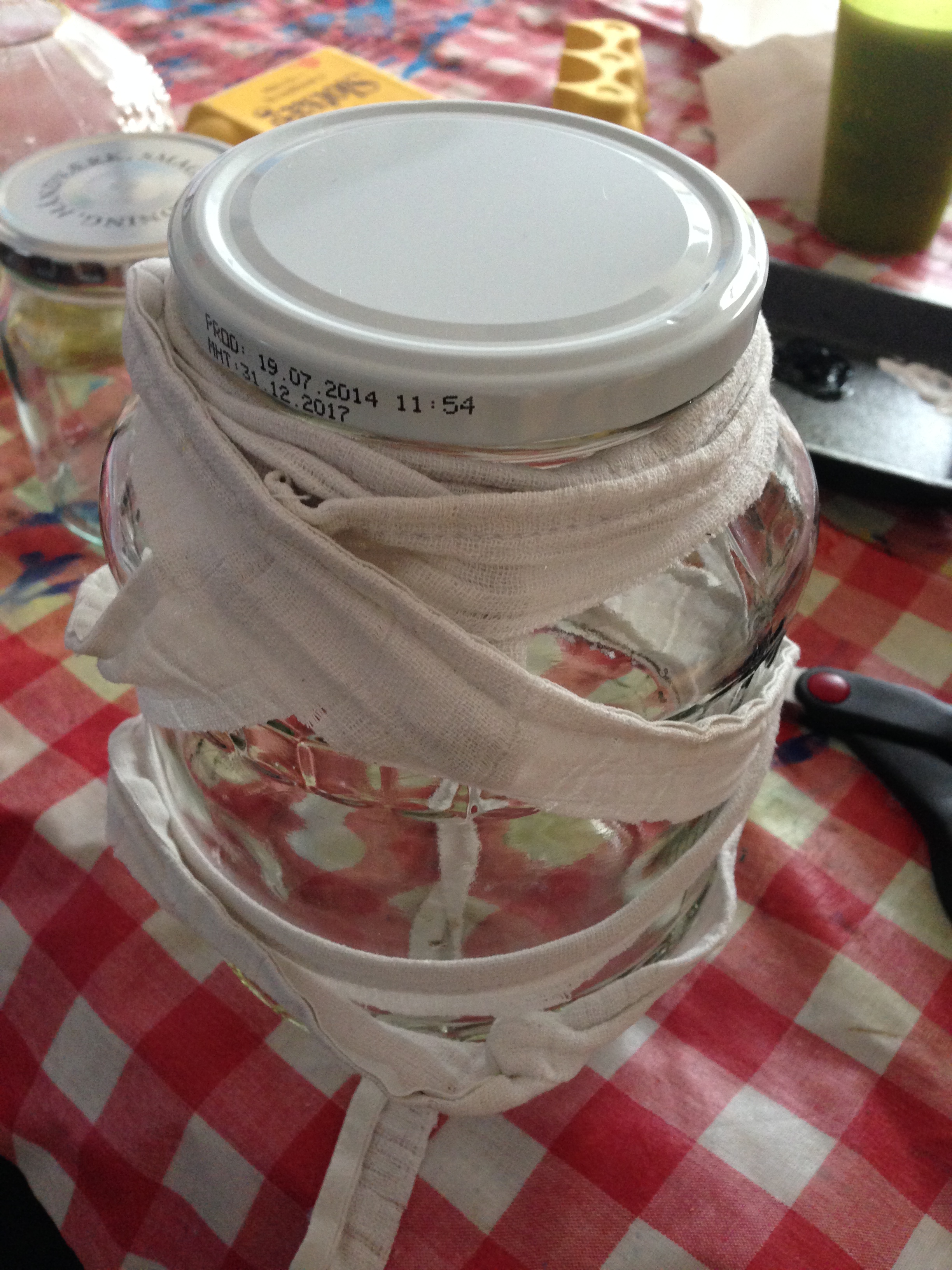 Jeg har fået ideen på pinterest.com. Og som du her kan se, er de lavet af emballageglas, der er viklet ind i stof.
