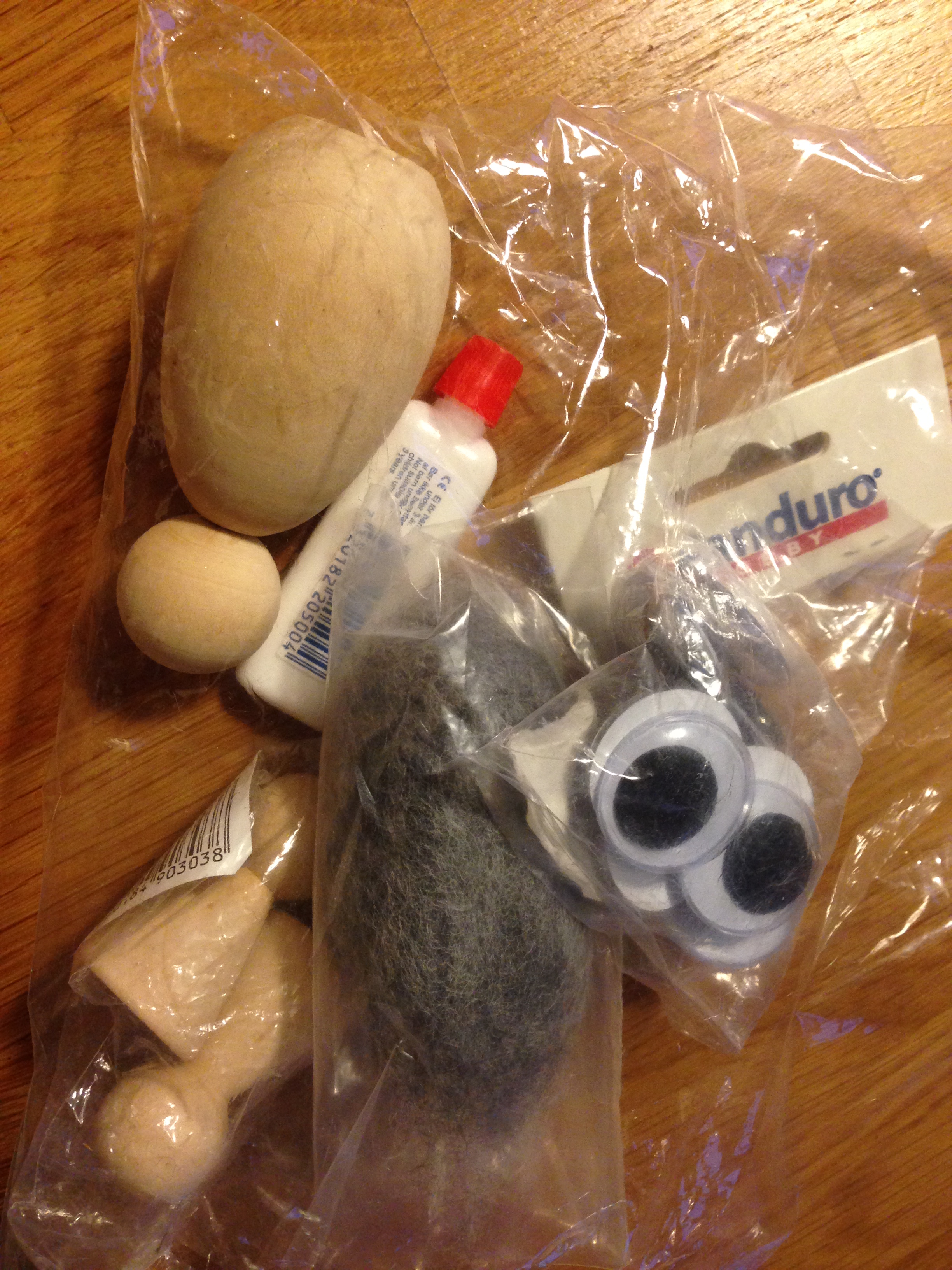 Munden er klippet af en stofrest, og så er der klistret plastik øjne på. Ja, nu tænker du sikkert, at jeg jo så alligevel har købt noget nyt, altså øjnene. Men næ næ, jeg fandt såmænd denne pakke med alt godt fra Panduro Hobby i en genbrugsforretning. Så nej, de er helt igennem genbrug – men stoføjne havde nu også været en fin løsning.