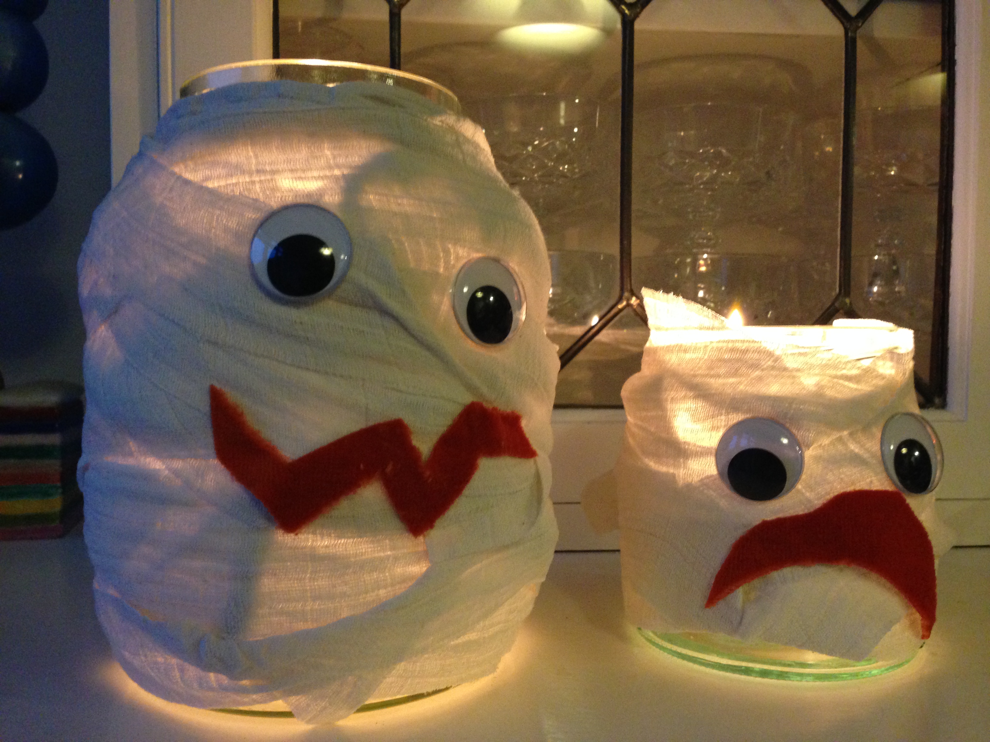 Jeg er også kommet med på Halloween-galajen, men gider altså ikke at bidrage til køb-og-smid-væk kulturen, der gør den ellers sjove tradition meget lidt bæredygtig! Og her kommer blandt andet de gamle babystofbleer ind i billedet – for hvad skal man bruge dem til, andet end som pudseklude? Ja det skulle lige være som bandager i et laset mumiekostume, som det kostume vi fik lavet til min svoger sidste Halloween. Jeg har et foto, men er ikke tarvelig nok til at poste det her. Derfor får I i stedet billeder af disse mumielygter, hvor brugte stofbleer også indgår.