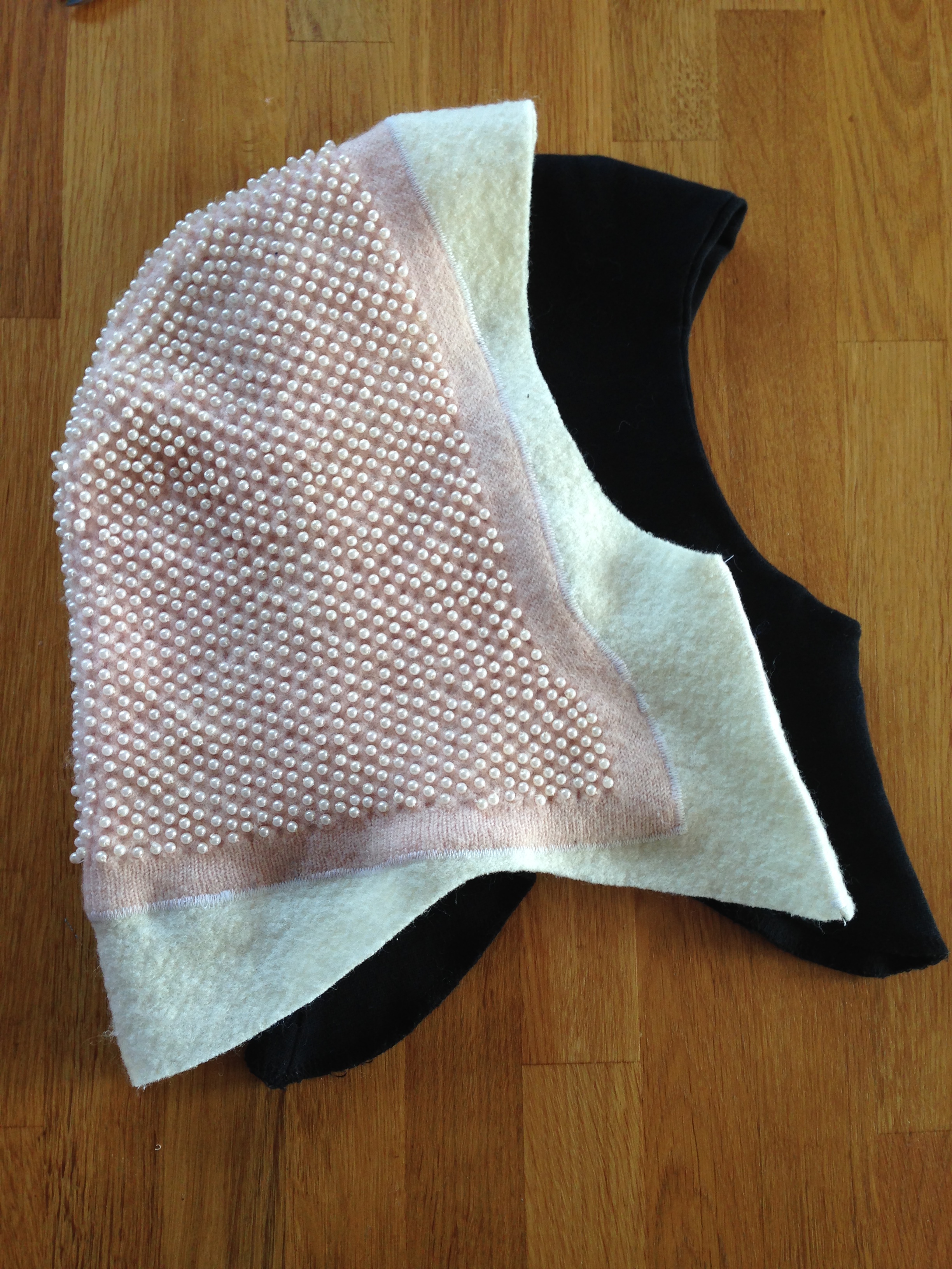 Huen var en kalendergave fra nissen sidste år, men den var desværre alt for lille til, at hun rigtig fik den brugt. Det skal der laves om på, så jeg har sat et ekstra stykke uldstof på (syet på med zig zag syning), så den nu passer hende. Som model har jeg brugt en elefanthue (den sorte), som vi havde i forvejen.