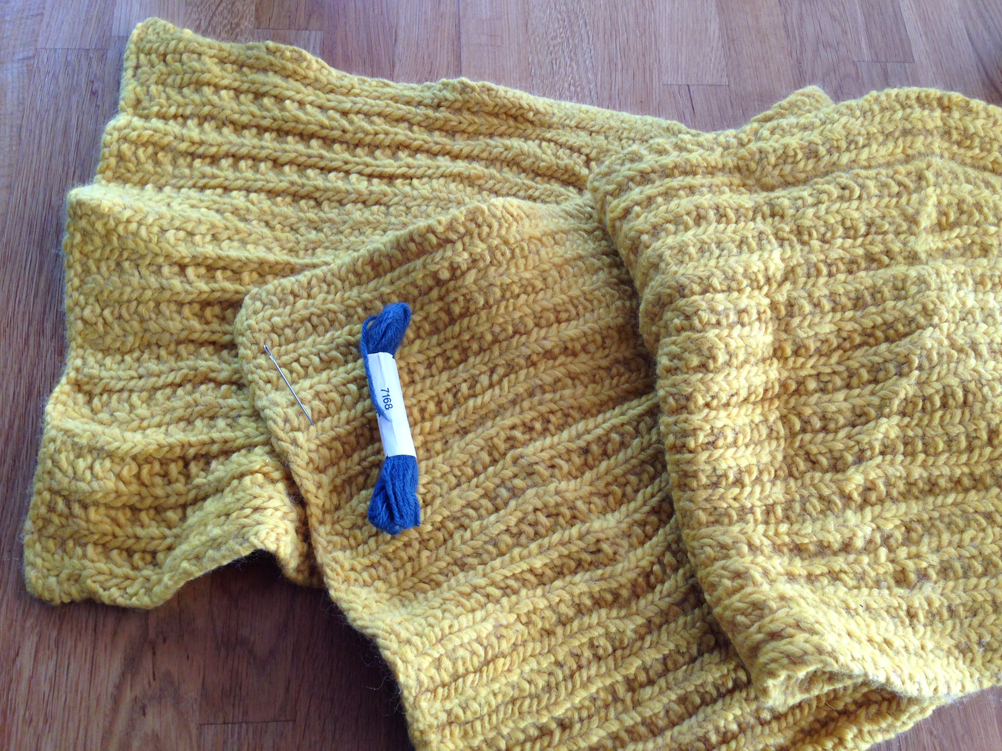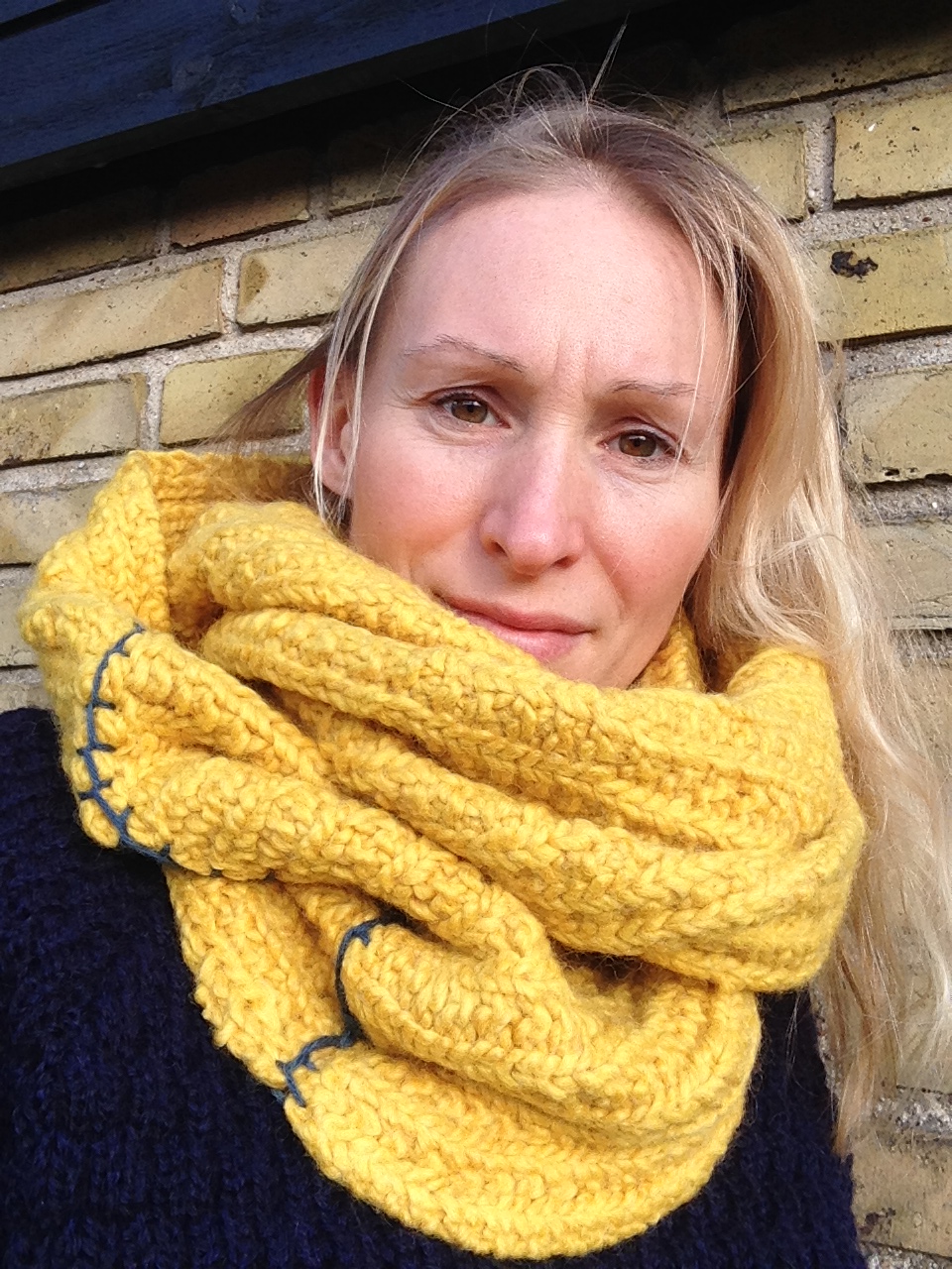 Tørklædet er syet sammen med en blå uldtråd, hvilket fungerer helt godt, når jeg selv skal sige det 😉