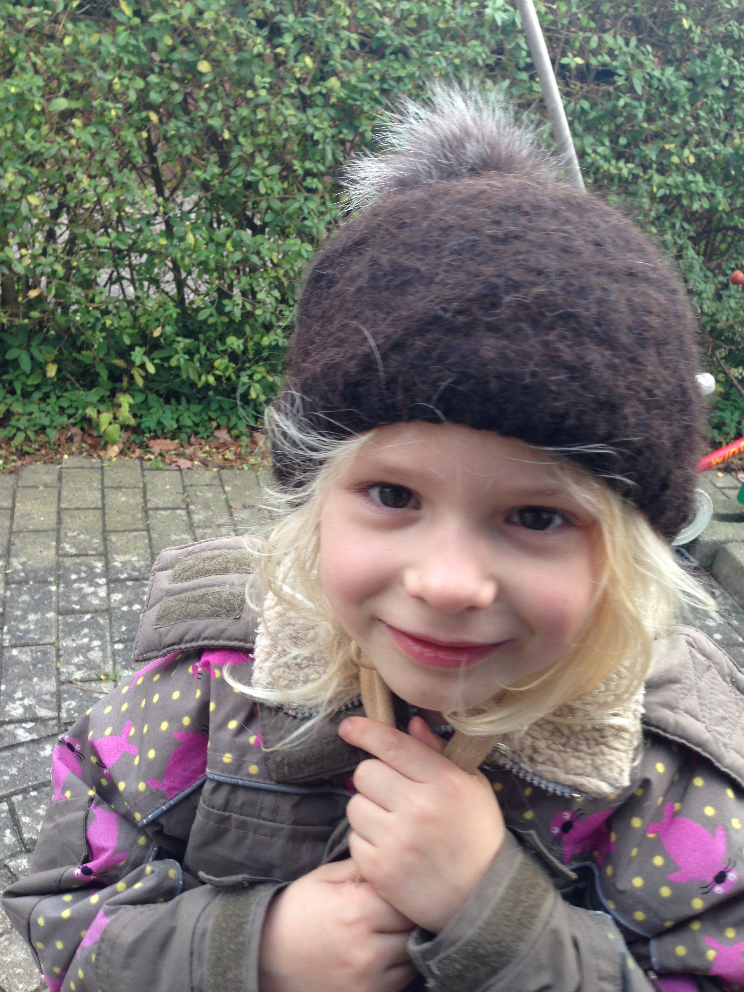 Min datter har også fået en anden hue, som er lidt mindre praktisk, da den ikke går ned og varmer om halsen. Det er denne brune uldhue, der er krympet i vask, men som passer hendes barnehoved perfekt. På denne hue har jeg også sat en pelskvast af en pelsrest, der er fundet i en genbrugsbutik. (Se hvordan du laver pelskvasten i mit tidligere indlæg her: https://mituendeligehjem.wordpress.com/2012/11/19/elefanthue-med-pelstop/)