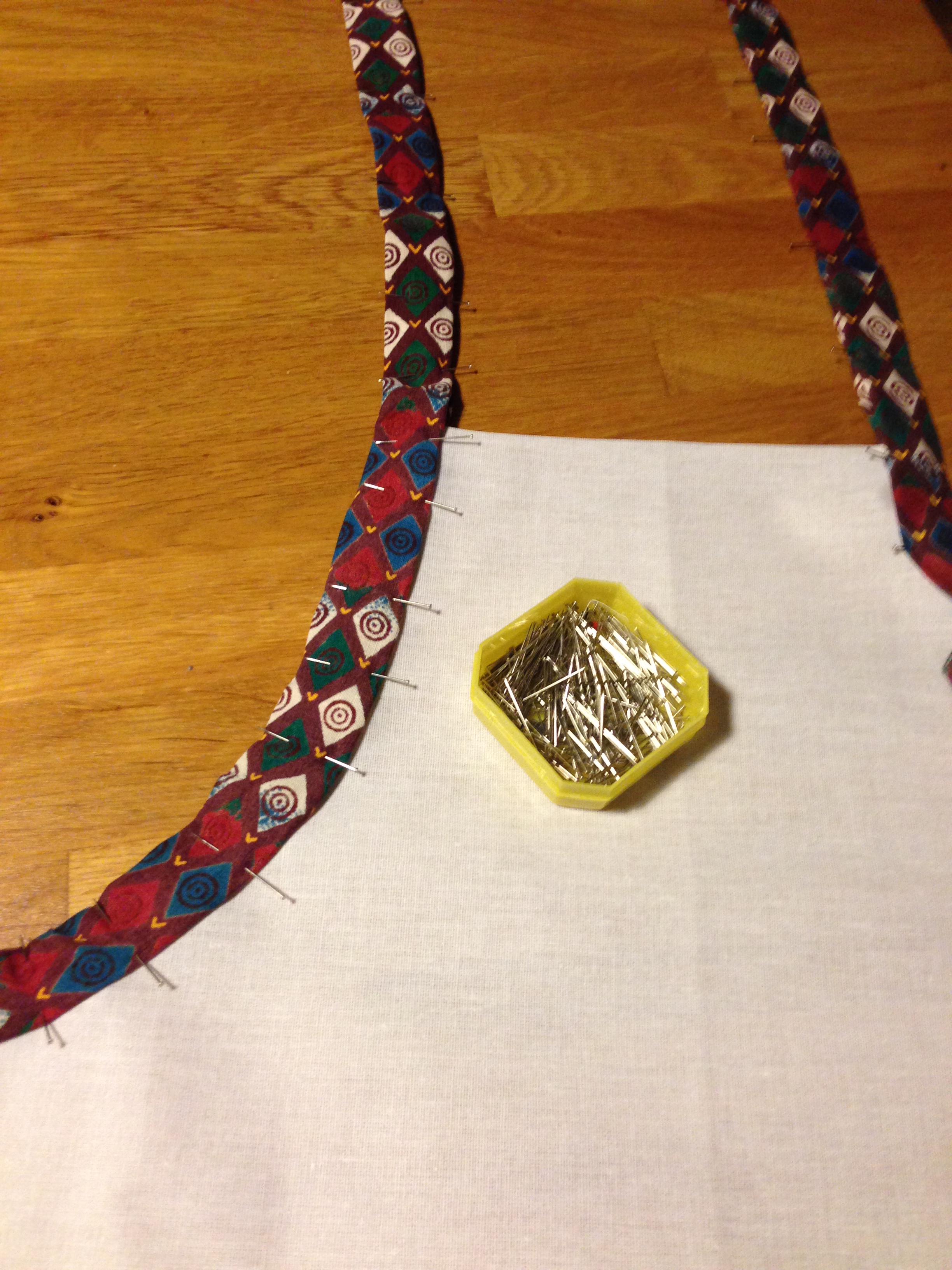 Til stropperne har jeg valgt noget spraglet stof, måske af afrikansk oprindelse, som er købt brugt, og som passer godt til de kreative udfoldelser.