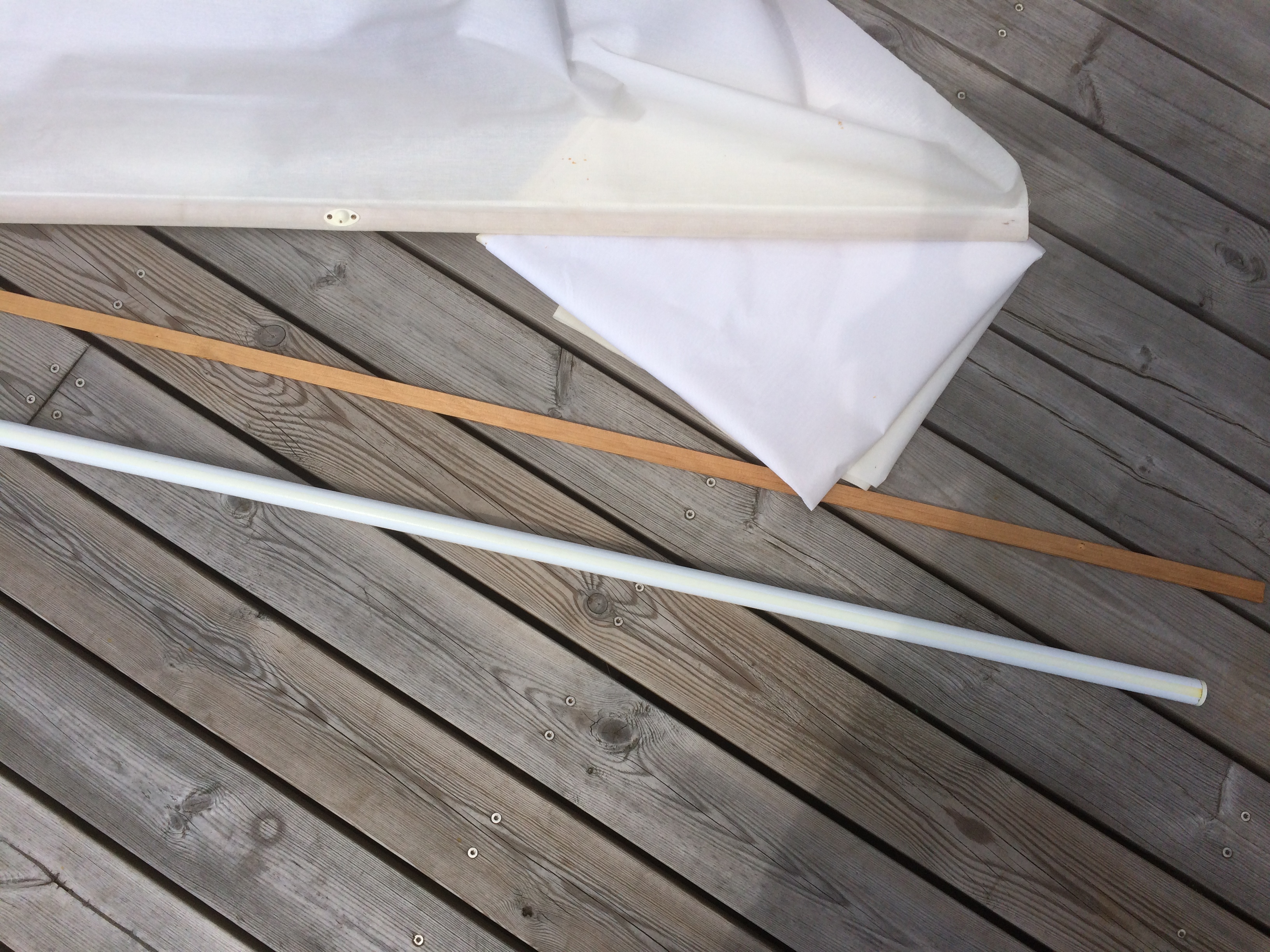 Da vi flyttede ind i vores hus kasserede vi en masse gamle rullegardiner, men da jeg ville stille dem ud til storskrald, kom jeg til at tænke på, at de jo indeholder flere gode materialer. Se her, både stænger i træ og metal samt stoffet fra rullegardinet, der minder meget om voksdug.