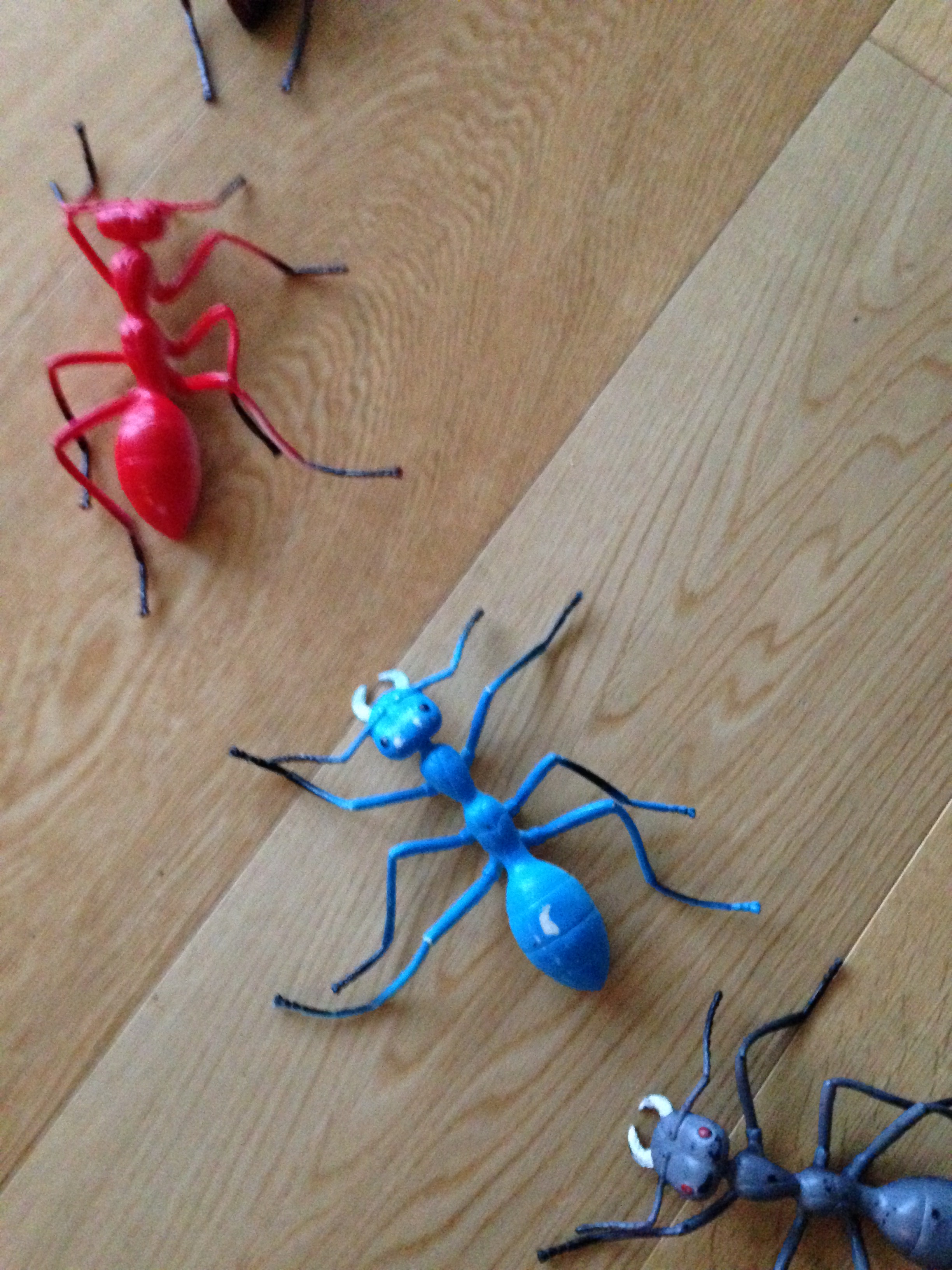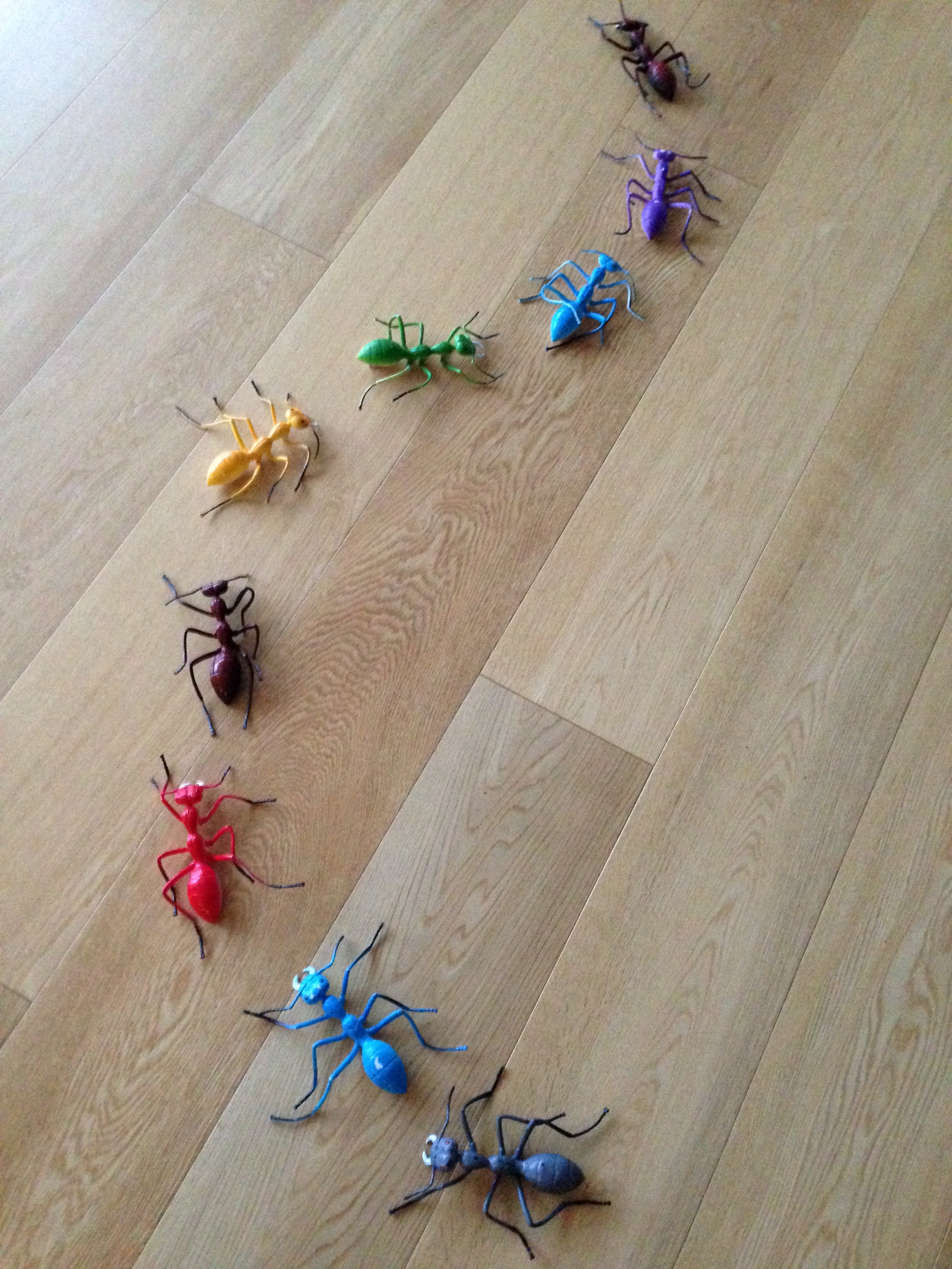 En masse store plastik myrer, som jeg tænker kan bruges til indretning af børneværelset. De kan f.eks. sættes fast på væggen eller sengen på række, som vist på billedet, eller bruges som magneter på en tavle eller køleskabet. Det dekorativt gode ved dem er, at der er store (en damehånds længde), mange og ens.