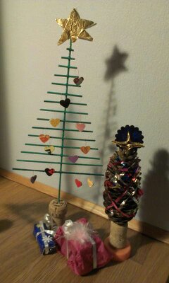 Her er en idé til julepynt – mini juletræer. Jeg lavede dem sidste år af en korkprop og pinde fra en bordskåner (kunne i stedet have være fra et rullegardin af pinde eller af mikadopinde). Pindene er klippet i størrelser og limet på den bærende pind med limpistol. Træet er pyntet med miniature hjerter udstandset i emballagepap. Se hvordan i mit blogindlæg om til og fra kort fra sidste december: https://mituendeligehjem.wordpress.com/2013/12/08/til-og-fra-kort-i-papemballage/