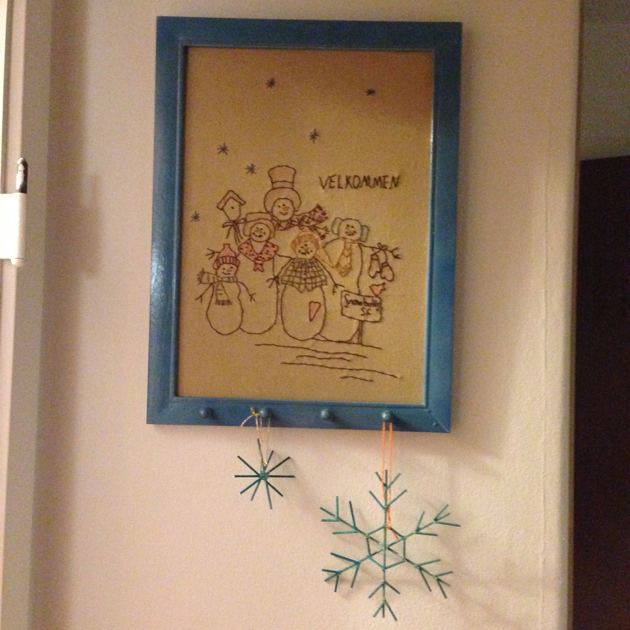 Samme pinde kan også bruges til at lave formationer af iskrystaller. Det broderede billed er forresten et af mine nyeste genbrugsfund – med snemænd – og rammen har fået lidt blå maling.